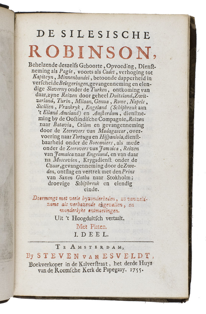 De Silesische Robinson, behelzende deszelfs geboorte, opvoeding ... minnenhandel, betoonde dapperheid in verscheide belegeringen, gevangenneming en elendige slaverny onder de Turken ... zyne reizen ... dienstneming by de Oostindische Compagnie ... dienstbaarheid onder de Boecaniers ... droevige schipbreuk en elendig einde