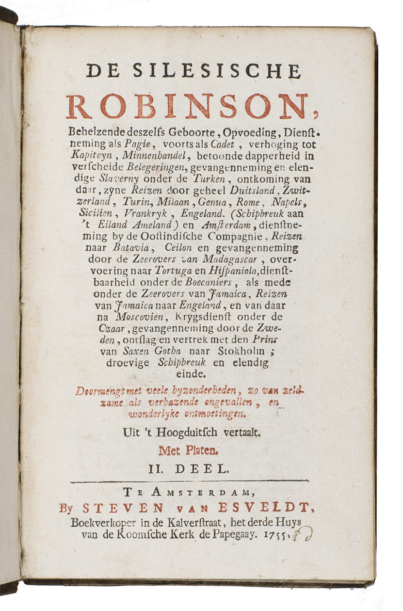 The Silesische Robinson is a very rare Dutch translation of Christian Stieffs Schlesischer Robinson Oder Frantz Anton Wentzels v. C. eines schlesischen Edelmanns Denkwürdiges Leben, first published in Breslau and Leipzig in 1723/24, one of the first pseudo Robinson works in the German language. In his preface, the author Christian Stieff (1675-1751) sets about to provide the story of an exemplary life worth emulating to the noble youth that he imagined would read his work. It tells the story of Frantzs journey from his Silesian home through Germany, Italy, the Netherlands, the Cape of Good Hope, East India, his capture and subsequent transport to Haiti as prisoner. Luckily he manages to regain his freedom and subsequently serves as seaman on board a pirate ship and journeys to England and Russia. As fantastic as the storyline sounds, Stieff managed to add plenty of details of contemporary social life and even political policy in Europe, such as the measures taken against the spread of of the plague in Vienna. Stieff was a respected school rector and poet from Breslau.