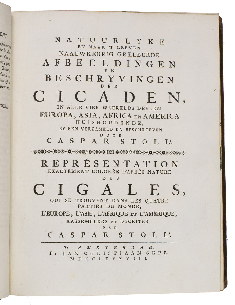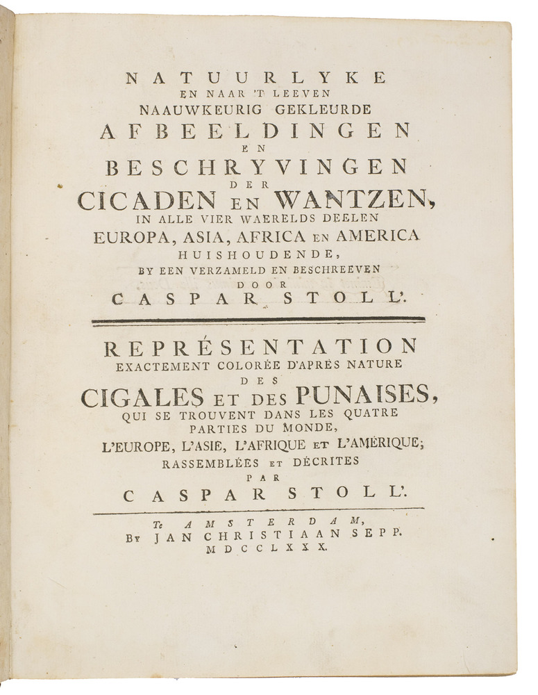 (1) STOLL, Caspar. Natuurlyke en naar 't leeven naauwkeurig gekleurde afbeeldingen en beschryvingen der cicaden.