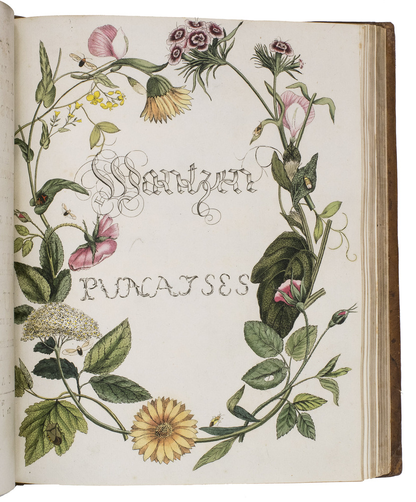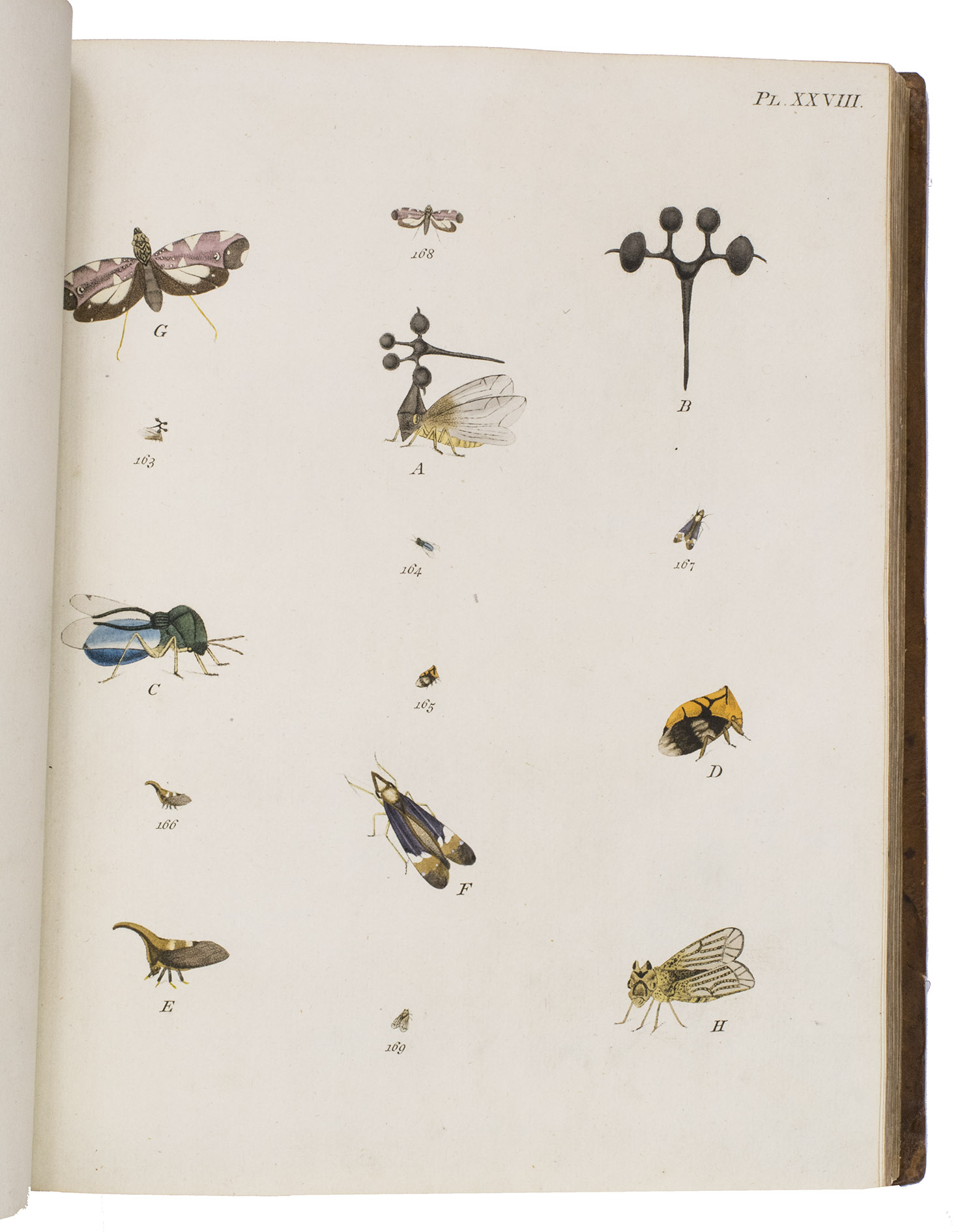 Amsterdam, J. C. Sepp, 1788. 2 parts in 1 volume. 4to (ca. 28.5 x 23 cm). With 70 hand-coloured plates of insects, and a hand-coloured floral frontispiece at the start of each part. Contemporary gold-tooled brown calf. 124; 172 pp.
