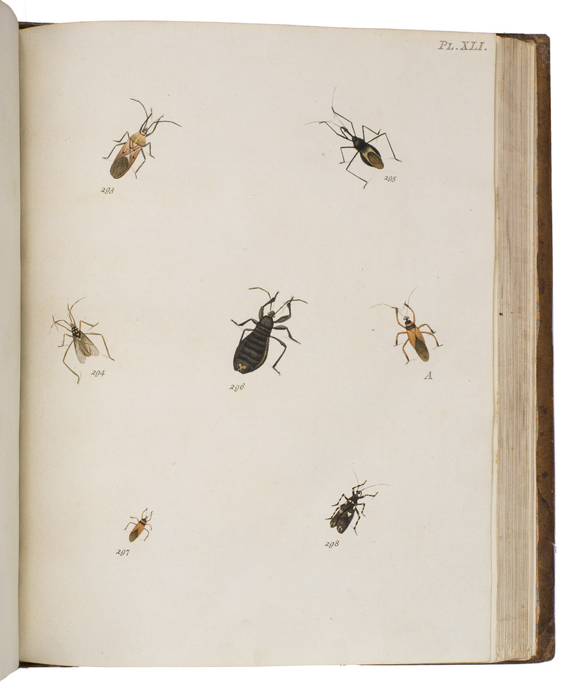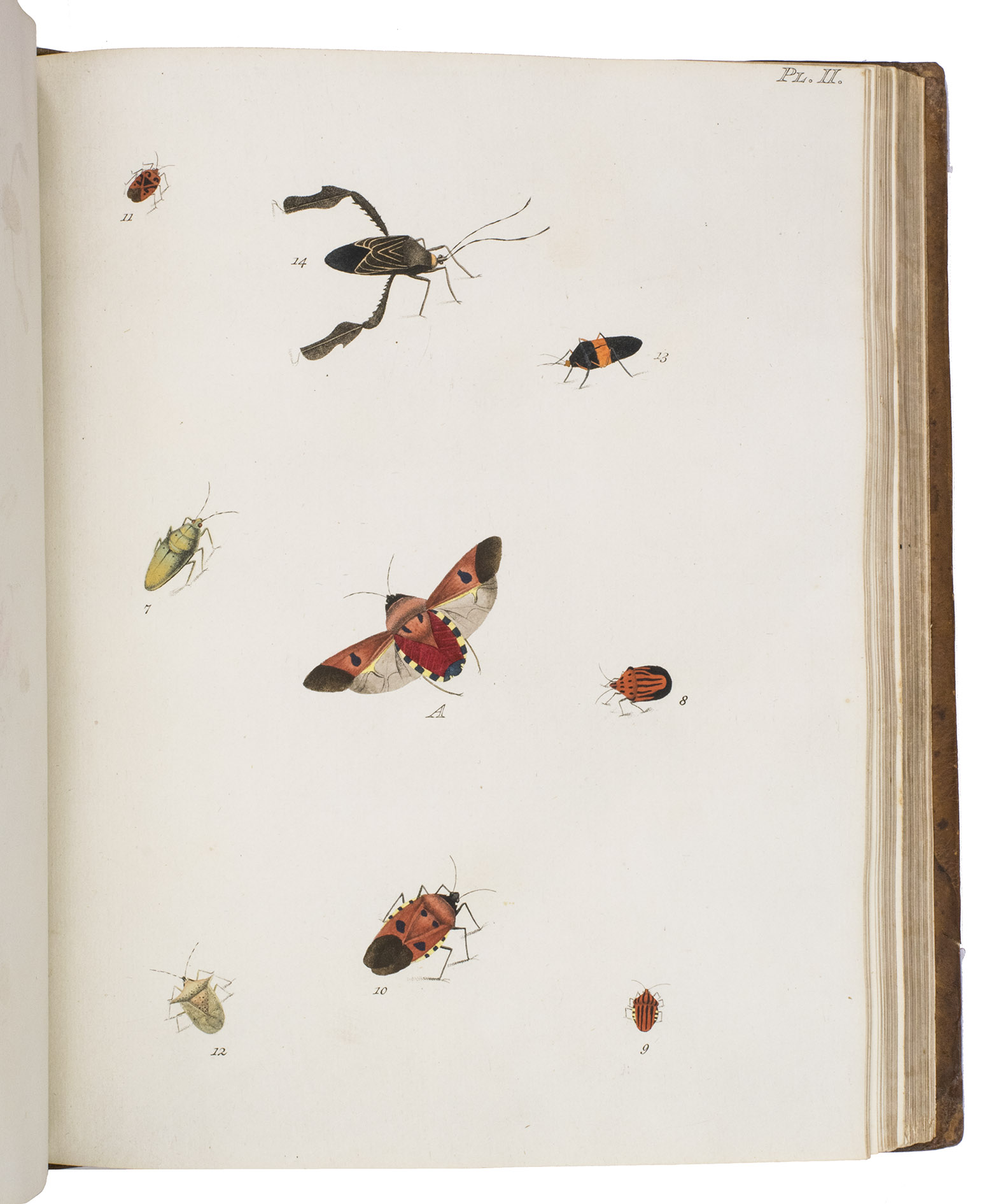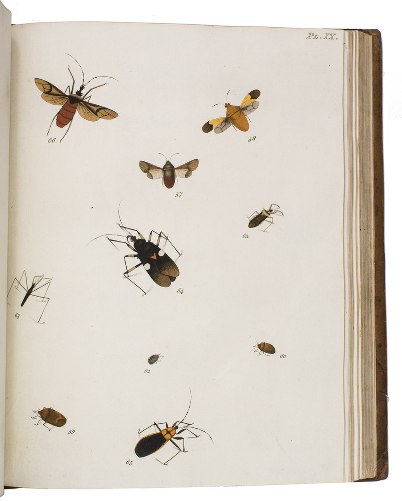 First edition of a beautiful, complete set of an important scientific work on insects, with 70 contemporary hand-coloured plates. It describes the Cicadidea and Heteroptera found in all parts of the world, especially in Suriname, Indonesia, South Africa and the Coromandel coast. It is the first serious scientific work ever published on insects of the order of Hemiptera. The illustrations, which show more than 450 insects in great detail, form the main part of the work and are accompanied by descriptions in Dutch and French.