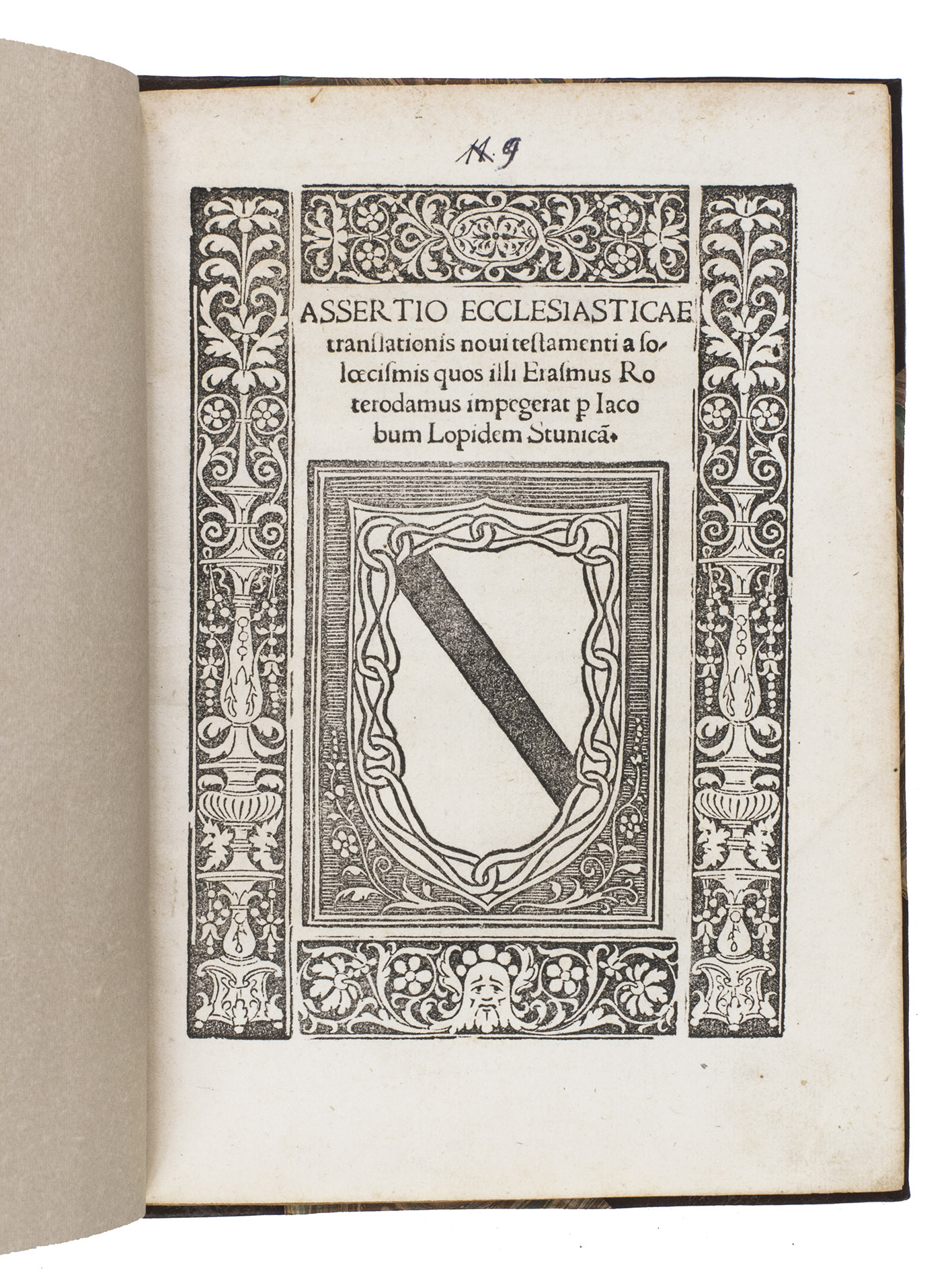 (Colophon:) Rome, Marcello Silber, 1524. 4to. With Stunicas (House of Zúñiga) large woodcut coat of arms on the title page set together with the title within a woodcut decorated frame, and 1 woodcut decorated initial. Modern half calf, half marbled. [21], [1 blank] ll.
