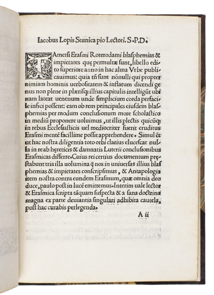 The binding is slightly rubbed and/or stained. Otherwise in very good condition. Censimento nazionale delle edizioni italiane del XVI secolo, 56424; Chaparro Gómez, "Erasmo de Rotterdam y Diego López de Zúñiga: una polémica áspera y prolongada", Ágora. Estudos Clássicos em Debate 16 (2014) pp. 157-187; OPAC SBN, IT\ICCU\CNCE\056424 (2 copies); USTC 838606, (2 copies, same as OPAC SBN).