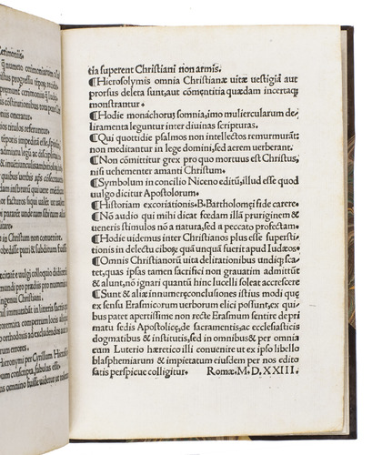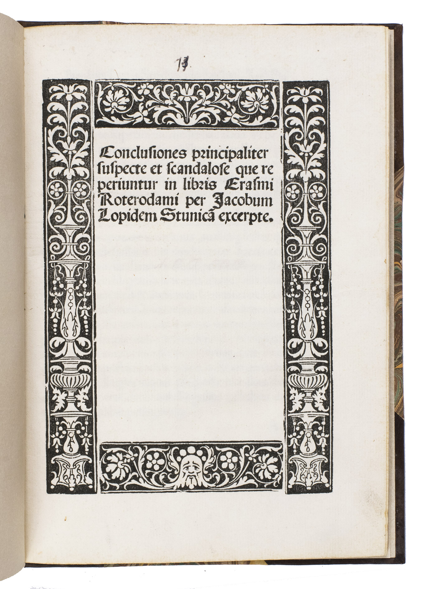 First edition of the pamphlet Conclusiones principaliter suspectae et scandalosae quae reperiuntur in libris Erasmi Roterodami, a sharp attack accusing Erasmus of heresy.Published in Rome in 1523 and circulated subversively during the interregnum after Pope Adrian VIs death, the work listed forty-two theological positions drawn from Erasmuss writings. Stunica presented each as suspect or outright scandalous, implying a dangerous alignment with Lutheran heresy.