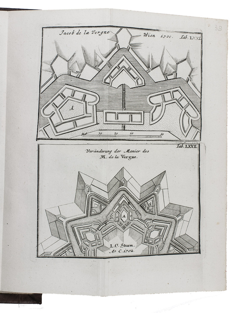 Second edition of a work on military architecture by the German architect and theologian Leonhard Christoph Sturm (1669-1719), "the foremost German architectural theorist of the early 18th century" (Neville). It is written in the form of a dialogue between an engineer and a youth, and divided into "conversations" instead of chapters. They talk about several well-known military engineers and their methods of fortification, including Errard de Bar le Duc, Blondel, Coehoorn, Vauban and many others. The young man poses brief questions and the engineer gives extensive answers, commenting on the advantages and disadvantages of different defence methods. The conversations are clarified in the illustrations, which depict many types of fortifications, often giving details and profiles.