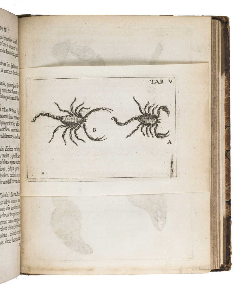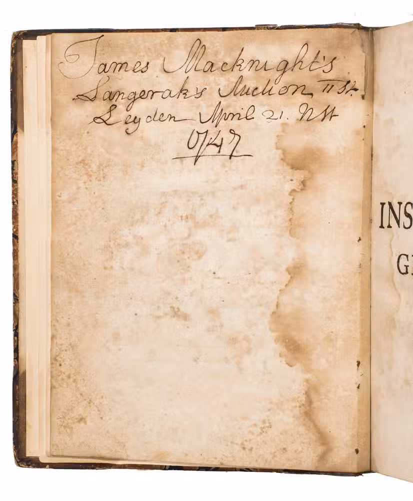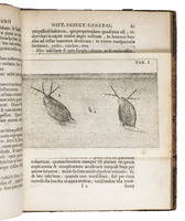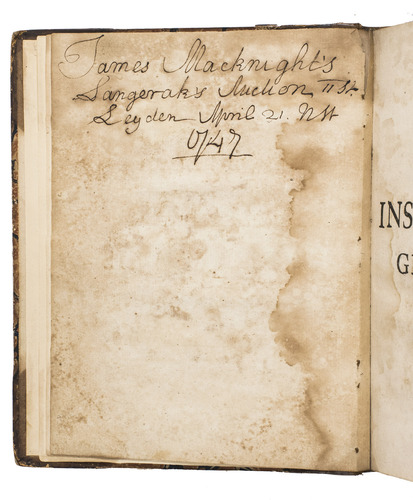 With a large printed book plate mounted on the front pastedown, an interesting early auction inscription on the verso of the otherwise blank original flyleaf: "James Macknight's Langerak's auctien 11 st. Leyden April 21 [nst?] 1747", possibly referring to Scottish minister and theological author James MacKnight (1721-1800), and some annotations in pencil in the text. The binding shows signs of wear and the spine has been re-backed, a small tear along the top of the gutter of the original flyleaf, the first few pages heavily browned and foxed, some occasional slight dampstains and foxing, but with the plates still very clear. Otherwise in good condition. BMC NH, p. 2055; Hagen II, p. 209; Horn & Schenkling 21795; Nissen, ZBI 4053; STCN 238102033 (7 copies, incl. 2 incomplete); for the author: DSB XIII, pp. 168-175.