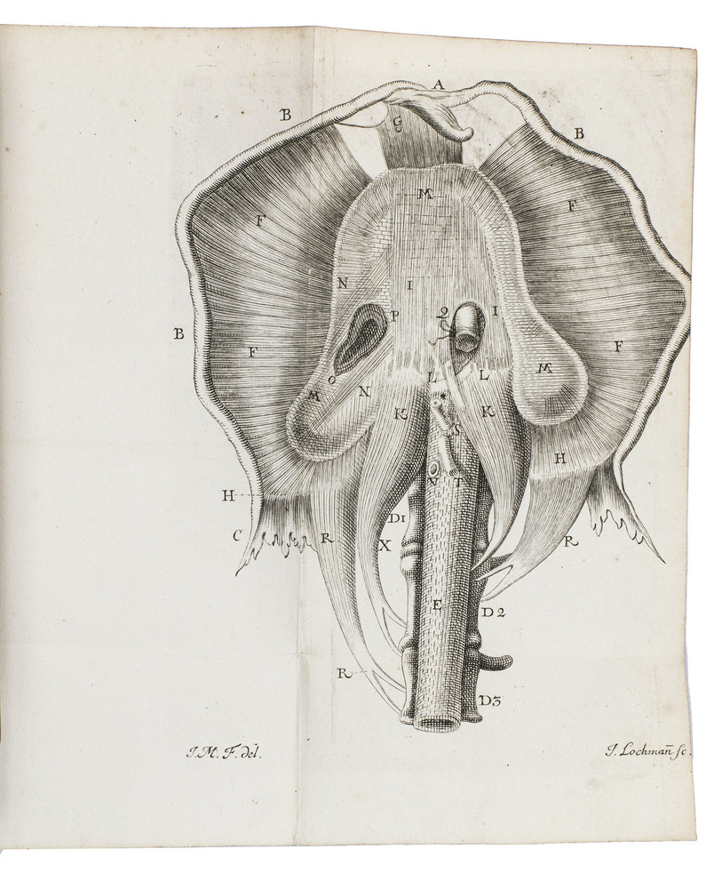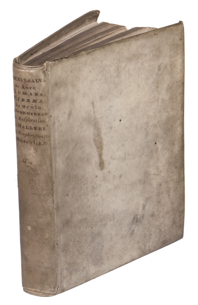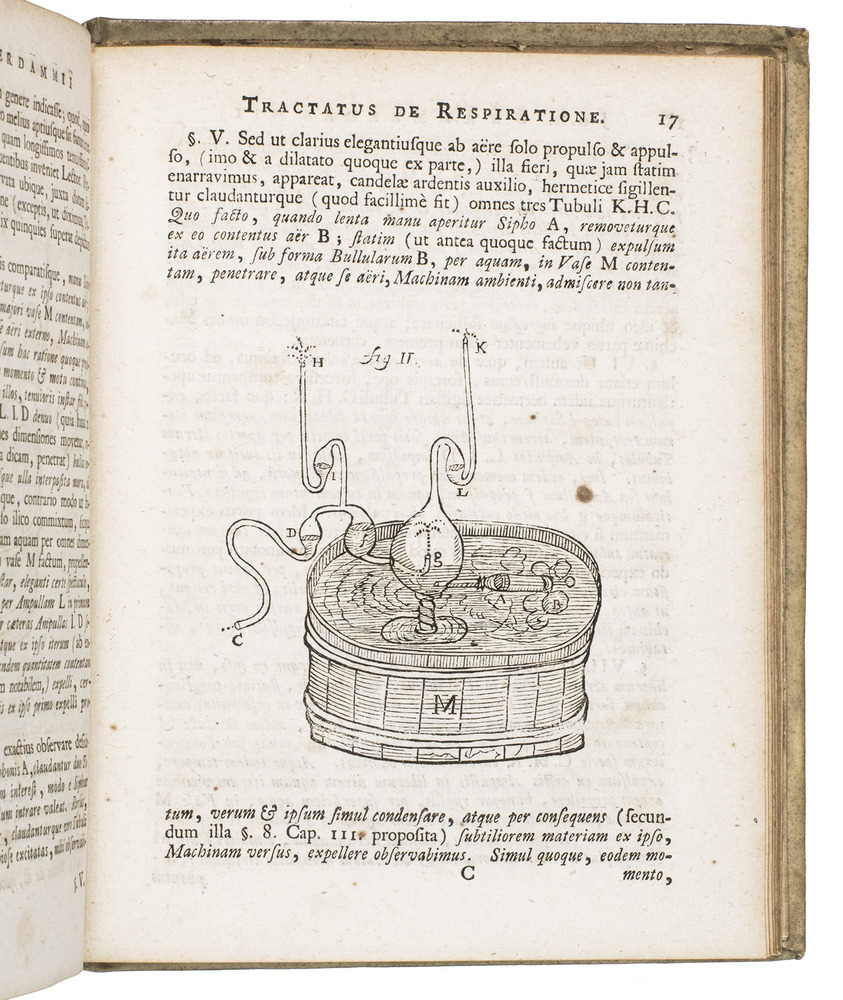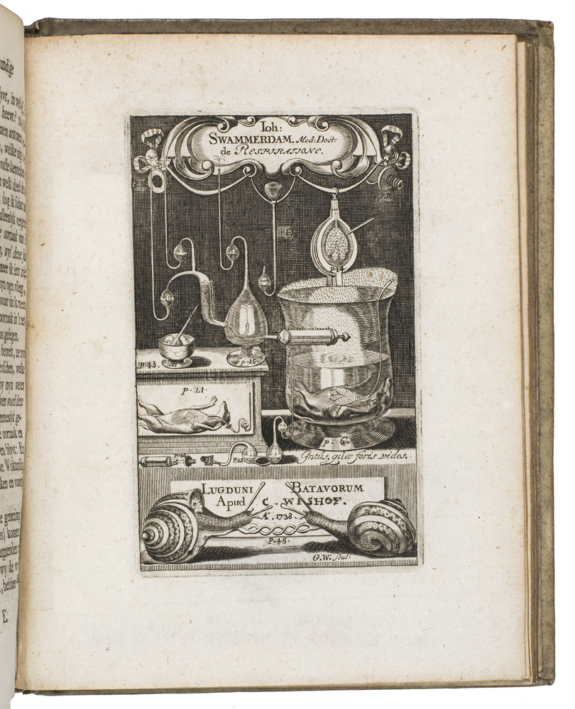 Leyden, Conrad Wishoff, 1738. 4to. With engraved title by G.W. with device for the study of respiration, 7 woodcuts in text, folding engraved plate by J. Lochmann.