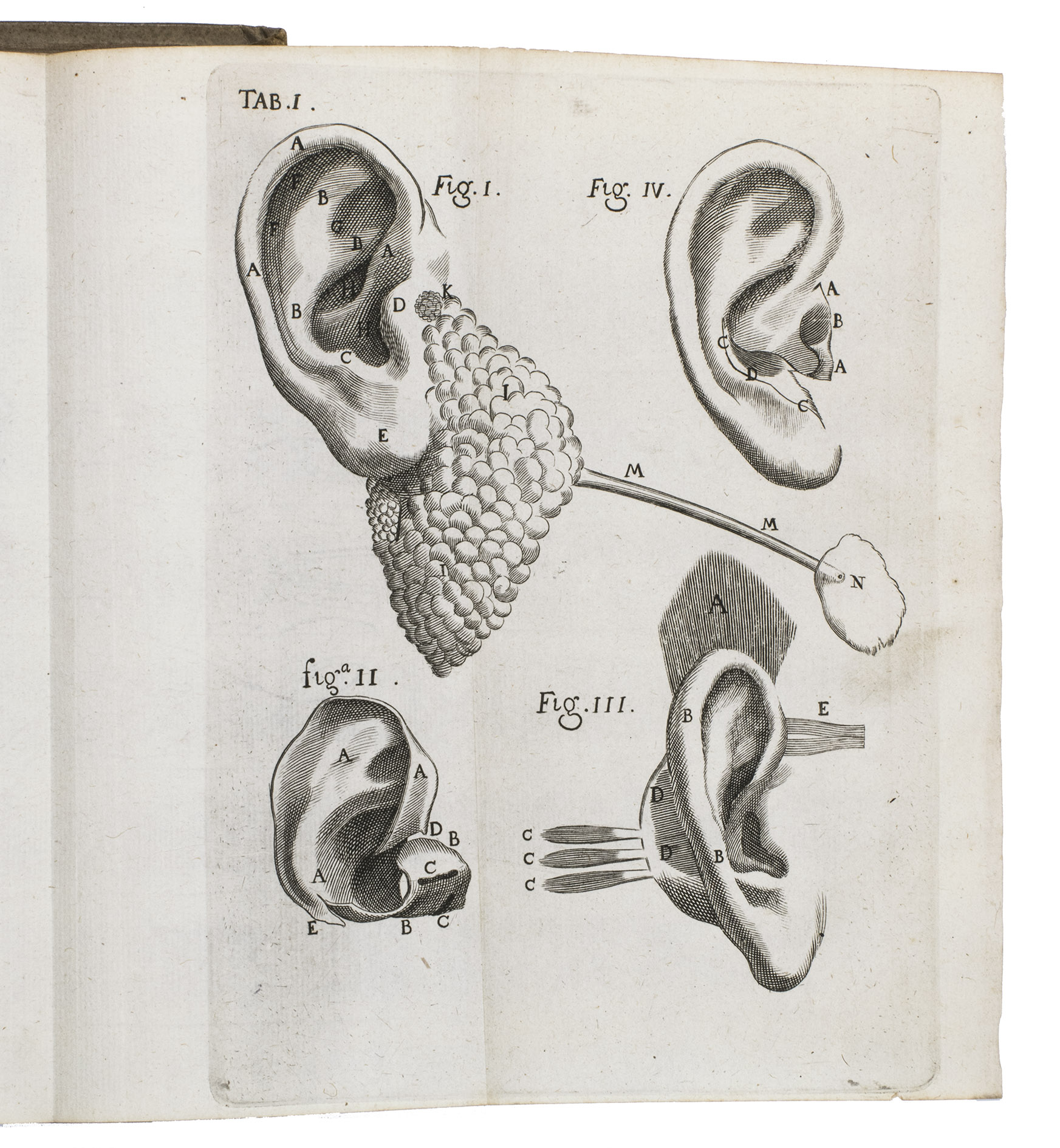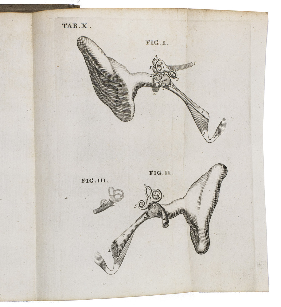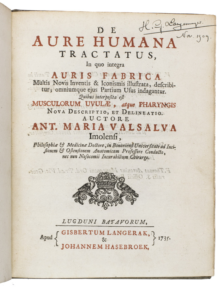 2. VALSALVA, Antonio Maria. De aure humana tractatus, in quo integra auris fabrica multis novis & iconismis illustrata, describitur: omniumque ejus partium usus indagantur.Quibus interposita esty musculuram ovulae, atque pharyngis nova descriptio, et delinatio. Leyden, Gijsbert Langerak & Joh. Hasebroek, 1735. Title in red and black, 10 folding engraved plates. (14), 143, (13) pp.