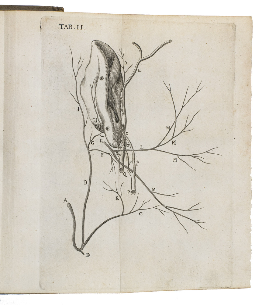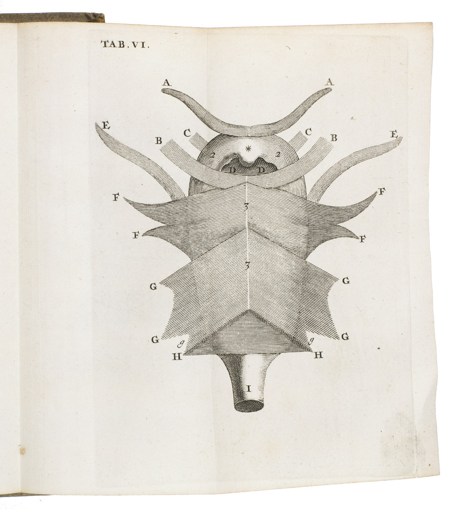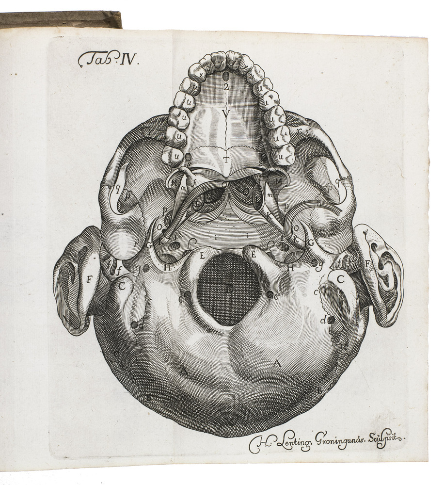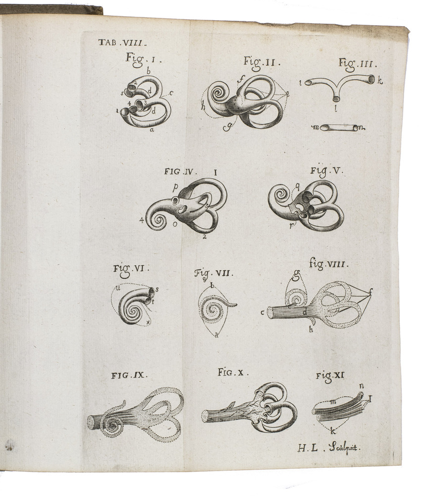 2. VALSALVA, Antonio Maria. De aure humana tractatus, in quo integra auris fabrica multis novis & iconismis illustrata, describitur: omniumque ejus partium usus indagantur.Quibus interposita esty musculuram ovulae, atque pharyngis nova descriptio, et delinatio. Leyden, Gijsbert Langerak & Joh. Hasebroek, 1735. Title in red and black, 10 folding engraved plates. (14), 143, (13) pp.