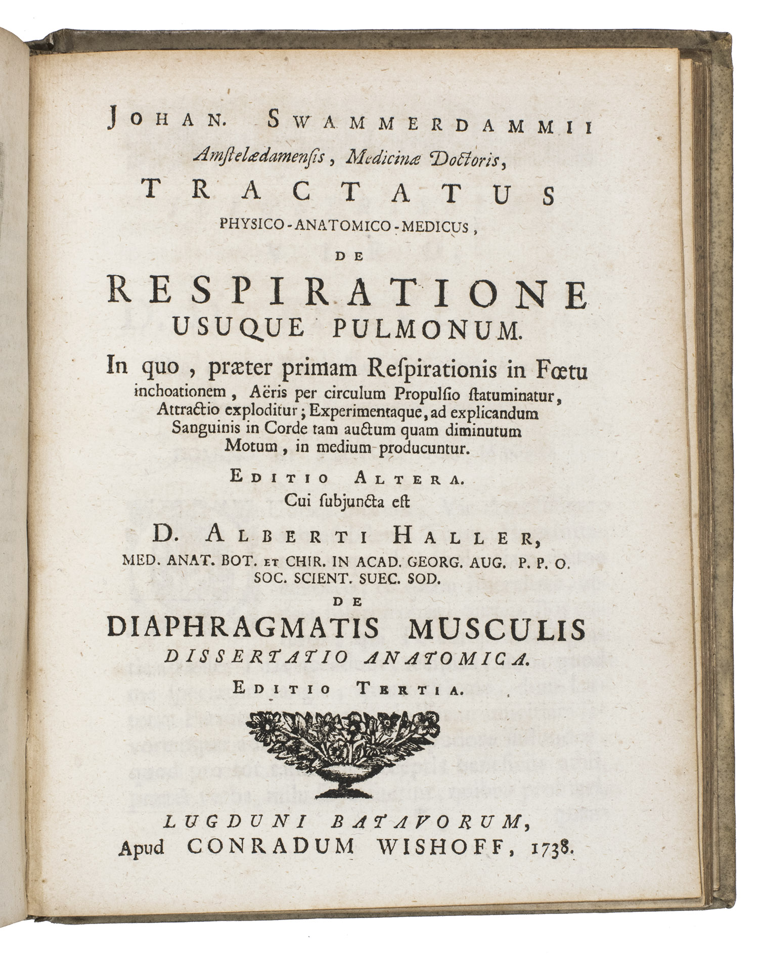 Ad 1: Classic on respiration and the earliest published medical work by Jan Swammerdam (Amsterdam 1637-1680), the most outstanding comparative anatomist of the 17th century. He was also the most important among the earliest scientists to study insect anatomy, and many of his observations were of great importance to modern biology. In the present treatise, which was first published at Leyden by D. & A. Gaasbeeck in 1667, Swammerdam records his discovery that the lungs of newborn infants will float on water if respiration has taken place, an important medico-legal point. At the end is included Albrecht Haller's (1708-1777) epoch making research on the structure of the human diaphragm.
