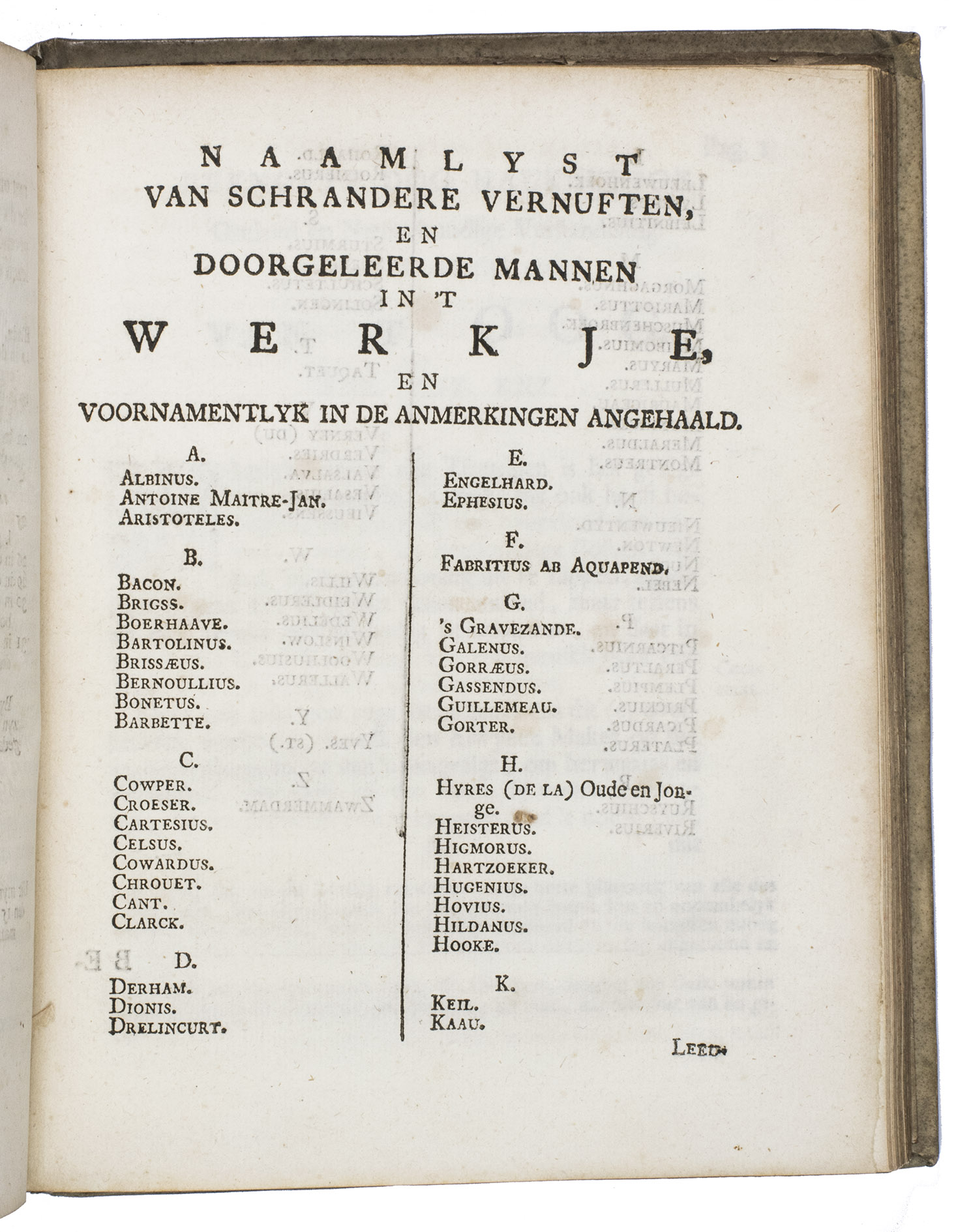 Fine copies. Ad 1: Waller 9386; Garrison & Morton 1724 (1st ed. 1667); on Haller: DSB VI, 64; Heirs of Hippocrates 388 (first ed. 1667); ad 2: Politzer pp. 136-43; cf. Norman Library 2125; Garrison & Morton 1546 (first ed. 1704); DSB XIII, 566/7; Heirs of Hippocrates 470; ad 3: Molhuysen-Blok X, 399.