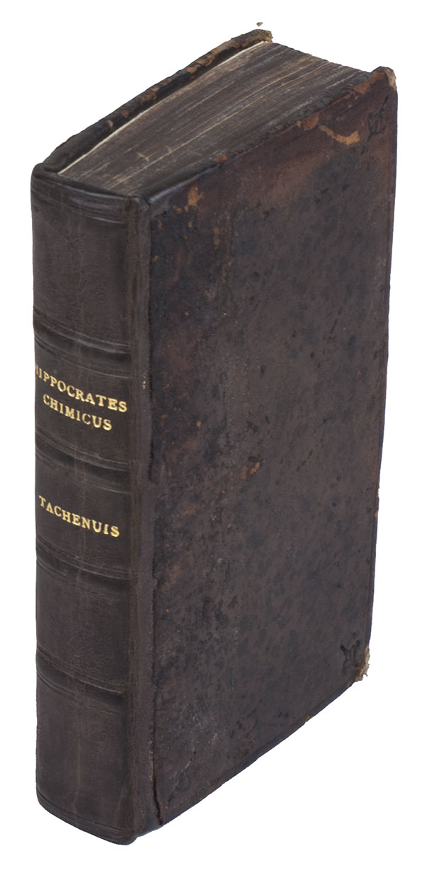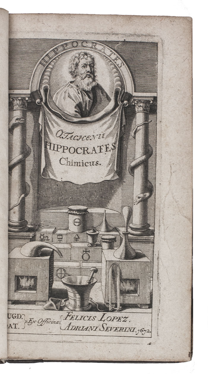 Rare third edition, with a newly engraved title-page, of Tacheniuss widely used work on chemistry and medicine. Together the Hippocrates chimicus and the Antiquissime Hippocraticae medicinae clavis form the complete works on chemistry and medicine of Otto Tachenius (1610-1680), based on the classic Hippocrates. He was schooled by Franciscus Sylvius, but surpassed his vision of acids, claiming that this is the basis of all physiology. According to Tachenius acid and alkali are the two elements of all things, corresponding to the fire and water that according to Hippocrates are in all things. He was in a debate of chemistry and medicine with Helwich Dietrich and Johann Zwelfer, the latter published his response to Tachenius work under the title Discursus apologeticus adversus Hippocratem chymicum in 1672.