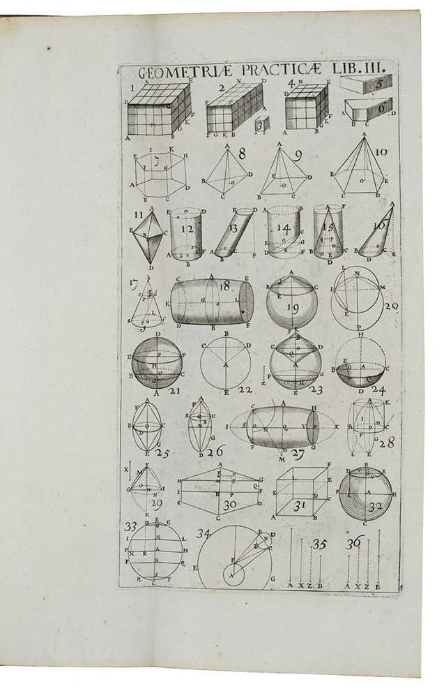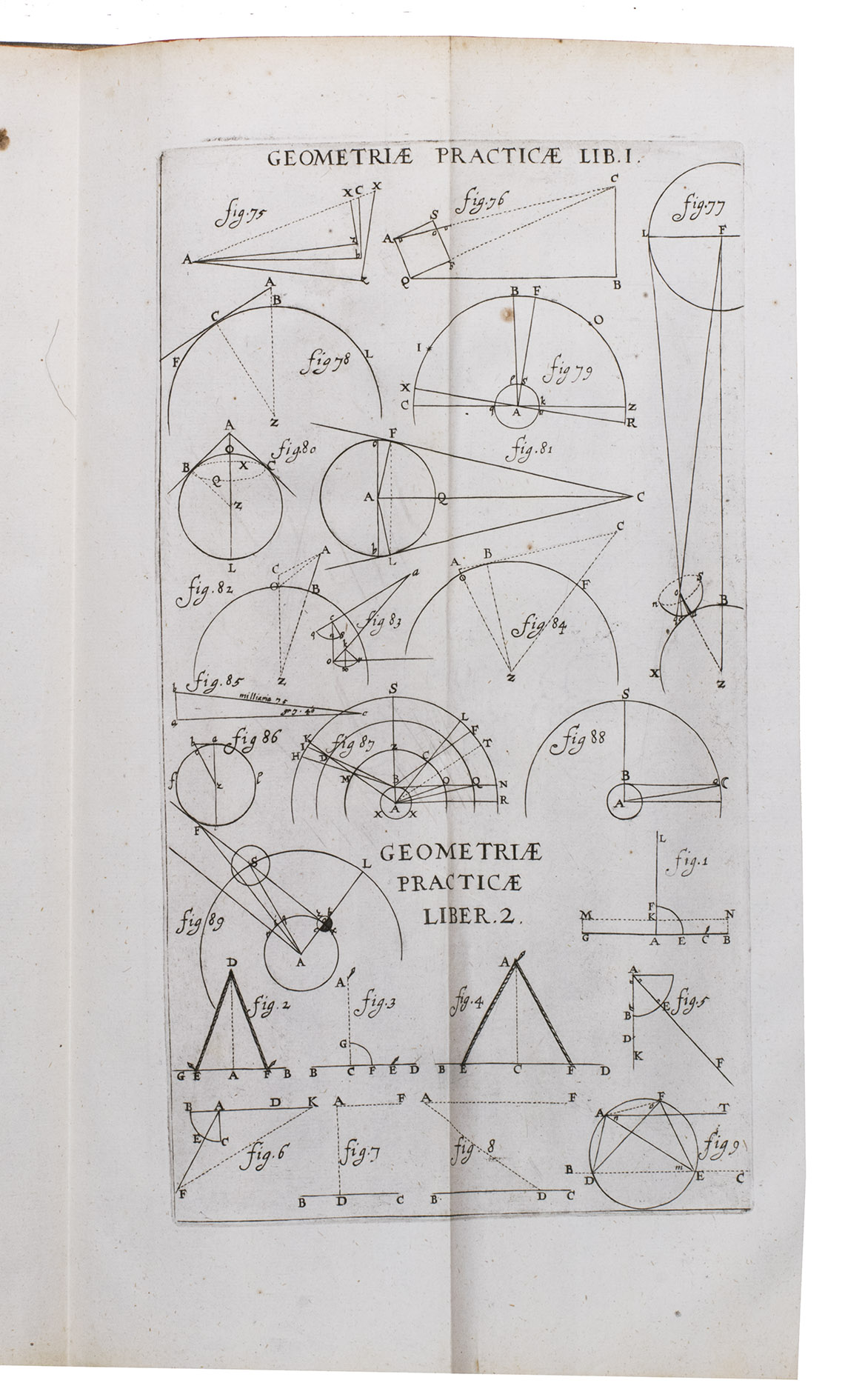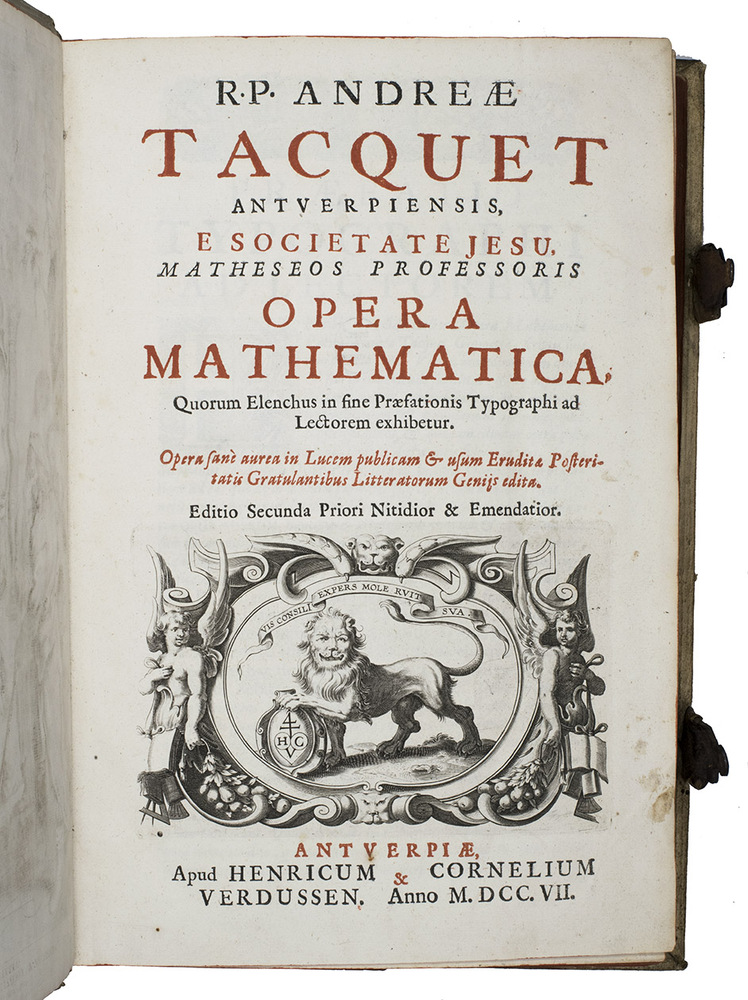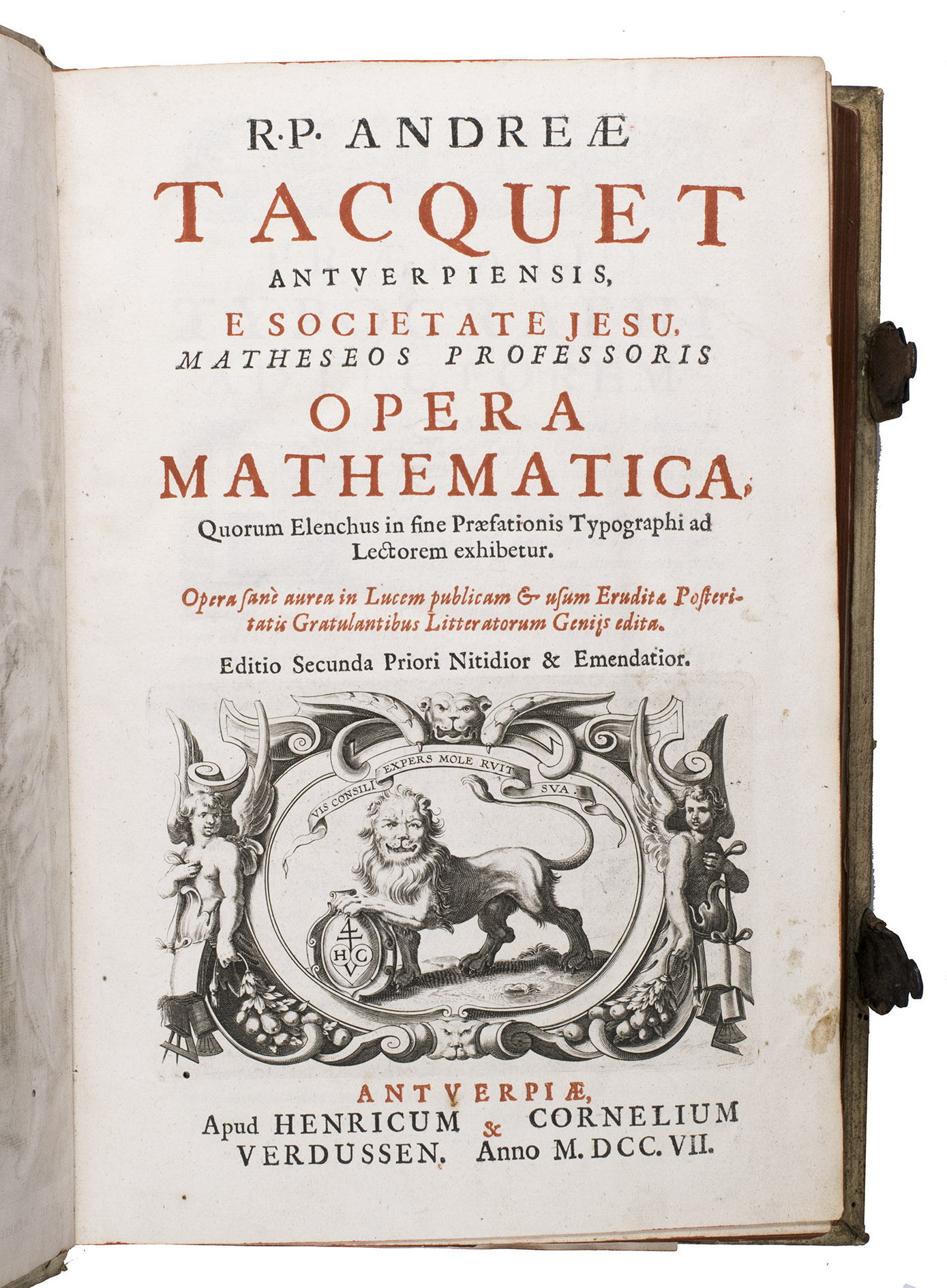 Second and best edition of the collected works on applied mathematics, by André Tacquet (1612-1660), a Belgian Jesuit scientist and professor in mathematics at Louvain and Antwerp. It is richly illustrated with mathemical drawings concerning the applications of perspective and with projections of cylinders, rings and circles. The present collected works, published posthumously by Tacquet's pupil Simone Laurentio Veterani, includes several works published here for the first time, namely his works on astronomy and on optics. The additional work on military engineering also is of interest, nicely illustrated with plans of fortifications and strongholds. Tacquet's works are exemplary text books, clearly demonstrating the theory, and also offering useful exercises for the pupils.