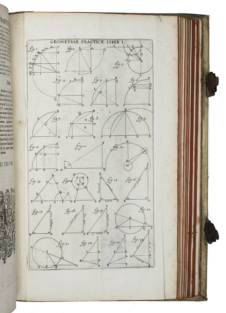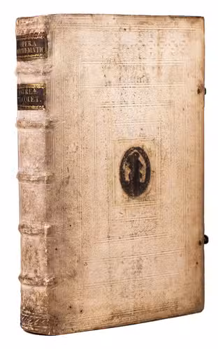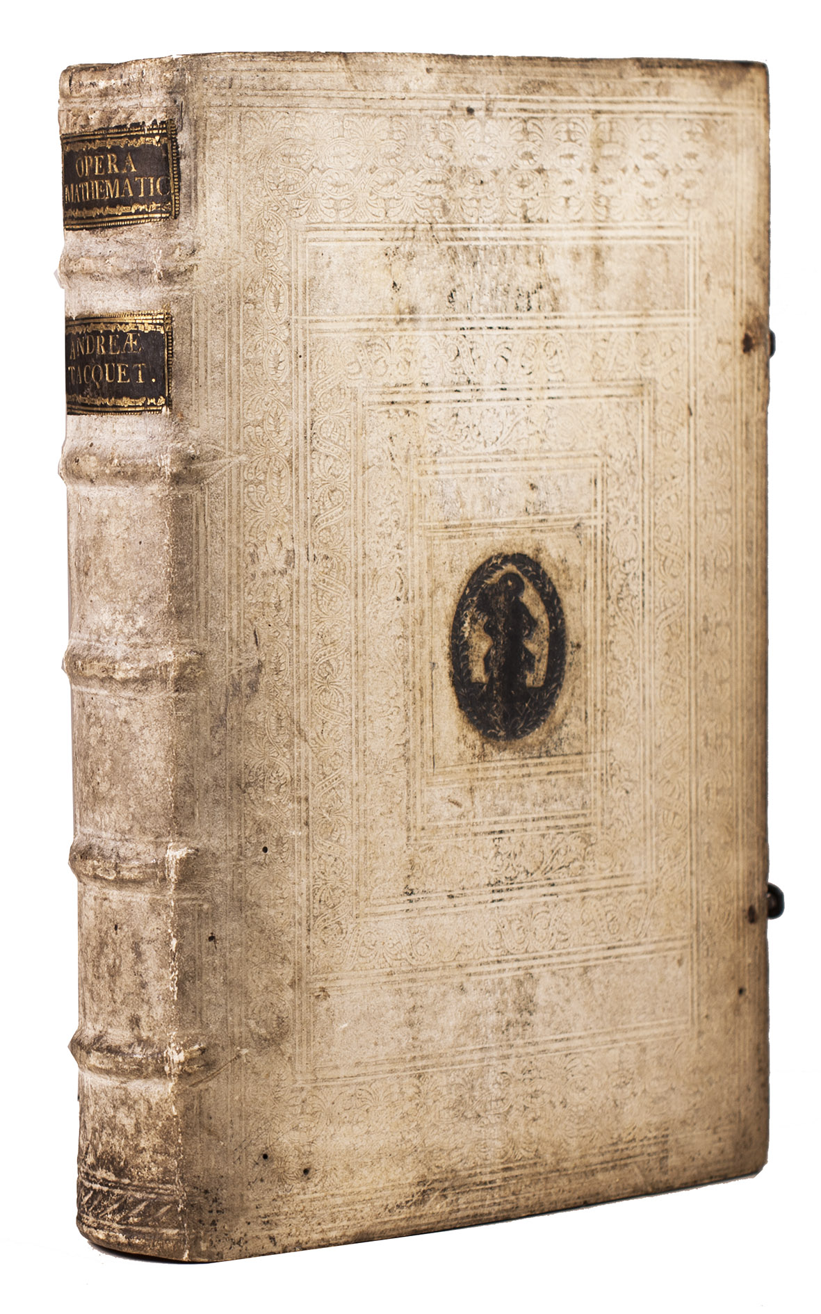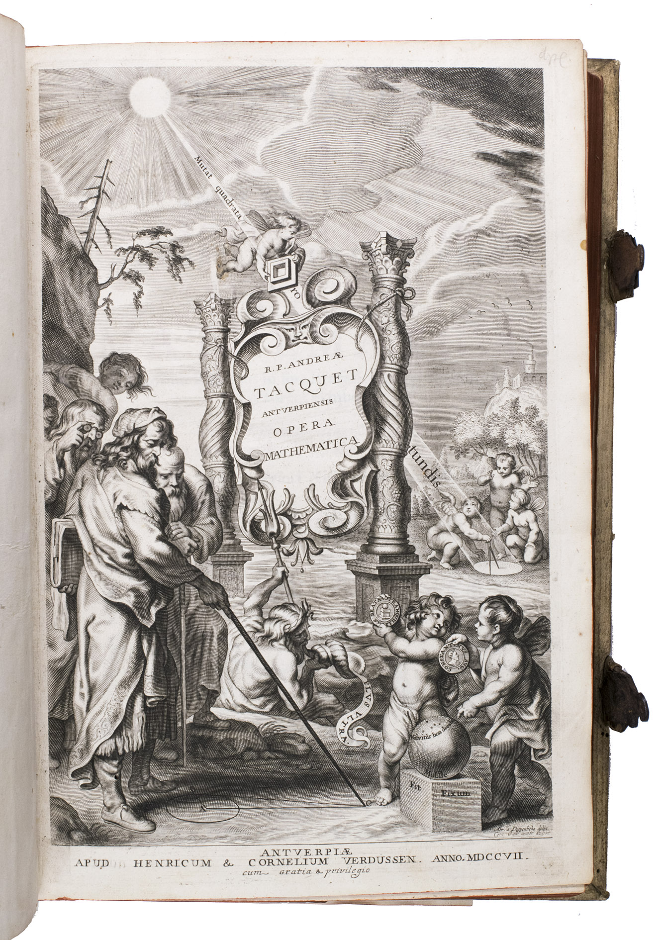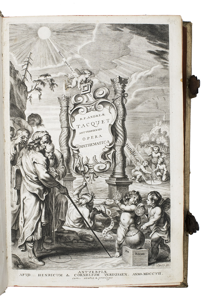 Antwerp, Henricus & Cornelius Verdussen, 1707. Folio. With a richly engraved allegorical frontispiece illustrating light refraction through lenses and the teaching of drawing with compasses, large engraved publisher's device on title-page, title in red and black, and numerous illustrations and figures on 87 folding engraved plates. Contemporary richly blind- and gold-tooled vellum over wooden boards, on the front board, the coat-of-arms of the Cartusiae Maurbacensis as centrepiece on the back board, red edges, two metal clasps. [32], 553, [1 blank] pp.