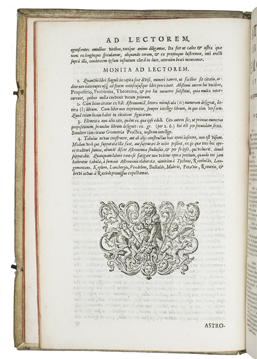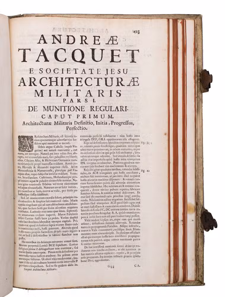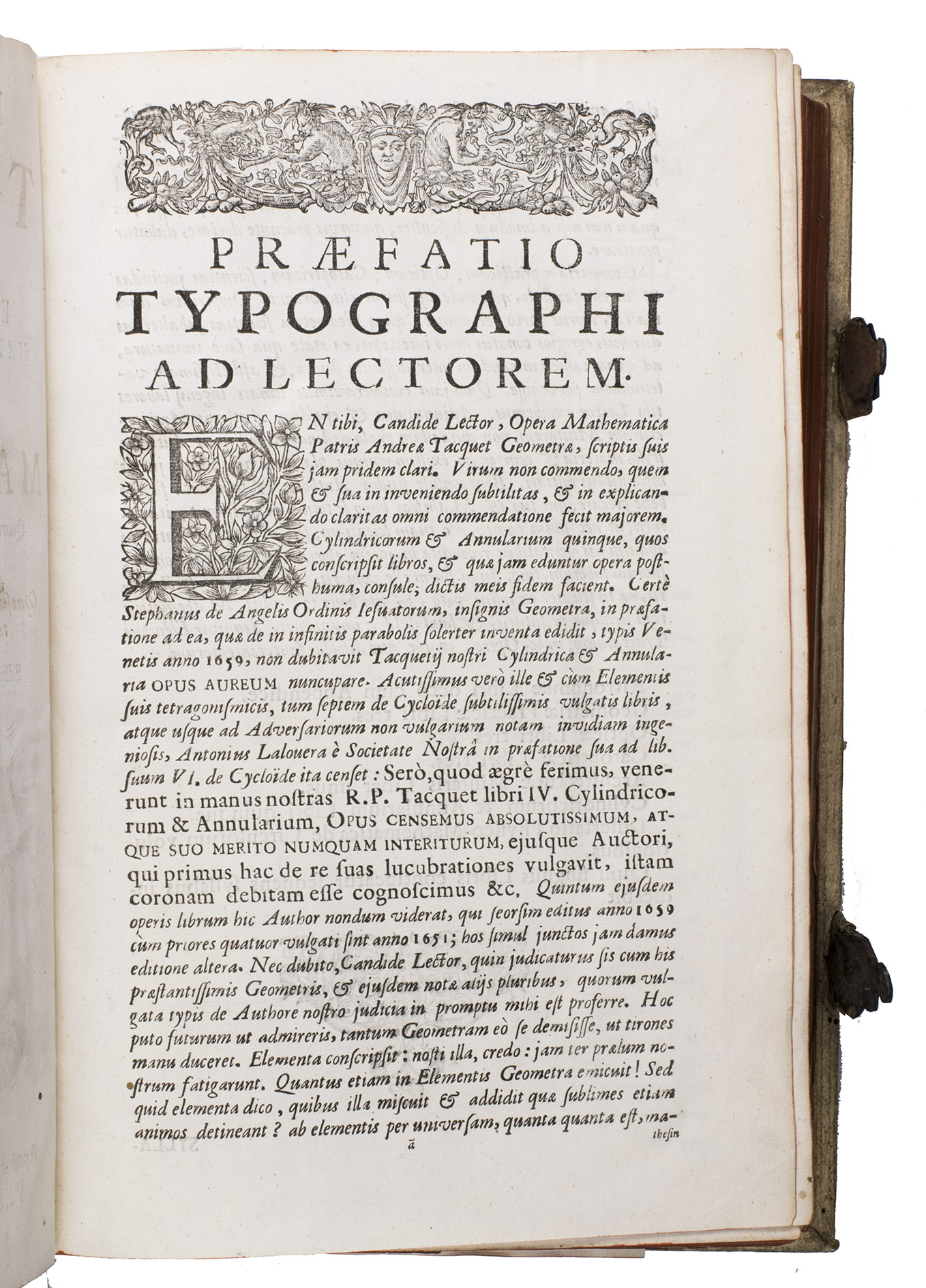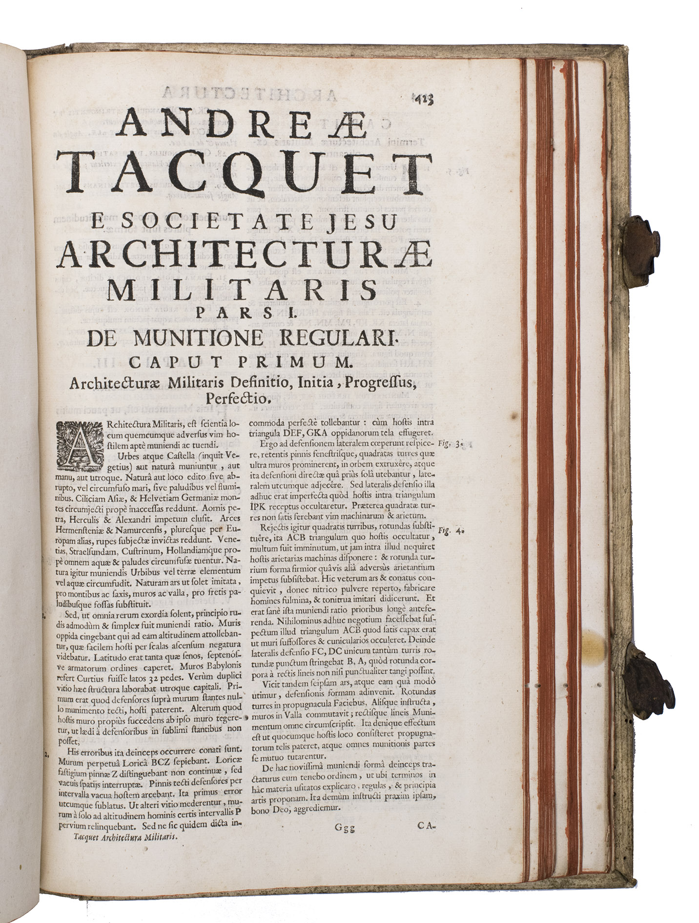 Antwerp, Henricus & Cornelius Verdussen, 1707. Folio. With a richly engraved allegorical frontispiece illustrating light refraction through lenses and the teaching of drawing with compasses, large engraved publisher's device on title-page, title in red and black, and numerous illustrations and figures on 87 folding engraved plates. Contemporary richly blind- and gold-tooled vellum over wooden boards, on the front board, the coat-of-arms of the Cartusiae Maurbacensis as centrepiece on the back board, red edges, two metal clasps. [32], 553, [1 blank] pp.