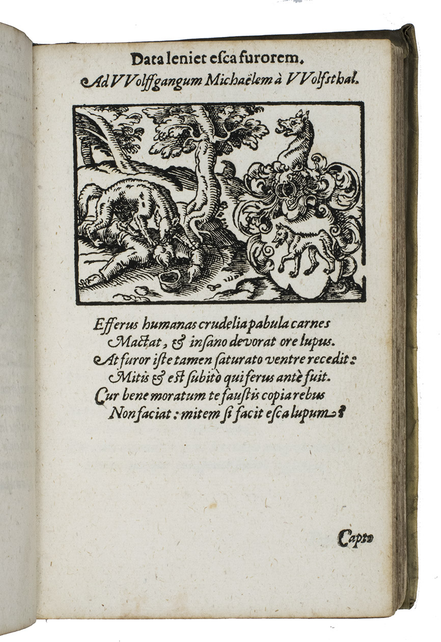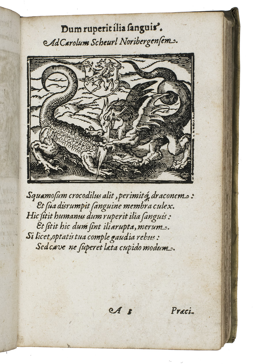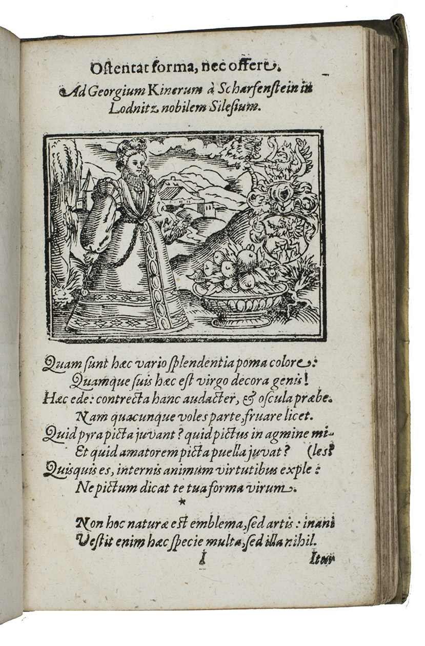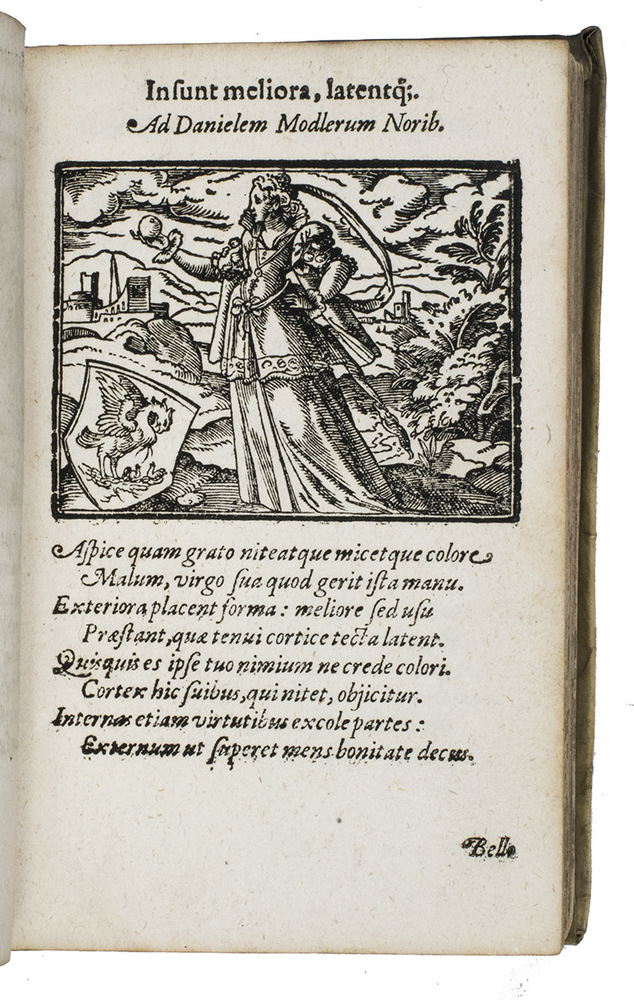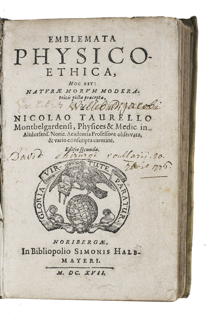 Ad 1: Second edition, in the rare second issue, of an emblem book by Nicolaeus Taurellus (1547-1606), German philosopher and professor of medicine and physics who studied at Tübingen and Basel and taught at Basel and Altdorf (near Nürnberg), first published also in Nürnberg but by Paul Kauffmann, in 1595. The present 1617 issue is in fact a reissue of the 1602 edition published by Lochner (see below) with the preliminaries cancelled (the first 3 leaves a1-3). "Apparently this emblem book was intended as an album amicorum" (Landwehr): the emblems are printed on one side of the leaves only (and are preceded by 3 blank pages), leaving room for friends to write inscriptions. Some of the illustrations copy some in Jost Ammans 1579 Stamm- und Wappenbuch.