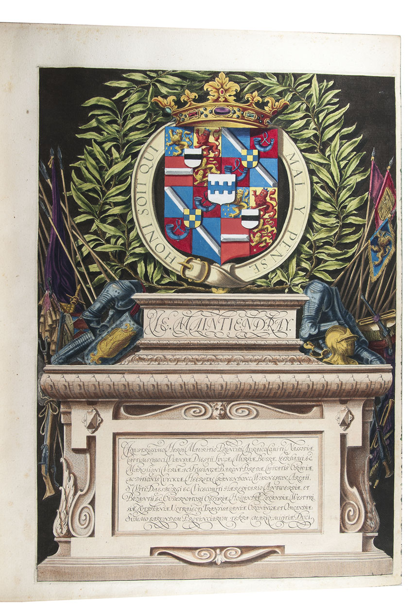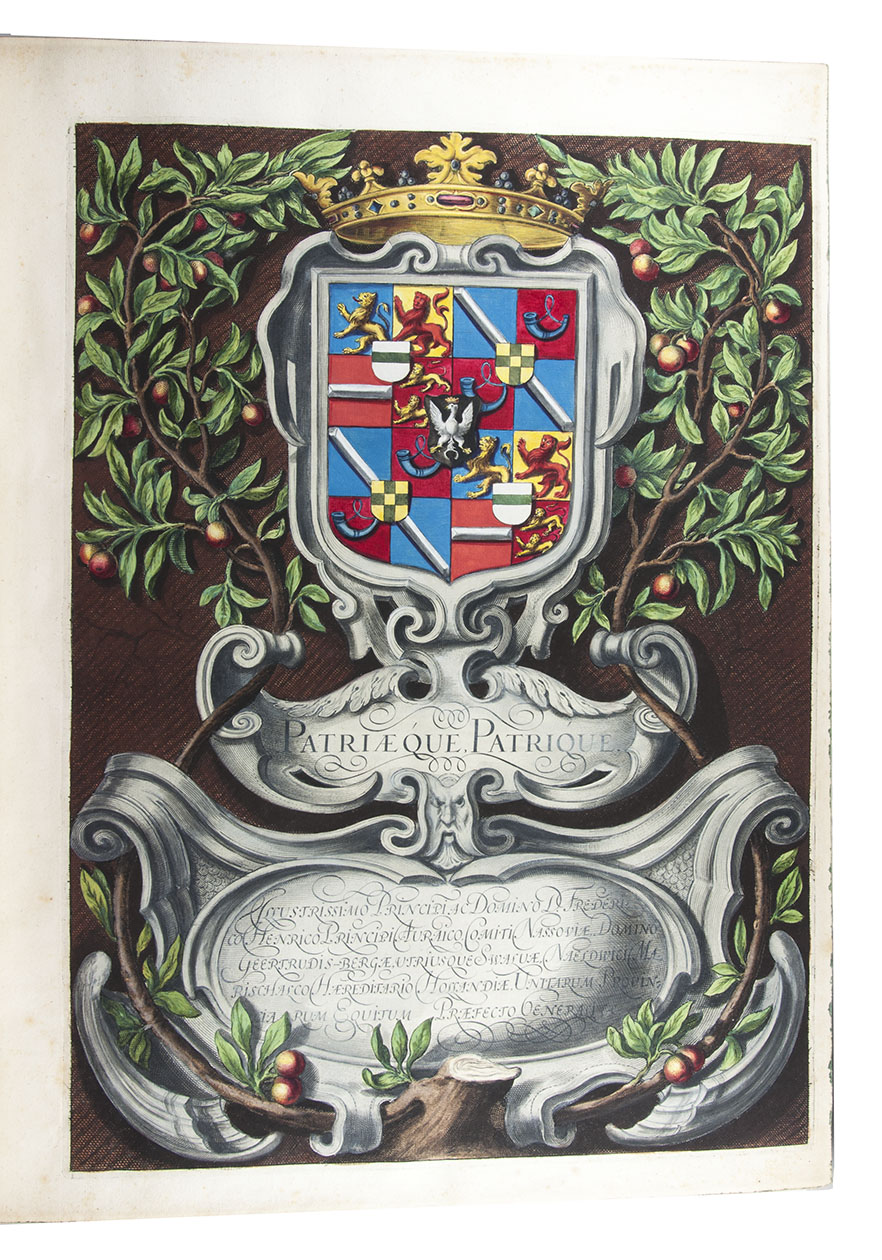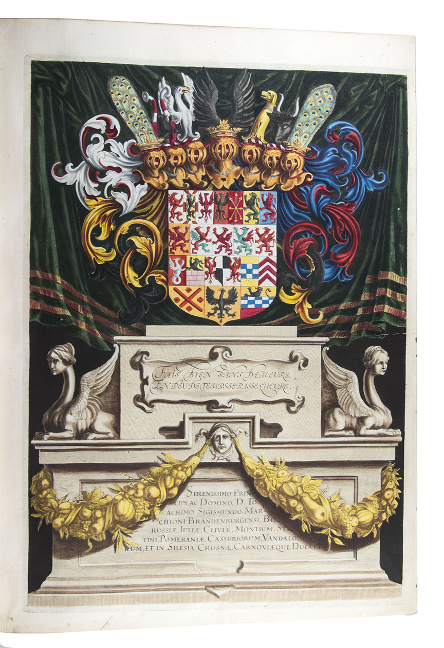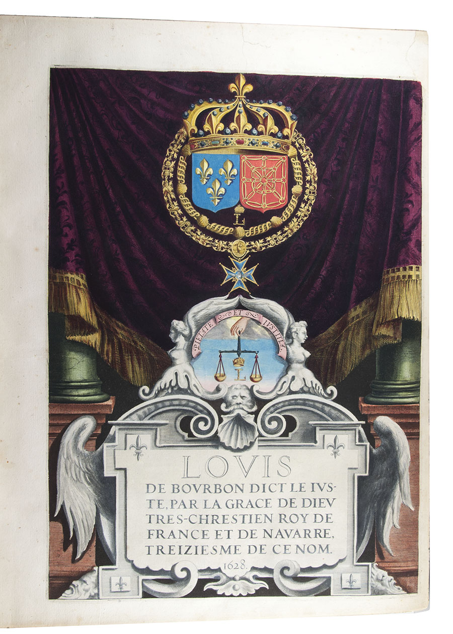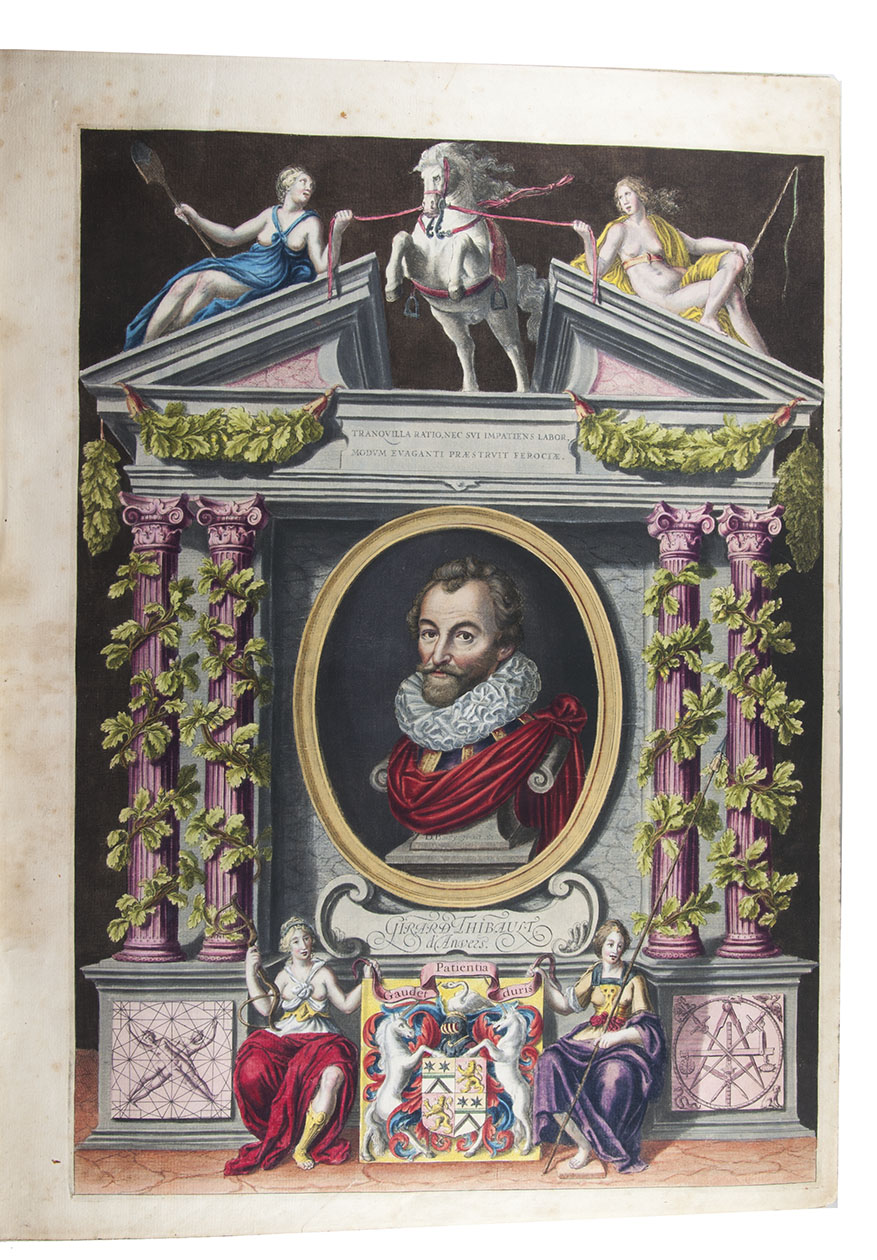 [Amsterdam?, Thibault heirs?, printed in Leiden by Bonaventura and Abraham Elzevier, sold in Frankfurt by Lucas Jennis], "1628" [= 1629]. 2 parts in 1 volume. Royal 1mo (53.5 x 41 cm). With an elaborate engraved title page with; engraved portrait of the author (drawn by David Bailly after his own painting); 9 full-page engraved armorial plates, 1 full-page and 45 double-page numbered illustration plates, and hundreds of large woodcut arabesque initial letters, headpieces, tailpieces and factotums, at least most of them specially made for this book. With 2 text leaves in a meticulously pen-drawn, 18th-century(?) facsimile. With all plates beautifully coloured by the painter David Bailly with highlights in gold and silver. Contemporary(?) vellum over boards (modified in the 18th century), with the velvet covering and metal bosses and fastenings removed, dark blue edges. With tissues guards loosely inserted before the coloured plates. With a dedicatory inscription on the front free endleaf to Henri de Bourbon, Prince of Condé, by the colourist David Bailly, signed from Antwerp, 17 March 1629. Also with a carefully hand-lettered contemporary note to the reader at the foot of the dedication page. [4], [222]; [54], pp. + engraved title page and other plates.