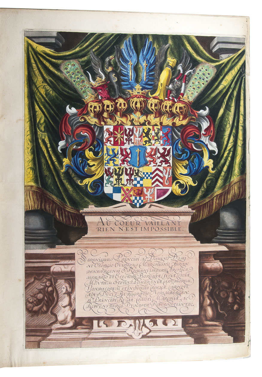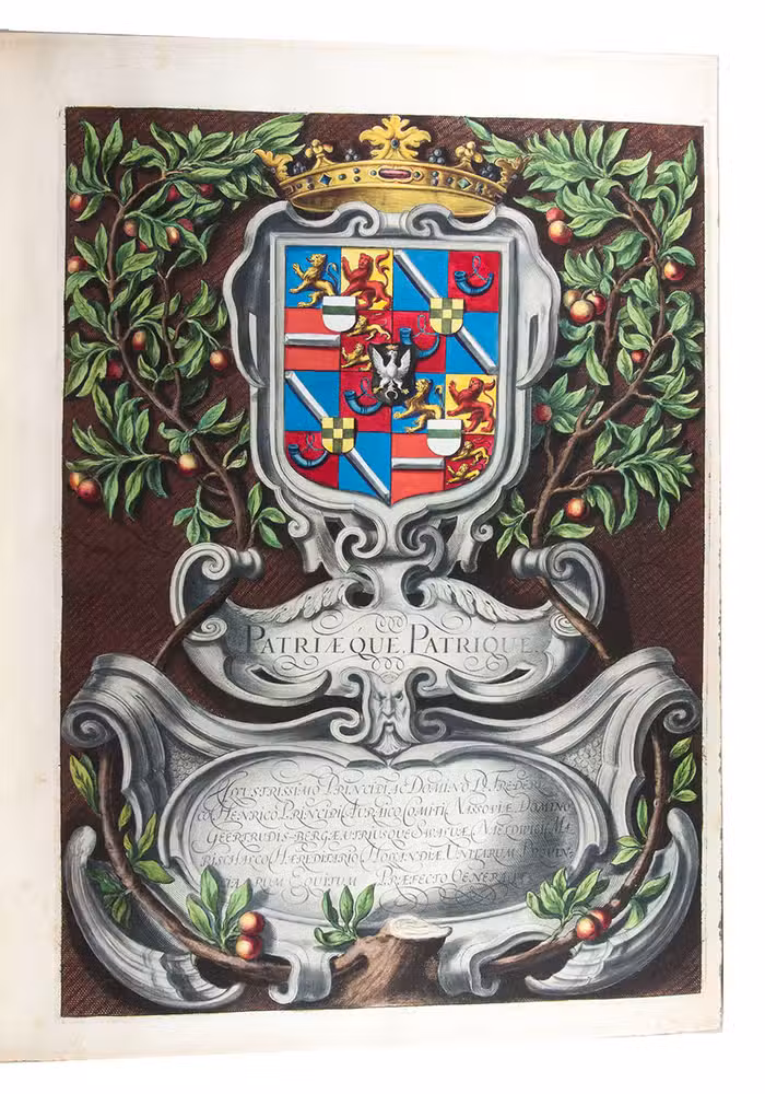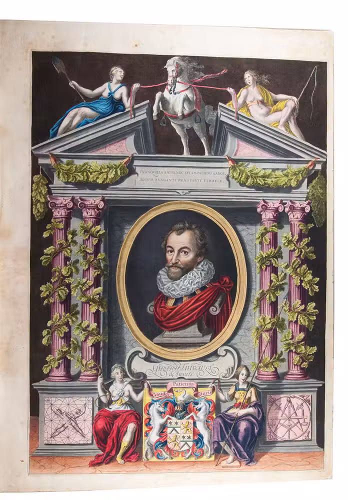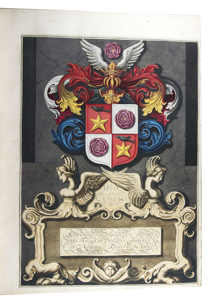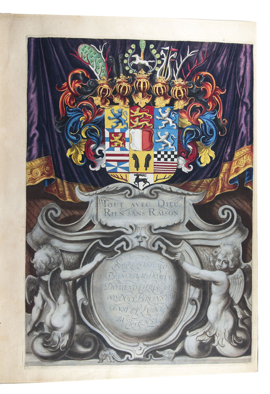 [Amsterdam?, Thibault heirs?, printed in Leiden by Bonaventura and Abraham Elzevier, sold in Frankfurt by Lucas Jennis], "1628" [= 1629]. 2 parts in 1 volume. Royal 1mo (53.5 x 41 cm). With an elaborate engraved title page with; engraved portrait of the author (drawn by David Bailly after his own painting); 9 full-page engraved armorial plates, 1 full-page and 45 double-page numbered illustration plates, and hundreds of large woodcut arabesque initial letters, headpieces, tailpieces and factotums, at least most of them specially made for this book. With 2 text leaves in a meticulously pen-drawn, 18th-century(?) facsimile. With all plates beautifully coloured by the painter David Bailly with highlights in gold and silver. Contemporary(?) vellum over boards (modified in the 18th century), with the velvet covering and metal bosses and fastenings removed, dark blue edges. With tissues guards loosely inserted before the coloured plates. With a dedicatory inscription on the front free endleaf to Henri de Bourbon, Prince of Condé, by the colourist David Bailly, signed from Antwerp, 17 March 1629. Also with a carefully hand-lettered contemporary note to the reader at the foot of the dedication page. [4], [222]; [54], pp. + engraved title page and other plates.