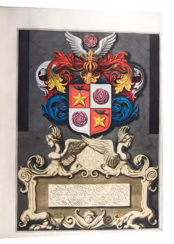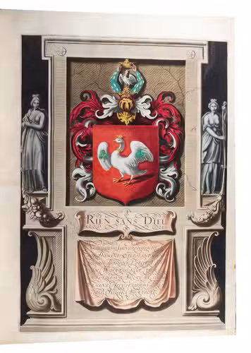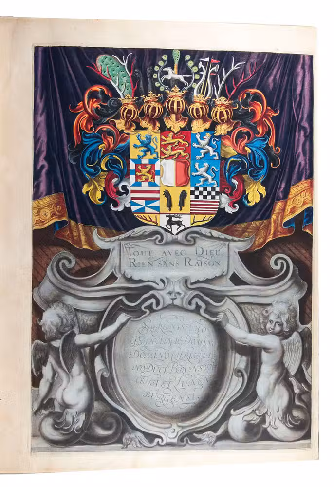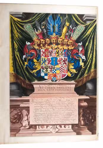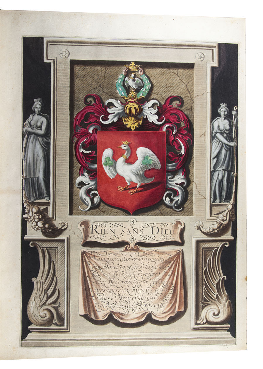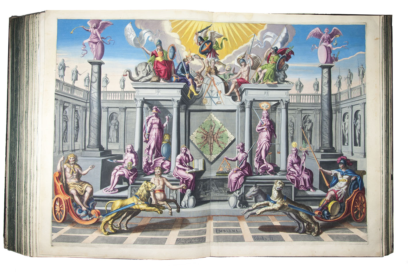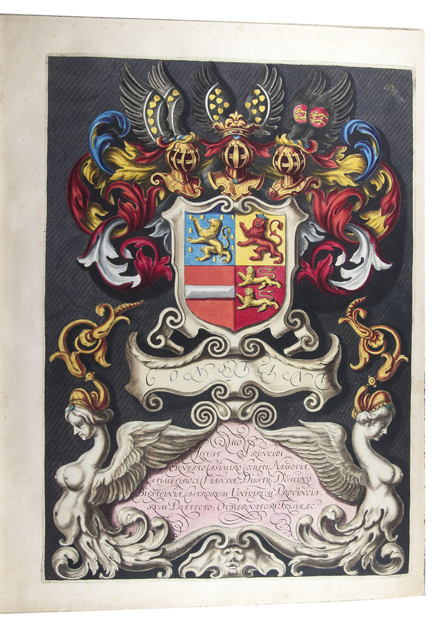 [Amsterdam?, Thibault heirs?, printed in Leiden by Bonaventura and Abraham Elzevier, sold in Frankfurt by Lucas Jennis], "1628" [= 1629]. 2 parts in 1 volume. Royal 1mo (53.5 x 41 cm). With an elaborate engraved title page with; engraved portrait of the author (drawn by David Bailly after his own painting); 9 full-page engraved armorial plates, 1 full-page and 45 double-page numbered illustration plates, and hundreds of large woodcut arabesque initial letters, headpieces, tailpieces and factotums, at least most of them specially made for this book. With 2 text leaves in a meticulously pen-drawn, 18th-century(?) facsimile. With all plates beautifully coloured by the painter David Bailly with highlights in gold and silver. Contemporary(?) vellum over boards (modified in the 18th century), with the velvet covering and metal bosses and fastenings removed, dark blue edges. With tissues guards loosely inserted before the coloured plates. With a dedicatory inscription on the front free endleaf to Henri de Bourbon, Prince of Condé, by the colourist David Bailly, signed from Antwerp, 17 March 1629. Also with a carefully hand-lettered contemporary note to the reader at the foot of the dedication page. [4], [222]; [54], pp. + engraved title page and other plates.