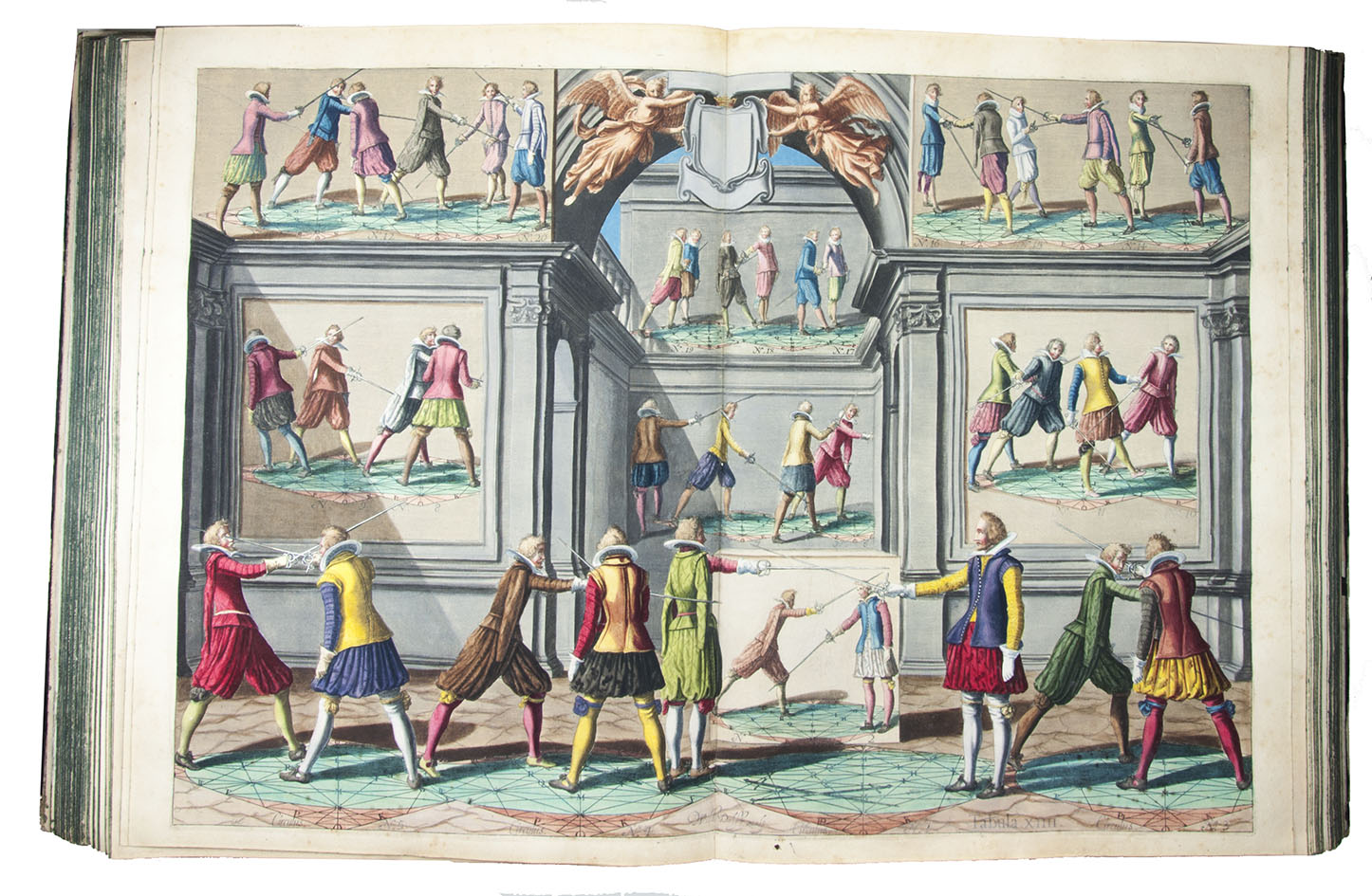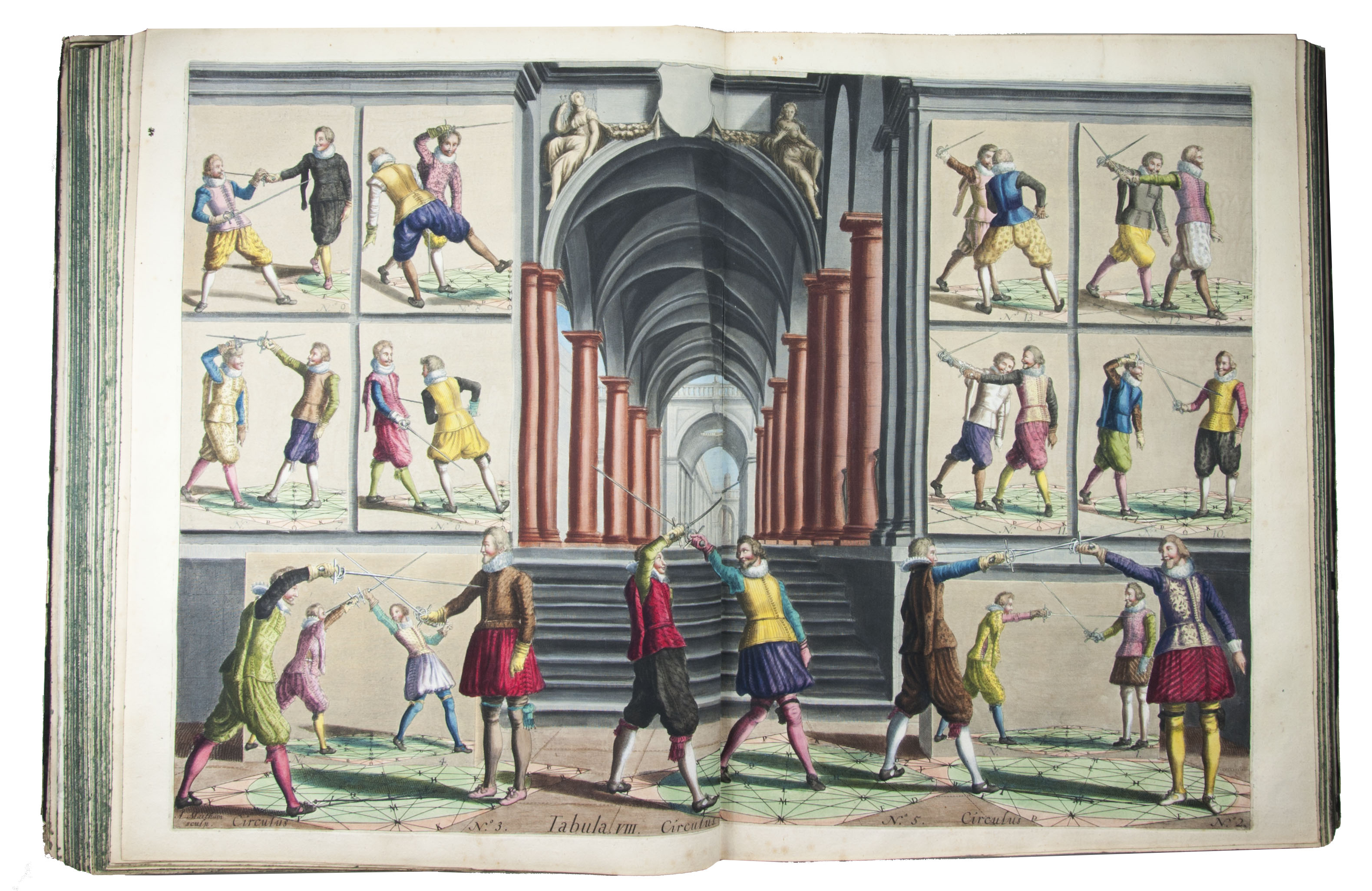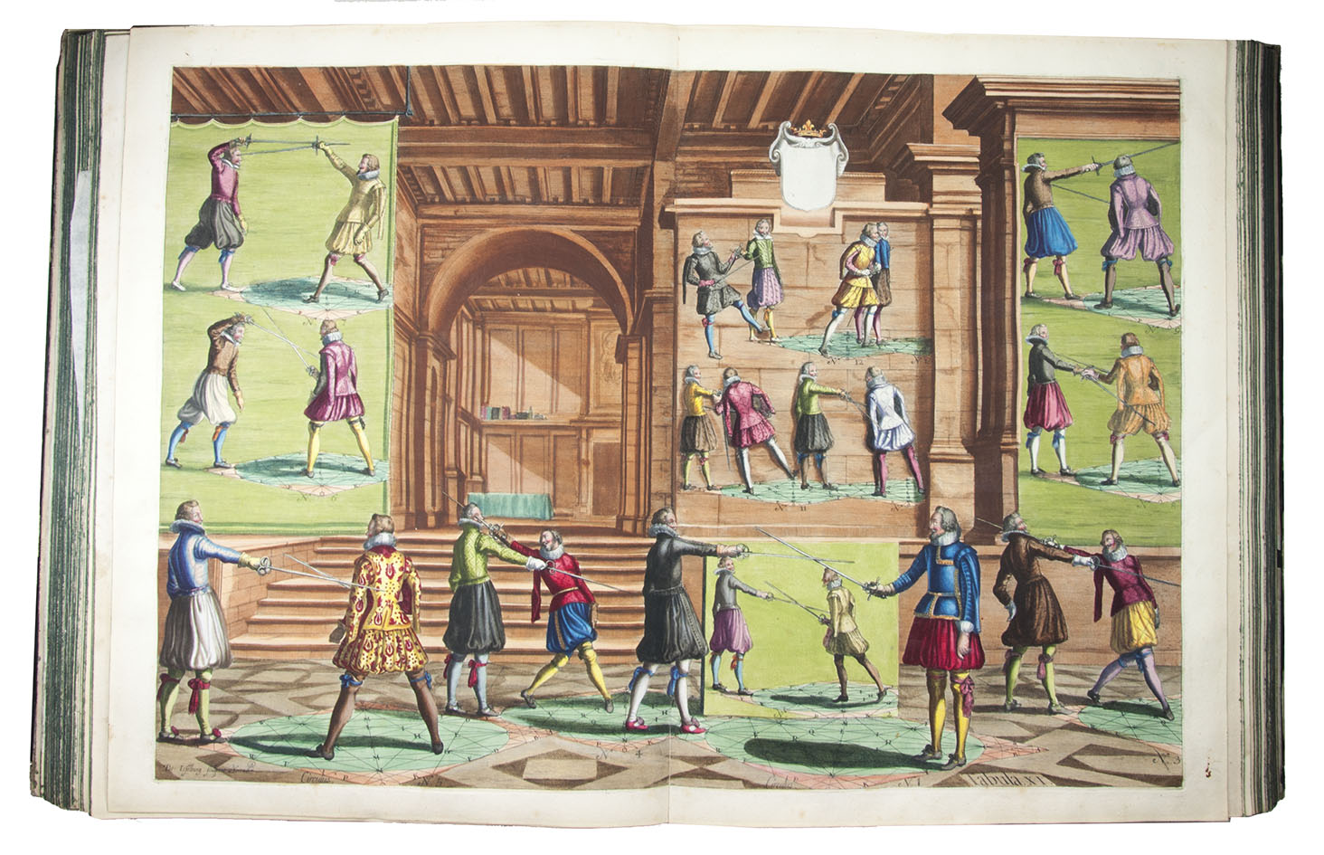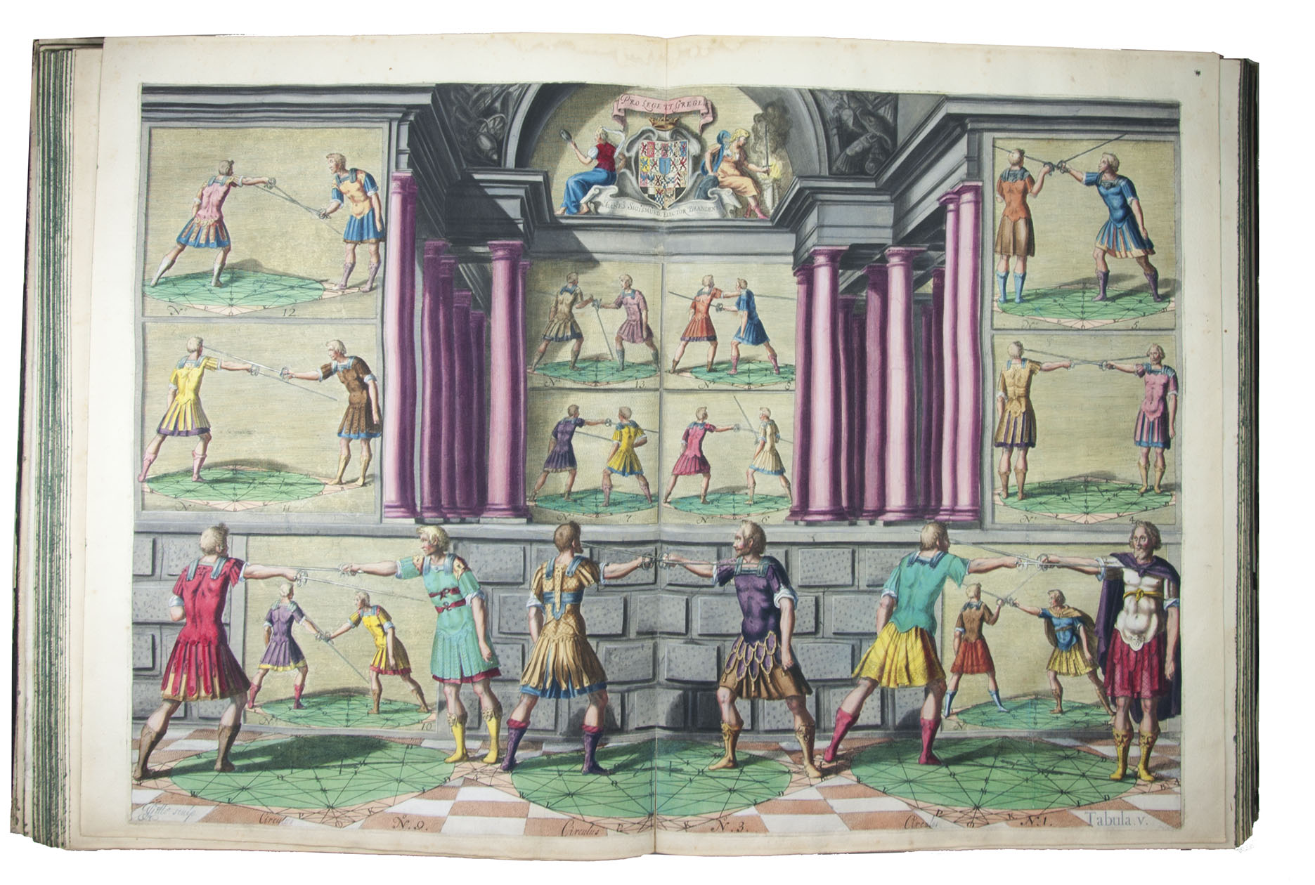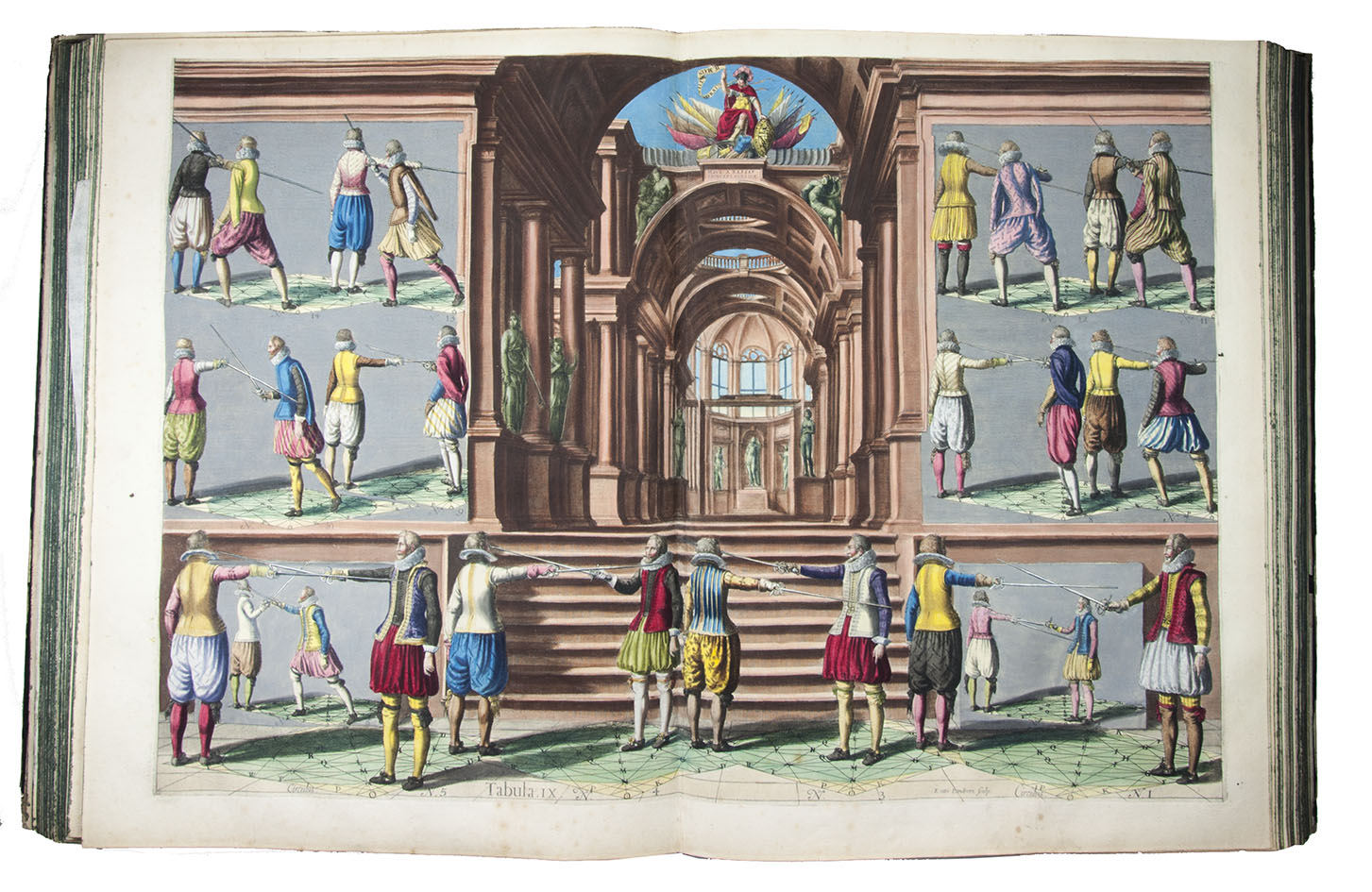 Beautifully coloured copy, by a Dutch painter closely associated with the author and the Elzeviers, of the first issue of the most sumptuous book on fencing ever produced, the Elzeviers' most ambitious undertaking, and one of the greatest show-pieces of the art of the book and the engraver's art ever. The importance of the plates and text lies not only in their beauty and craftsmanship, but also in their historical importance, for Thibault was an innovative and internationally acclaimed fencing master, and his book meticulously describes and illustrates the art of fencing just as the épée reached its zenith in Europe. Though fencing remained essential to any army officer, and was sometimes mortal for the loser, the growing use of firearms transformed it in the course of the sixteenth century from a military technique into a courtly art for noblemen and for honourable duelling, and these noblemen were of course Thibault's clientele. The last plate shows swordsmen facing opponents with firearms.