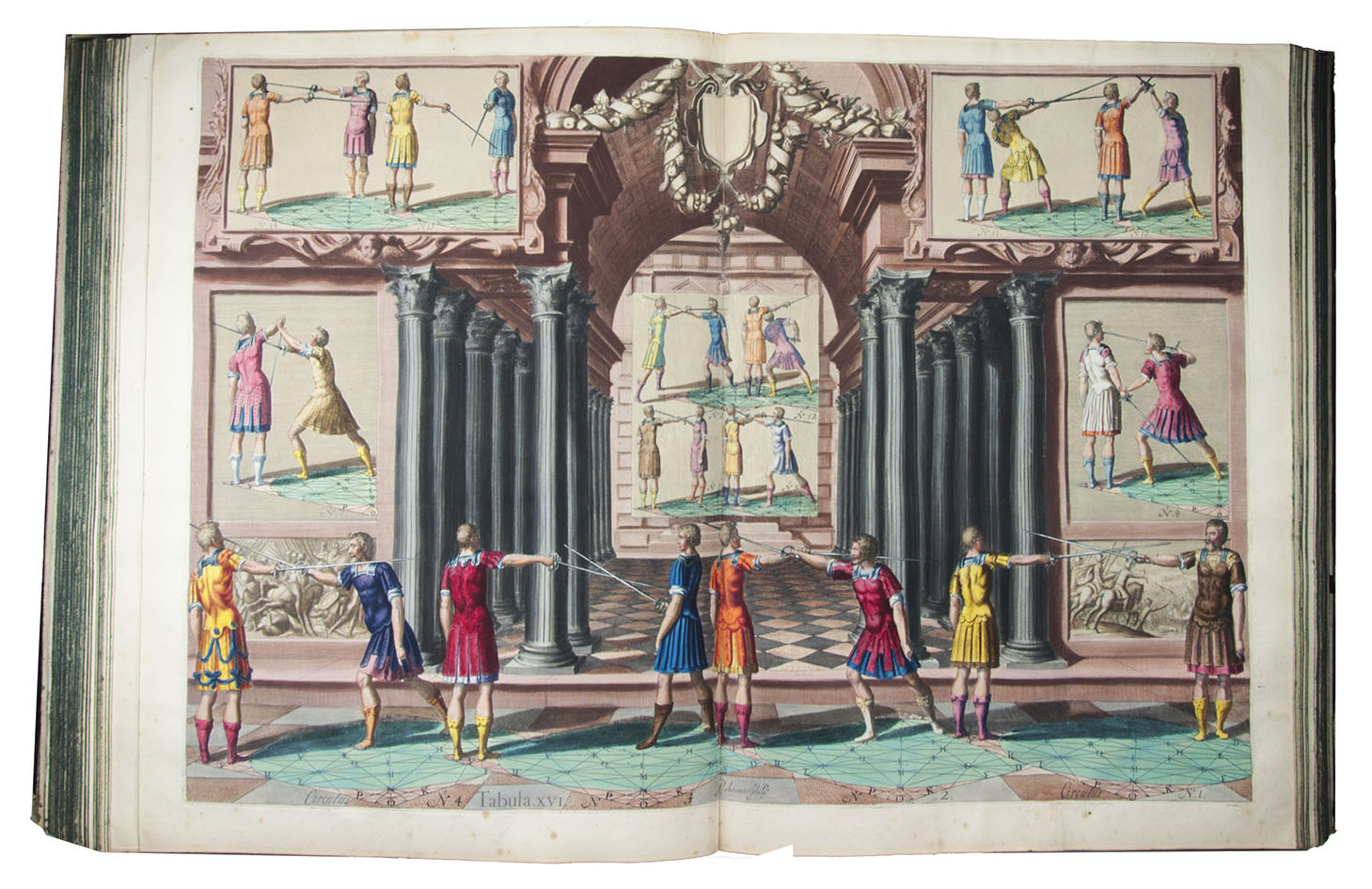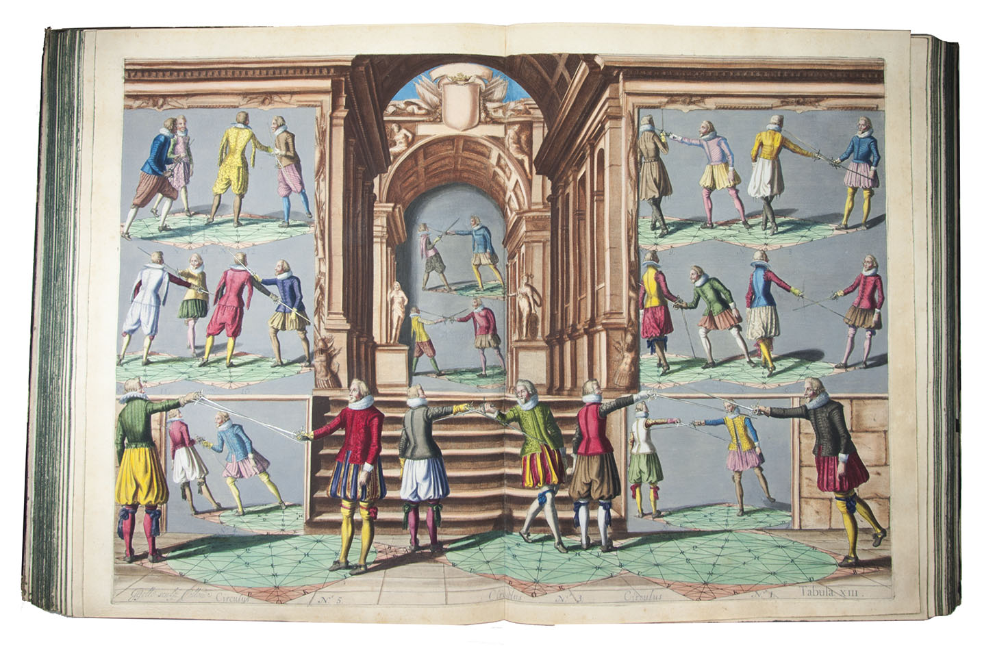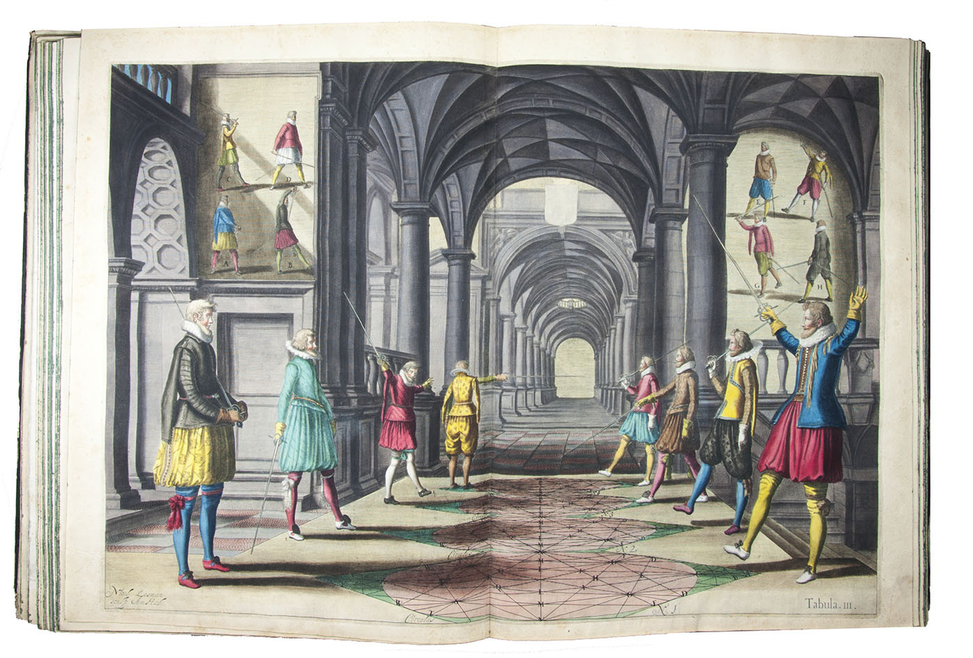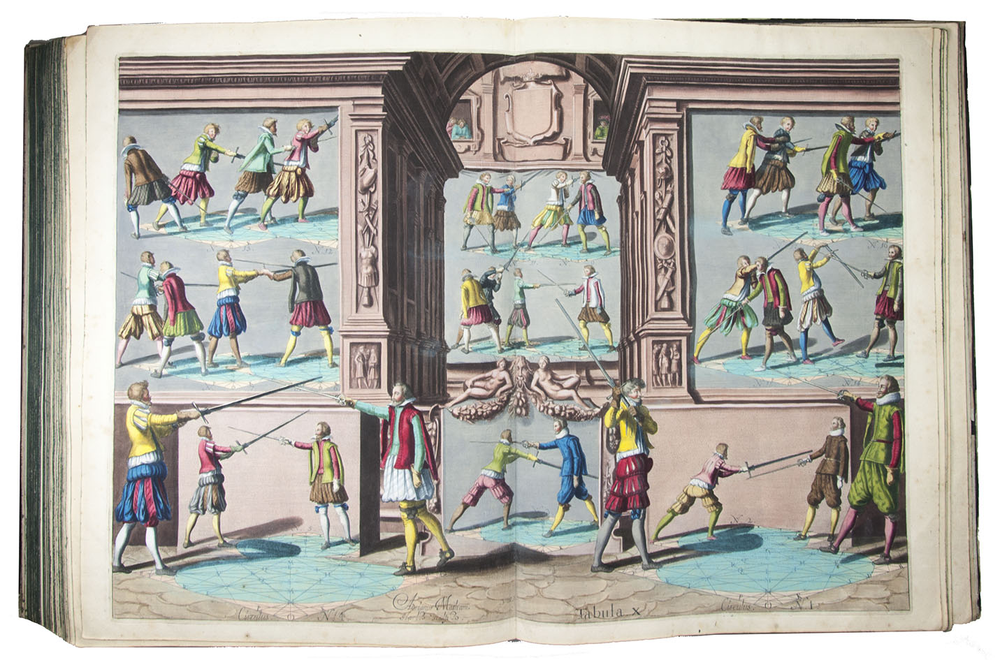 Beautifully coloured copy, by a Dutch painter closely associated with the author and the Elzeviers, of the first issue of the most sumptuous book on fencing ever produced, the Elzeviers' most ambitious undertaking, and one of the greatest show-pieces of the art of the book and the engraver's art ever. The importance of the plates and text lies not only in their beauty and craftsmanship, but also in their historical importance, for Thibault was an innovative and internationally acclaimed fencing master, and his book meticulously describes and illustrates the art of fencing just as the épée reached its zenith in Europe. Though fencing remained essential to any army officer, and was sometimes mortal for the loser, the growing use of firearms transformed it in the course of the sixteenth century from a military technique into a courtly art for noblemen and for honourable duelling, and these noblemen were of course Thibault's clientele. The last plate shows swordsmen facing opponents with firearms.
