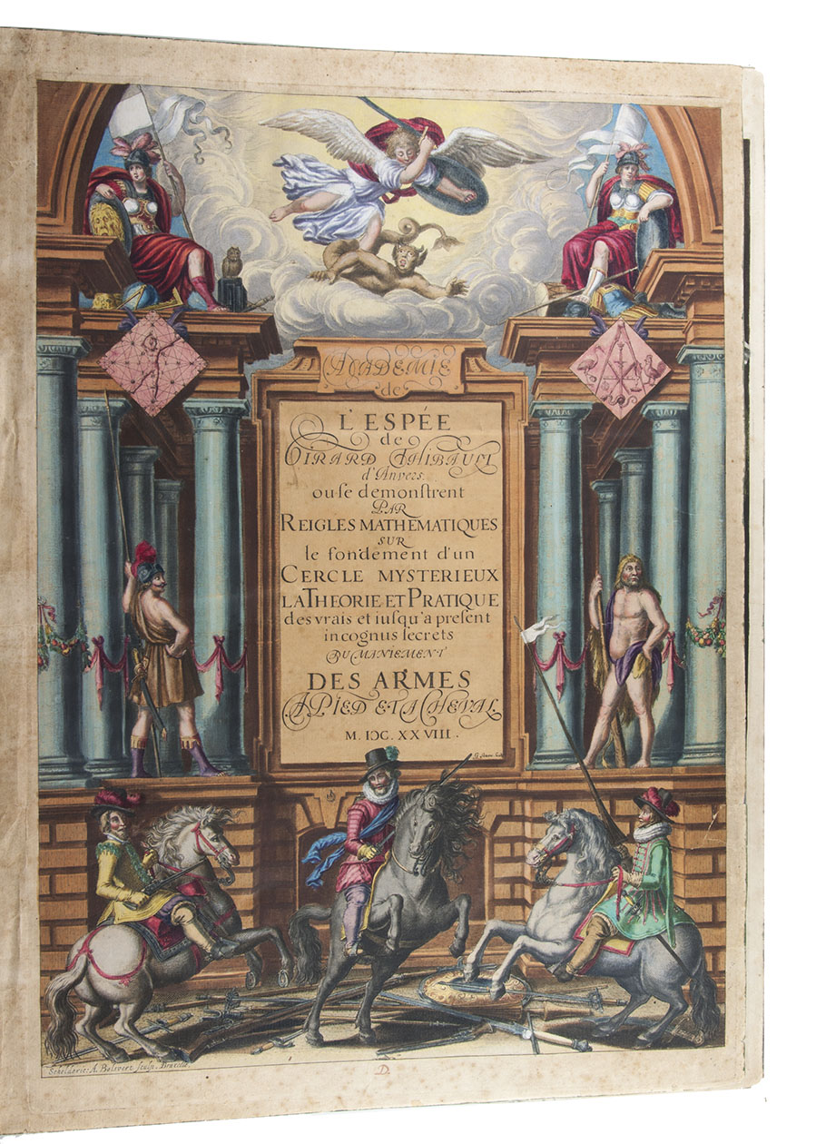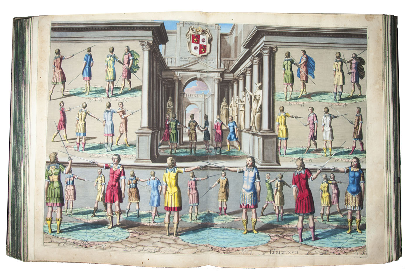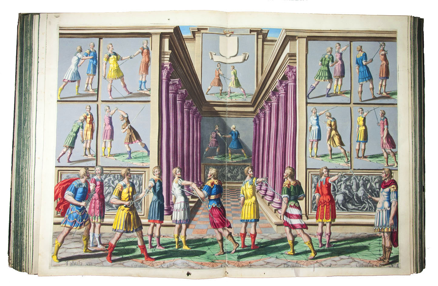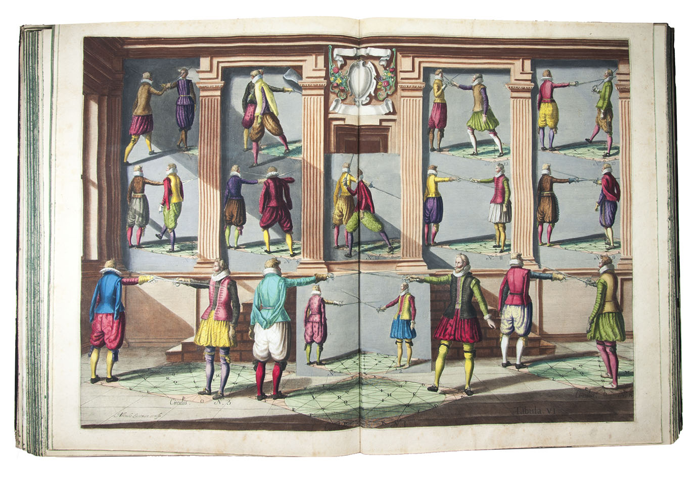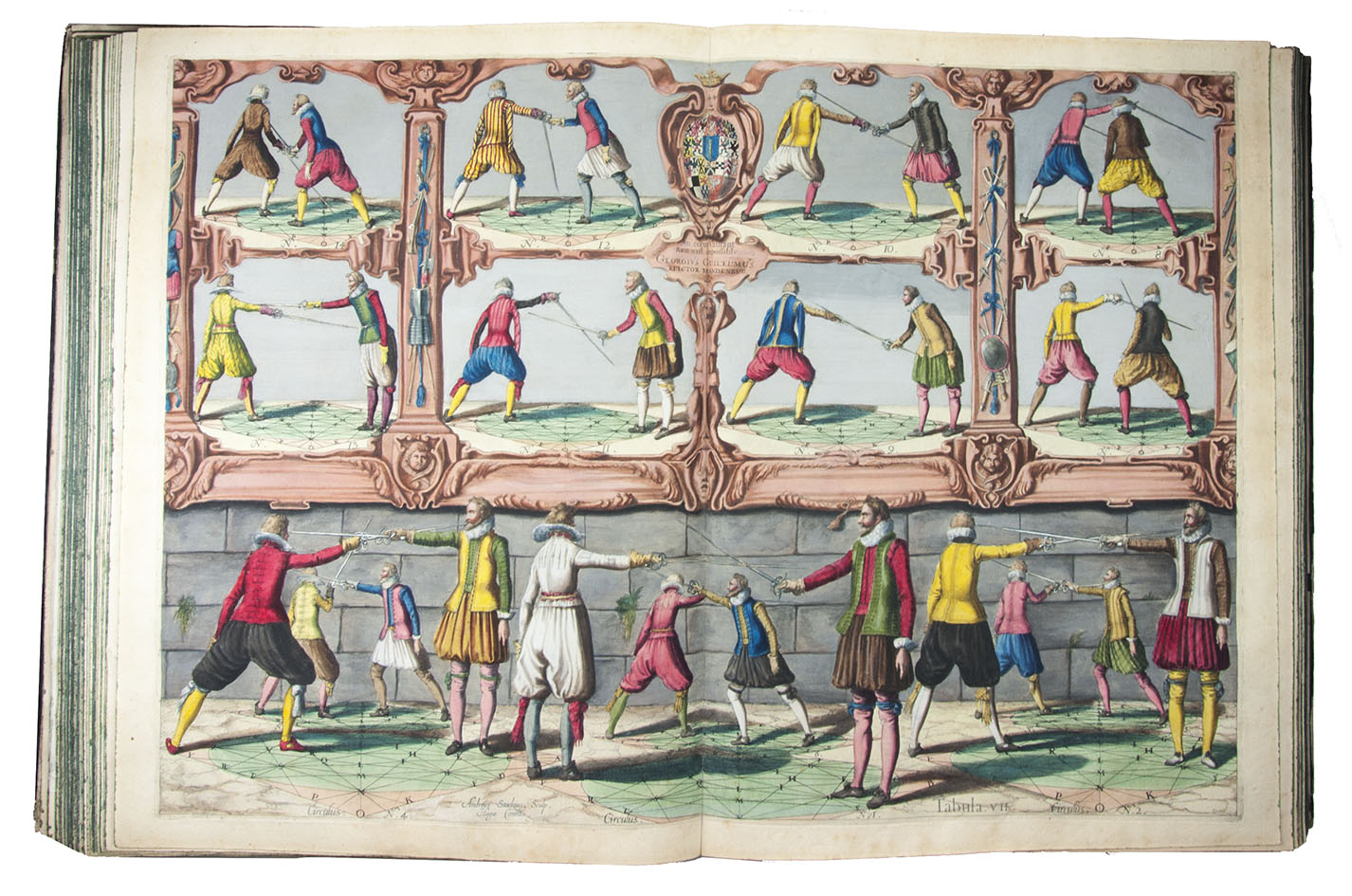 Beautifully coloured copy, by a Dutch painter closely associated with the author and the Elzeviers, of the first issue of the most sumptuous book on fencing ever produced, the Elzeviers' most ambitious undertaking, and one of the greatest show-pieces of the art of the book and the engraver's art ever. The importance of the plates and text lies not only in their beauty and craftsmanship, but also in their historical importance, for Thibault was an innovative and internationally acclaimed fencing master, and his book meticulously describes and illustrates the art of fencing just as the épée reached its zenith in Europe. Though fencing remained essential to any army officer, and was sometimes mortal for the loser, the growing use of firearms transformed it in the course of the sixteenth century from a military technique into a courtly art for noblemen and for honourable duelling, and these noblemen were of course Thibault's clientele. The last plate shows swordsmen facing opponents with firearms.