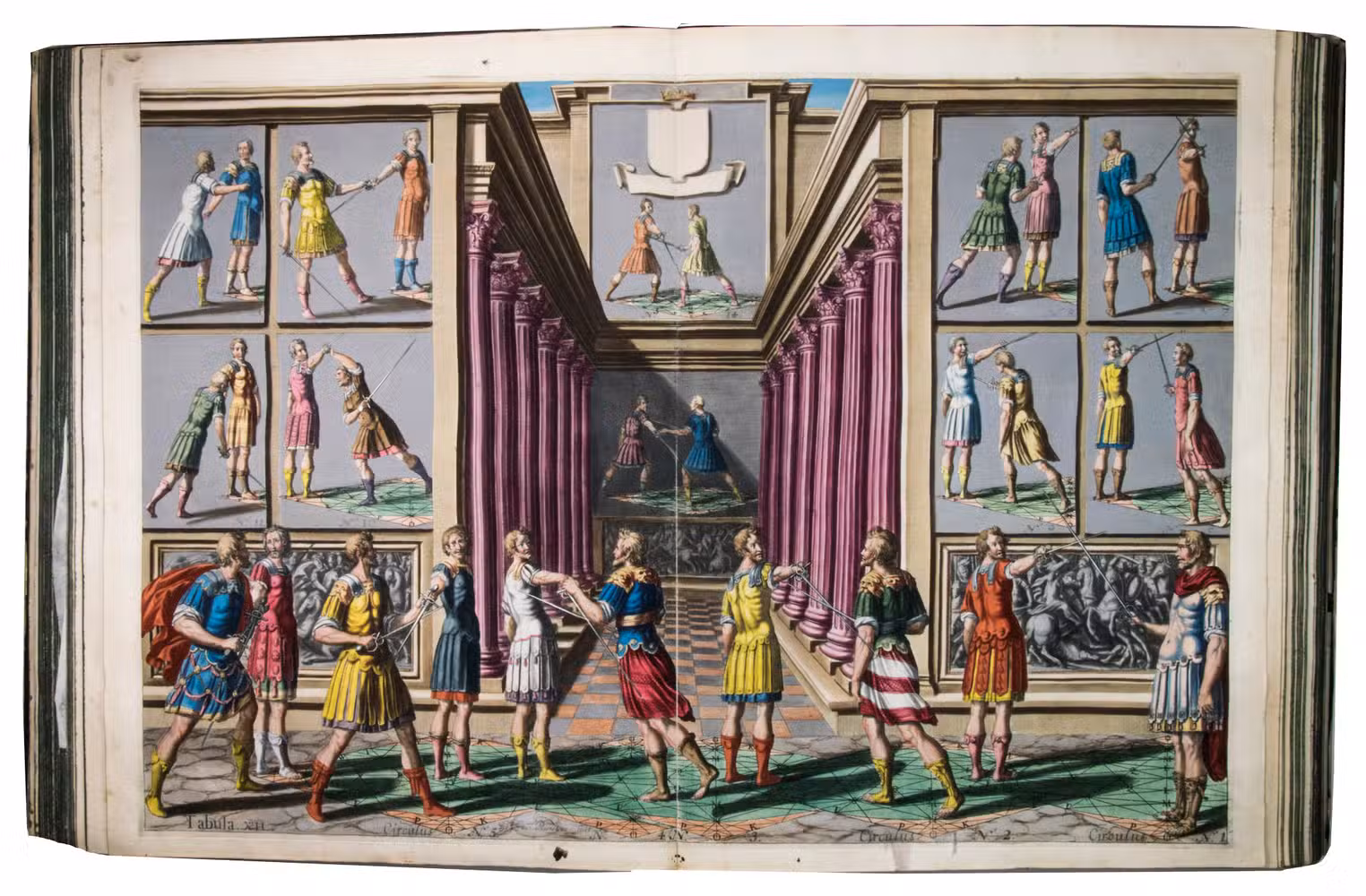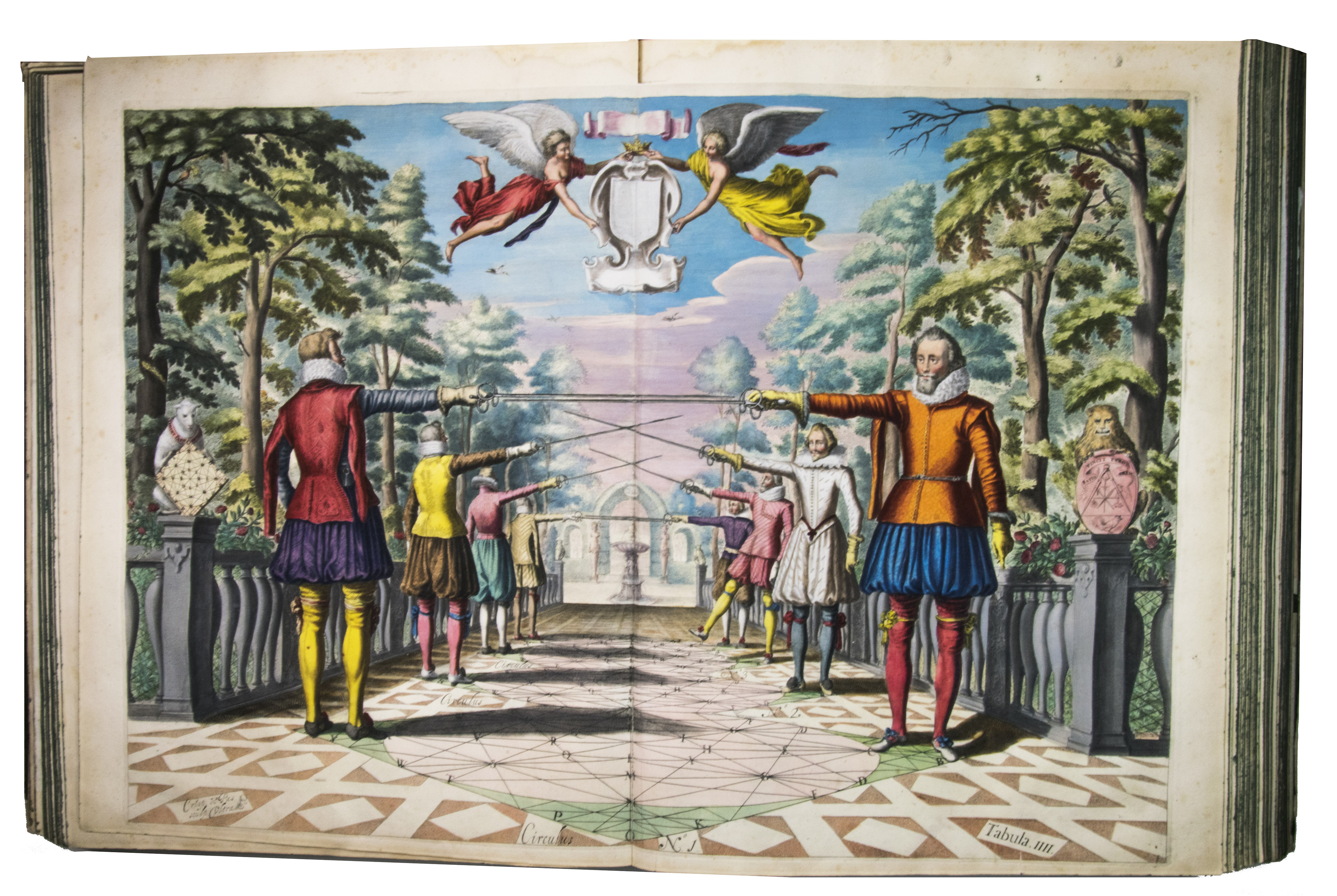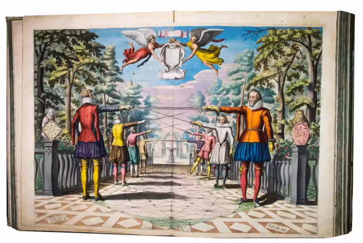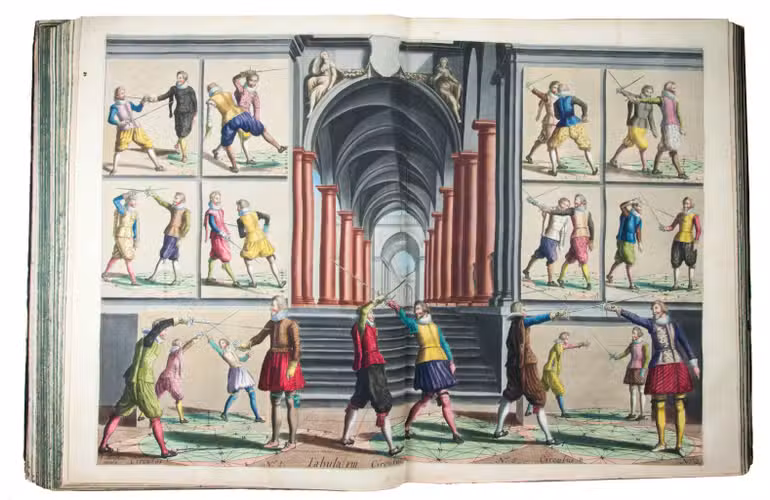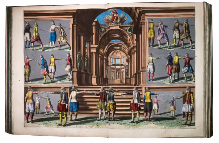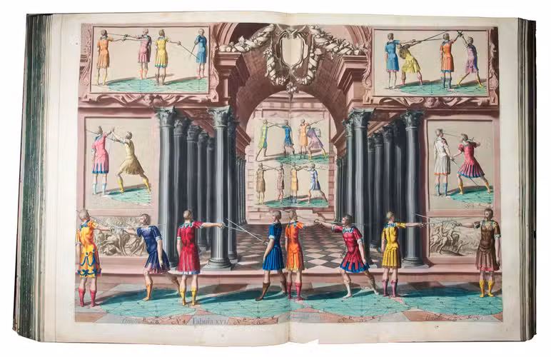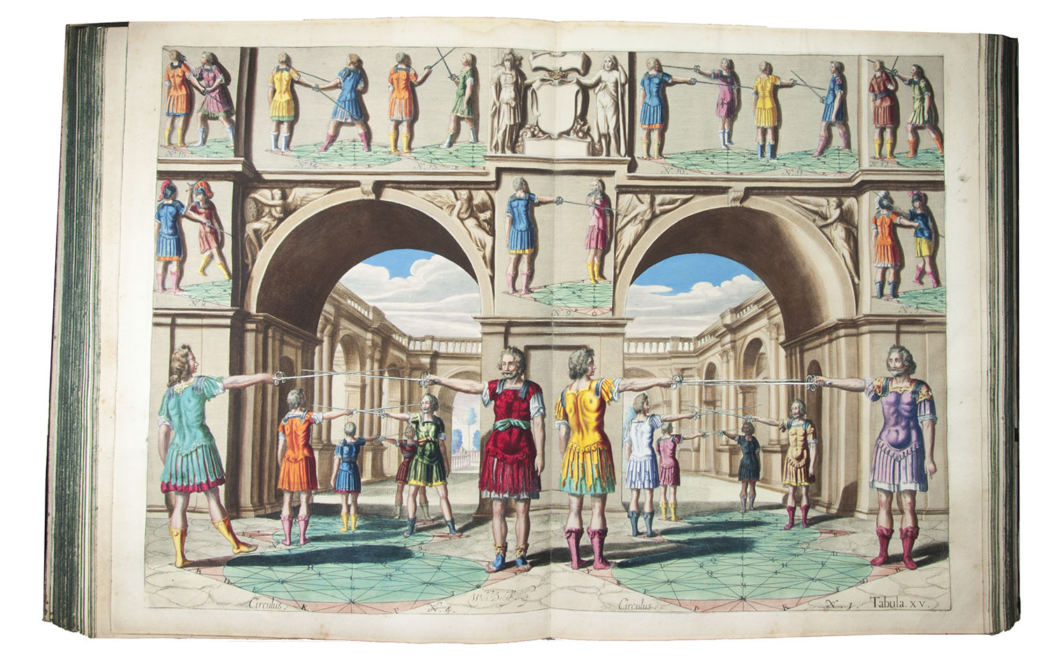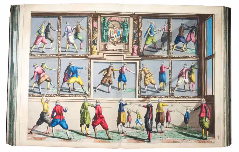 Beautifully coloured copy, by a Dutch painter closely associated with the author and the Elzeviers, of the first issue of the most sumptuous book on fencing ever produced, the Elzeviers' most ambitious undertaking, and one of the greatest show-pieces of the art of the book and the engraver's art ever. The importance of the plates and text lies not only in their beauty and craftsmanship, but also in their historical importance, for Thibault was an innovative and internationally acclaimed fencing master, and his book meticulously describes and illustrates the art of fencing just as the épée reached its zenith in Europe. Though fencing remained essential to any army officer, and was sometimes mortal for the loser, the growing use of firearms transformed it in the course of the sixteenth century from a military technique into a courtly art for noblemen and for honourable duelling, and these noblemen were of course Thibault's clientele. The last plate shows swordsmen facing opponents with firearms.