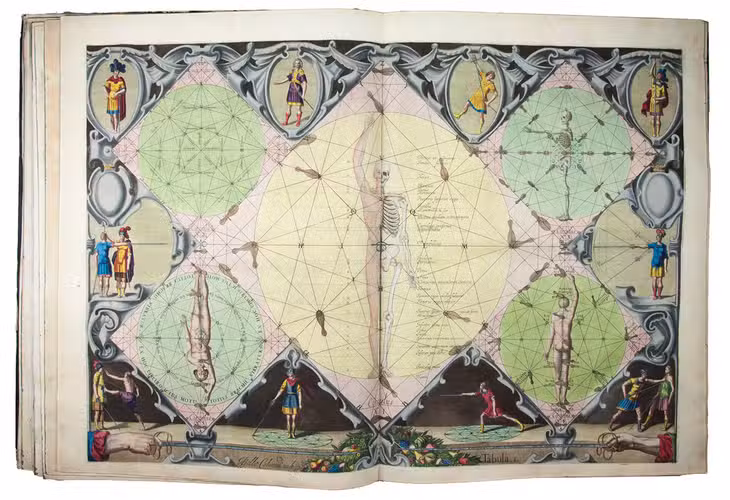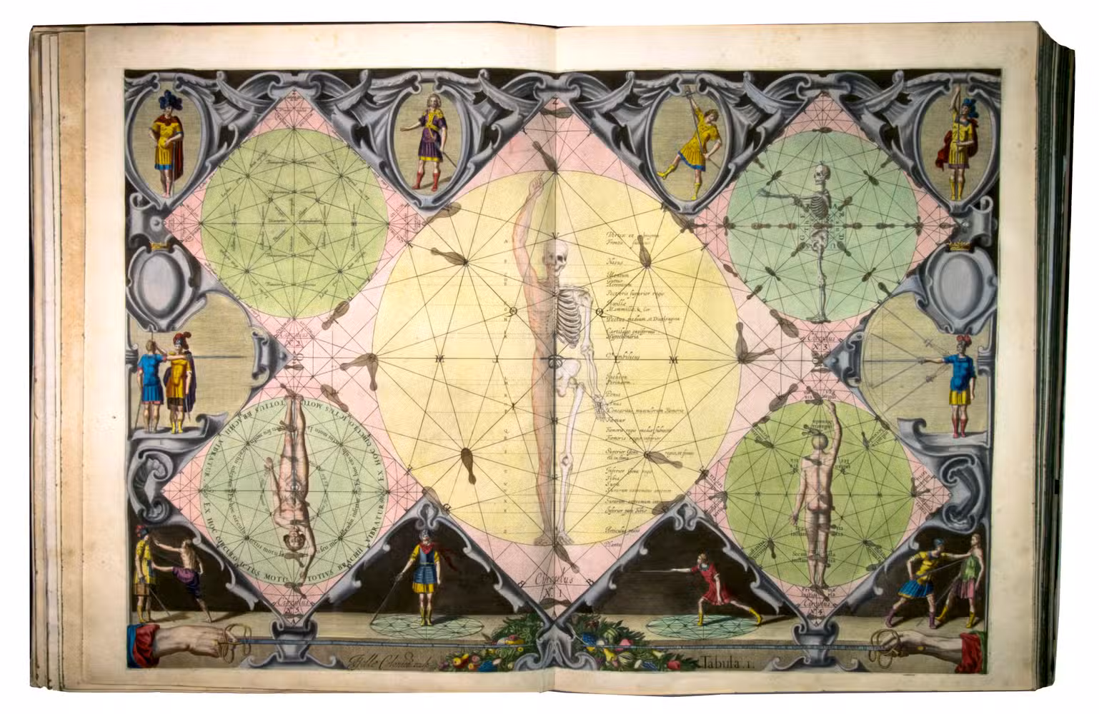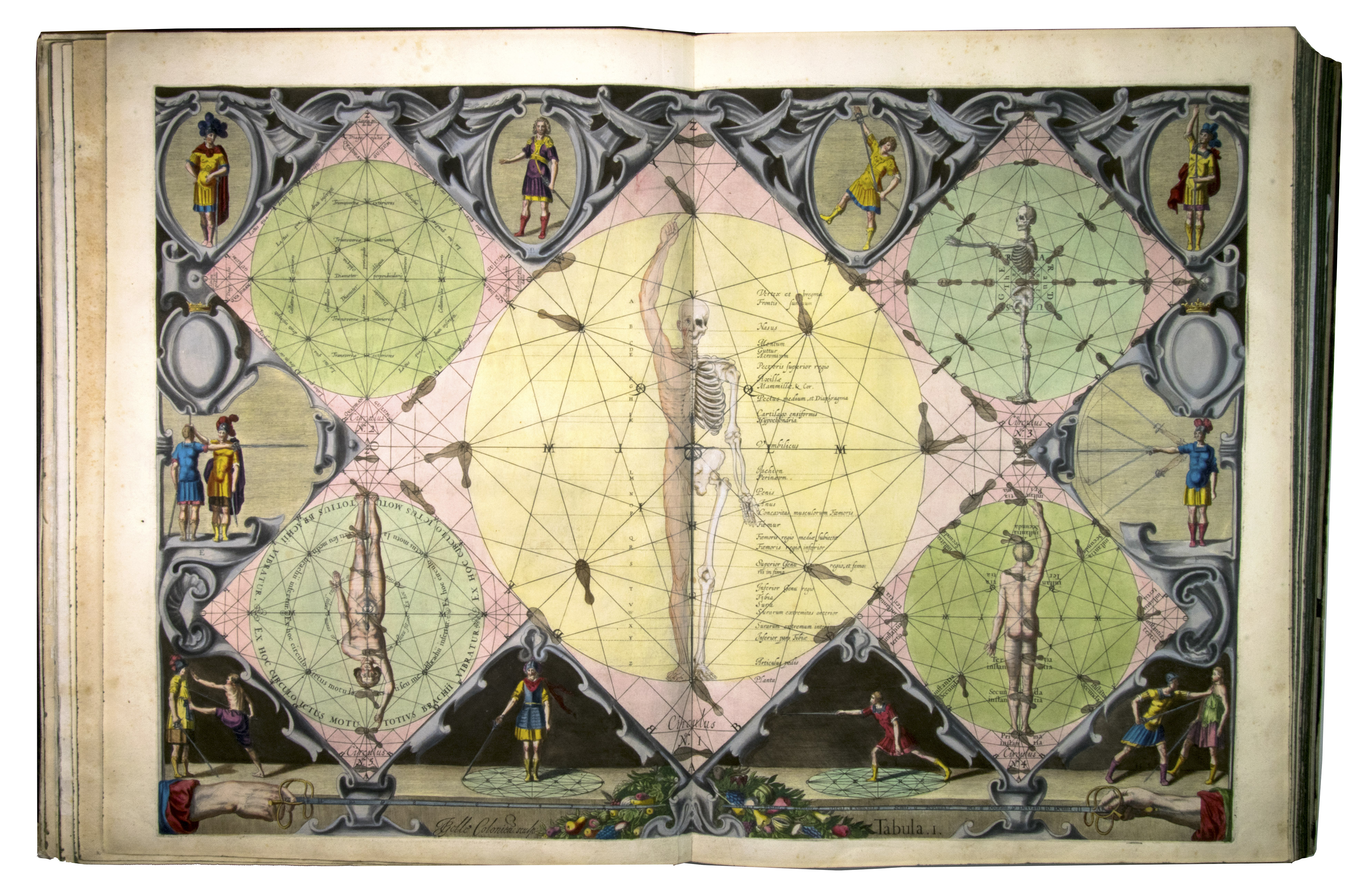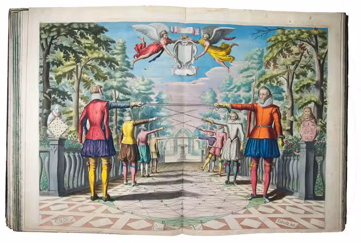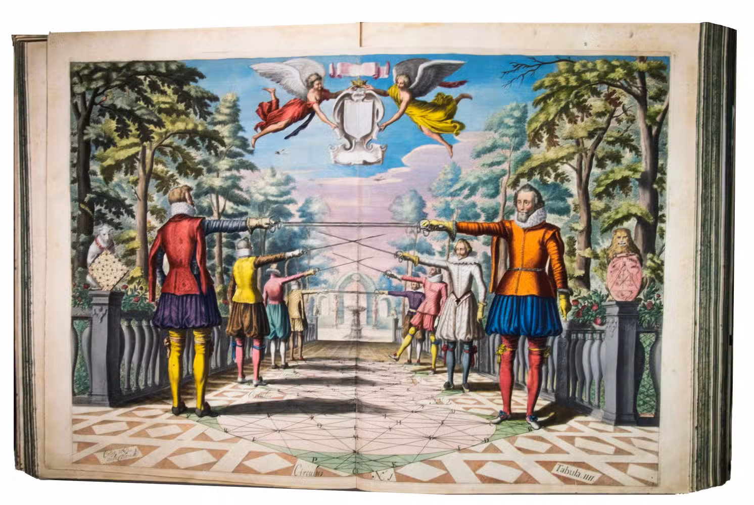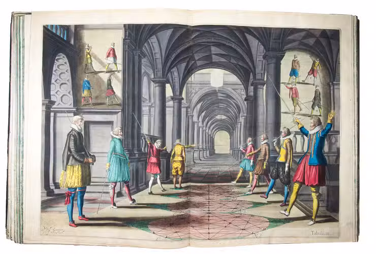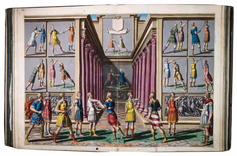 Beautifully coloured copy, by a Dutch painter closely associated with the author and the Elzeviers, of the first issue of the most sumptuous book on fencing ever produced, the Elzeviers' most ambitious undertaking, and one of the greatest show-pieces of the art of the book and the engraver's art ever. The importance of the plates and text lies not only in their beauty and craftsmanship, but also in their historical importance, for Thibault was an innovative and internationally acclaimed fencing master, and his book meticulously describes and illustrates the art of fencing just as the épée reached its zenith in Europe. Though fencing remained essential to any army officer, and was sometimes mortal for the loser, the growing use of firearms transformed it in the course of the sixteenth century from a military technique into a courtly art for noblemen and for honourable duelling, and these noblemen were of course Thibault's clientele. The last plate shows swordsmen facing opponents with firearms.