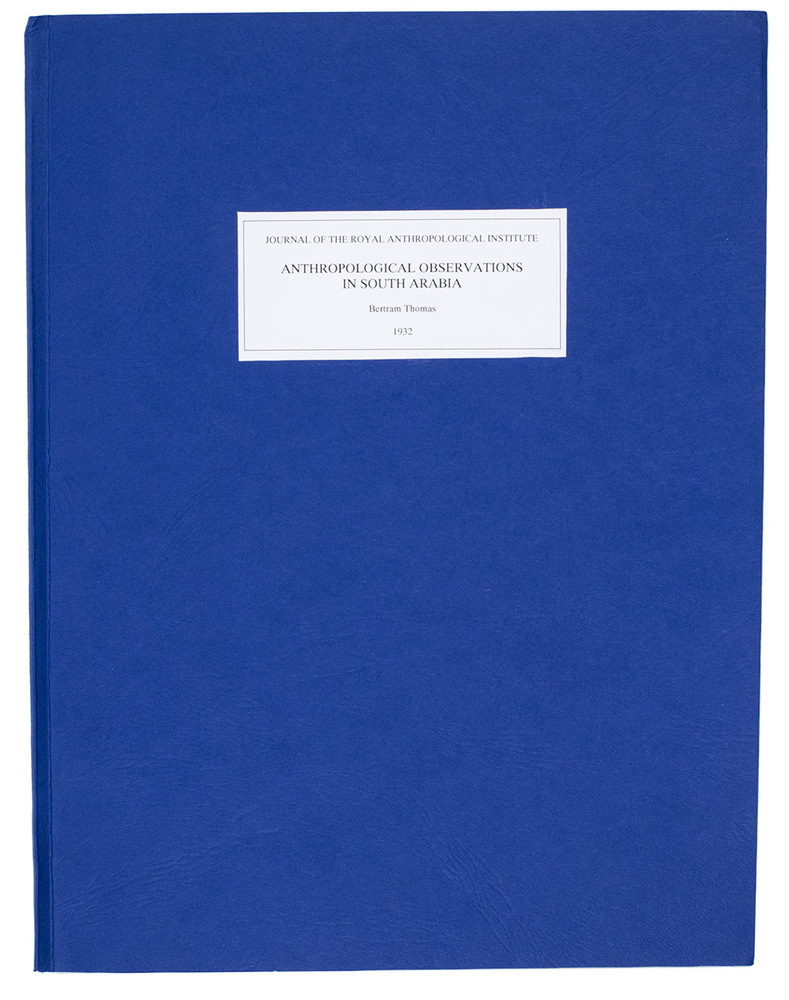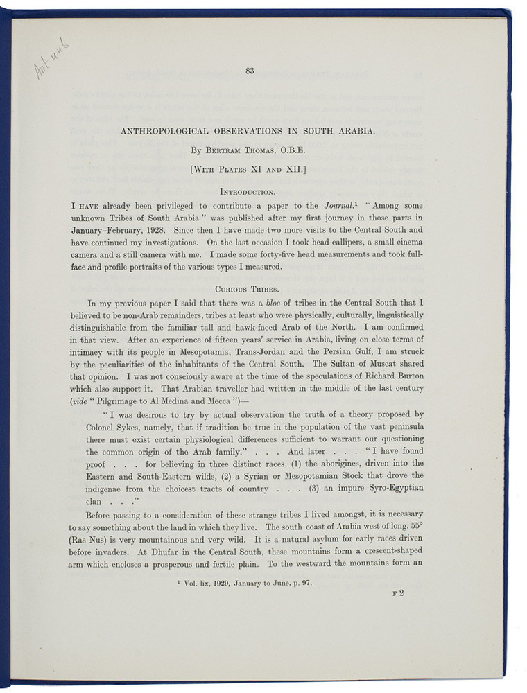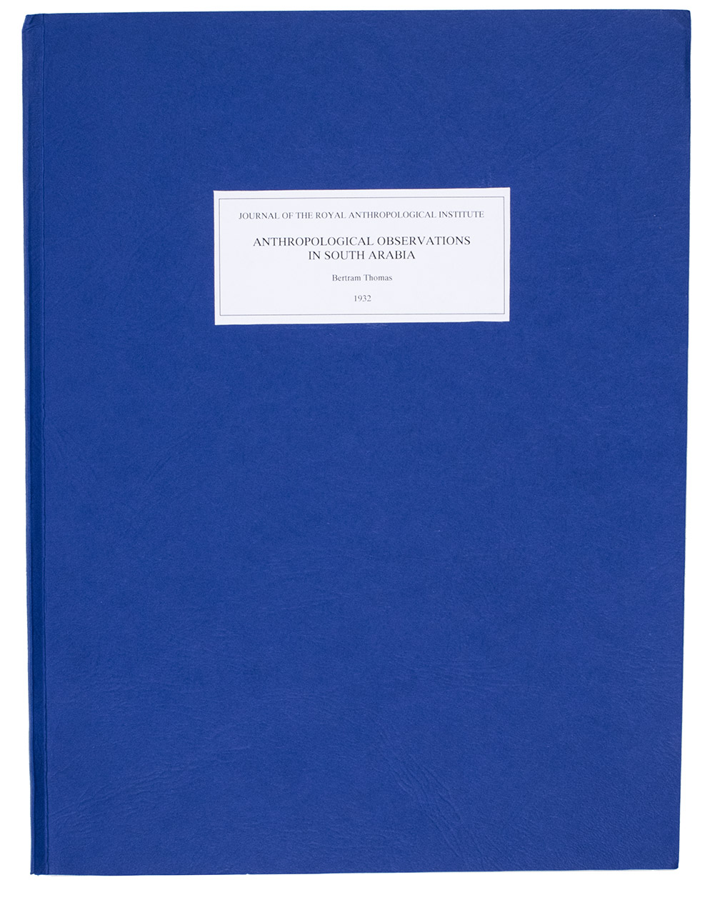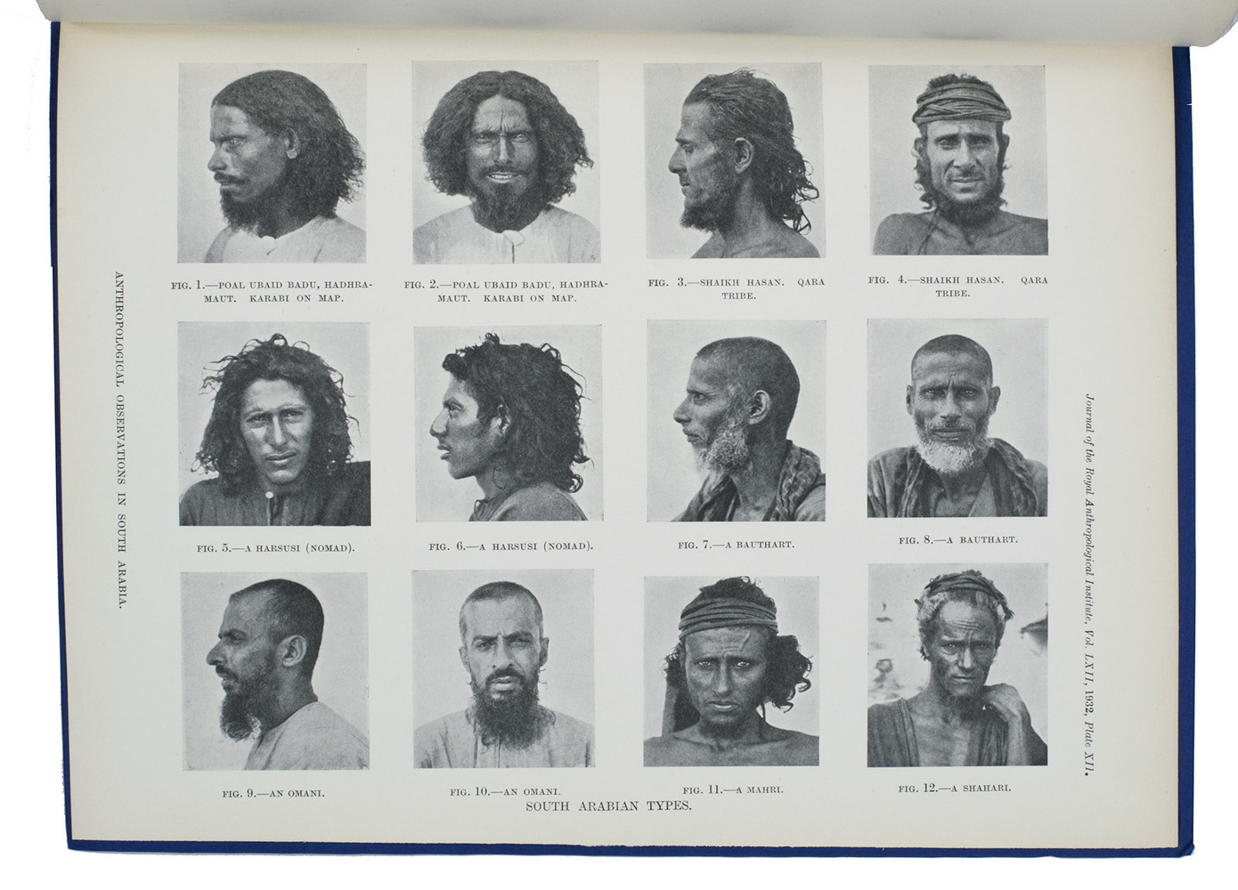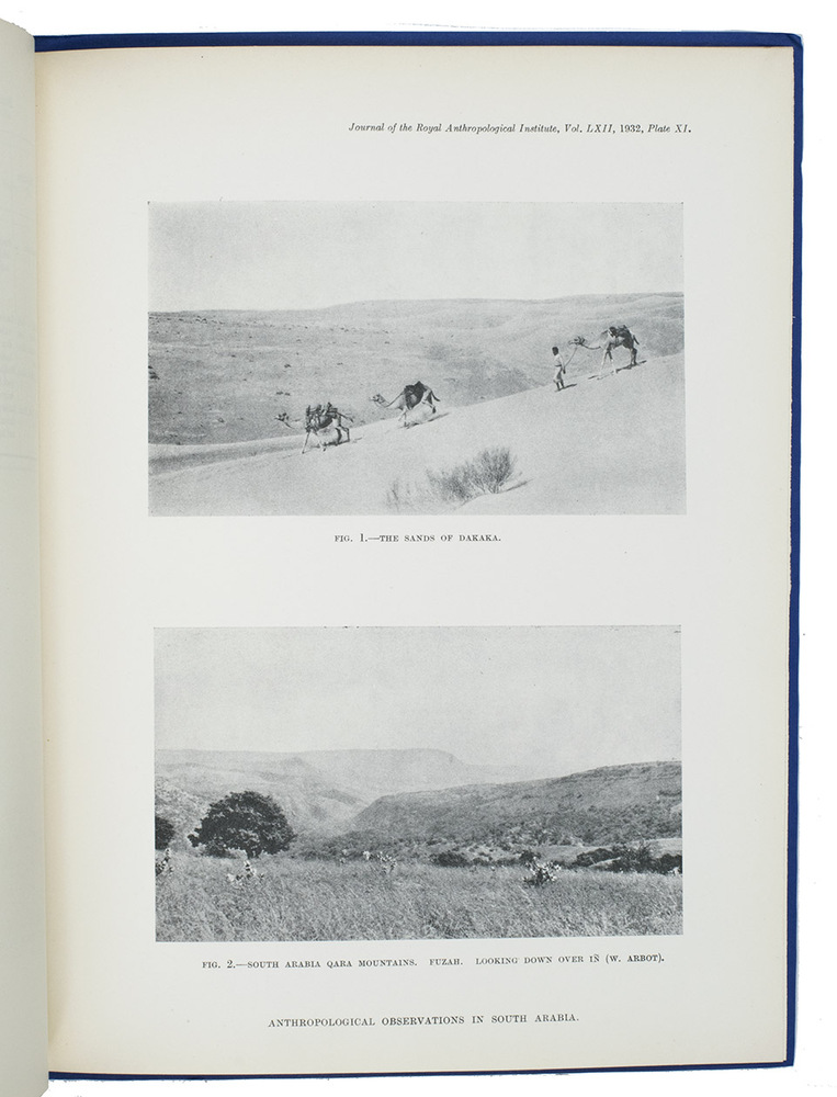 [offprint from:] Journal of the Royal Anthropological Institute 42 (1932). Large 8vo. With 2 plates (XI-XII) from photographs: (1) two views on the landscapes of the Sands of Dakara and the Qara Mountains, Arabia; (2) 12 portraits of members of the various tribes of Southern Arabia/Jemen. Blue wrappers with printed title label on the front cover. 83-108 pp.