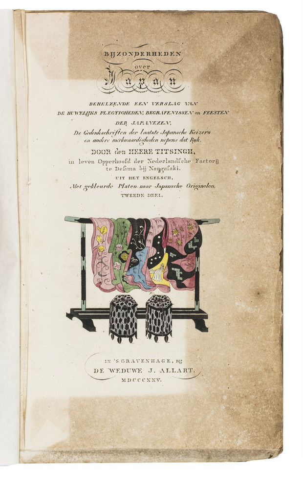 Titsingh was a diplomat, historian, and merchant, who had a great interest in Japan. He moved to the East Indies in 1766 and stayed for most of his life. He spent a total of three years and eight months in Japan between 1778-1788, and amassed a large collection of authentic source materials on Japan during this time, including printed books, manuscripts, prints, maps, city plans and coins. He came back to Holland in 1809, but quickly moved to Paris on account of the political situation. In Paris he began preparations for a monumental work on Japan, based on the artefacts in his collection, as well as his own notes, but he died suddenly in 1812. When his son Willem went bankrupt, he sold his father's collection, which was then scattered all over Europe. Both a French and English publisher must have acquired some of the material, as selections of it were printed in both countries. They were published in two volumes in Paris as Cérémonies usitées en Japon pour les mariages et les funérailles (1819), and Mémoires et anecdotes de la dynastie regnante des Djogouns (1820). The London edition, Illustrations of Japan (1822), which was only printed in one volume, was not a direct translation of the French works, but clearly used the same source material. The present Dutch version is a translation of the English edition. Due to the impact of his collection and scholarly activities, Titsingh can be seen as the founder of European Japanology.