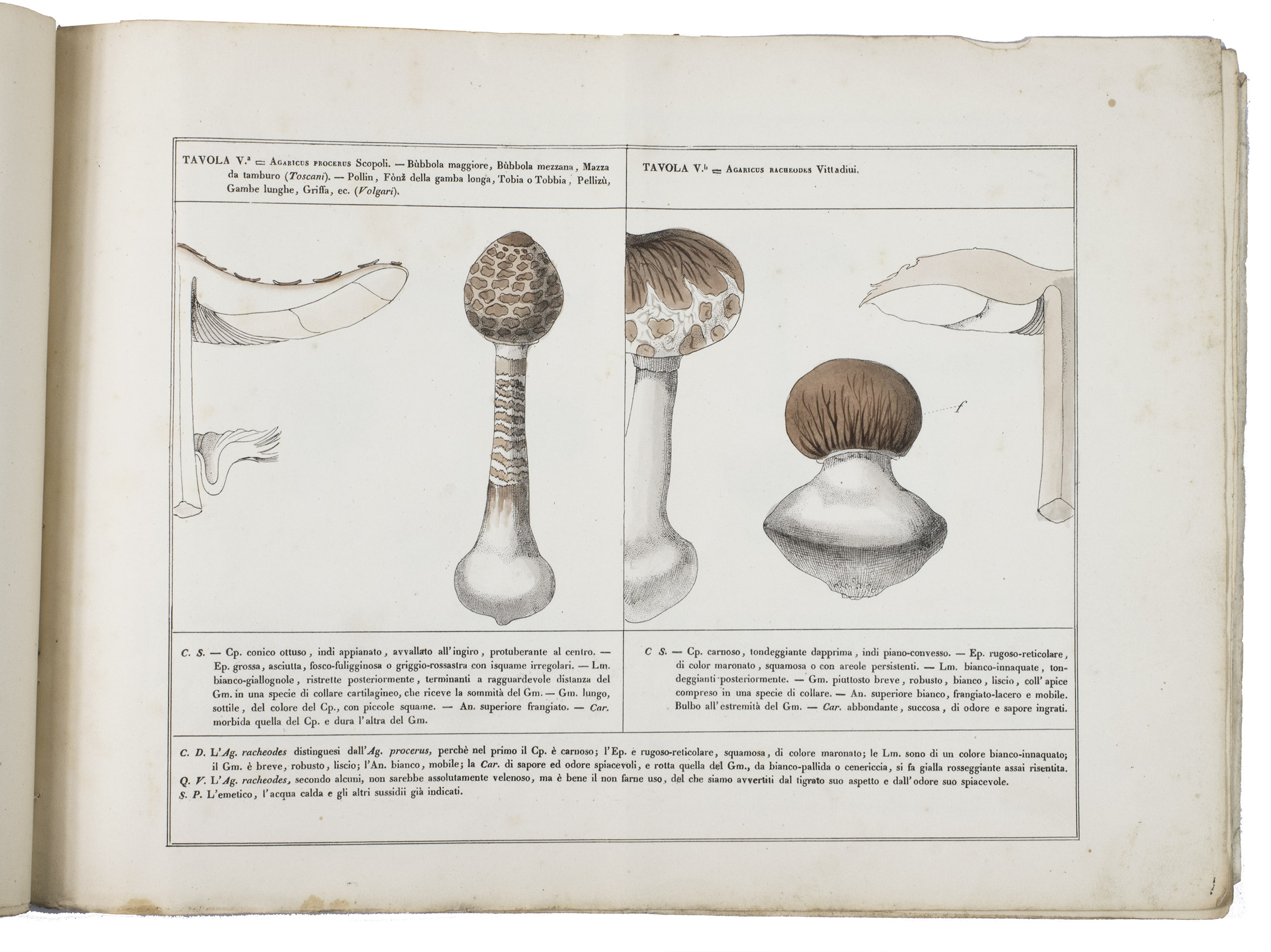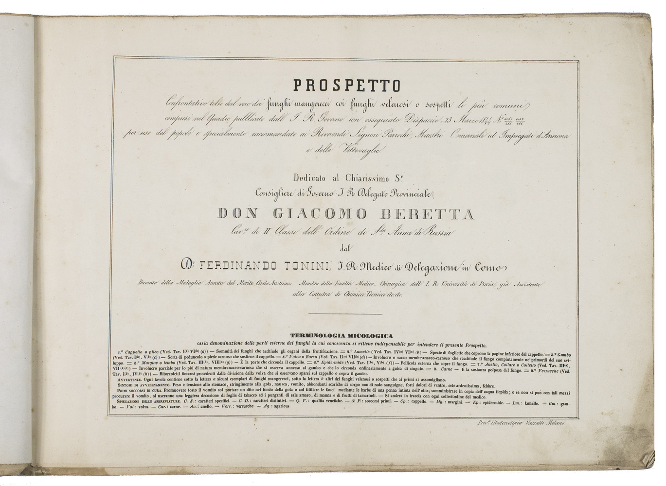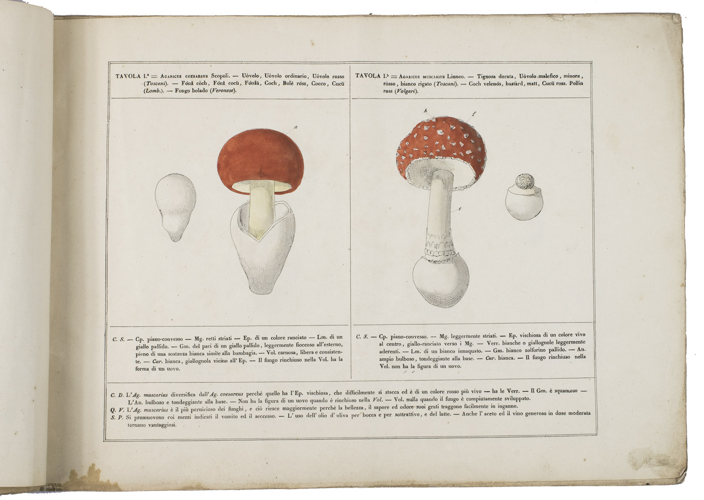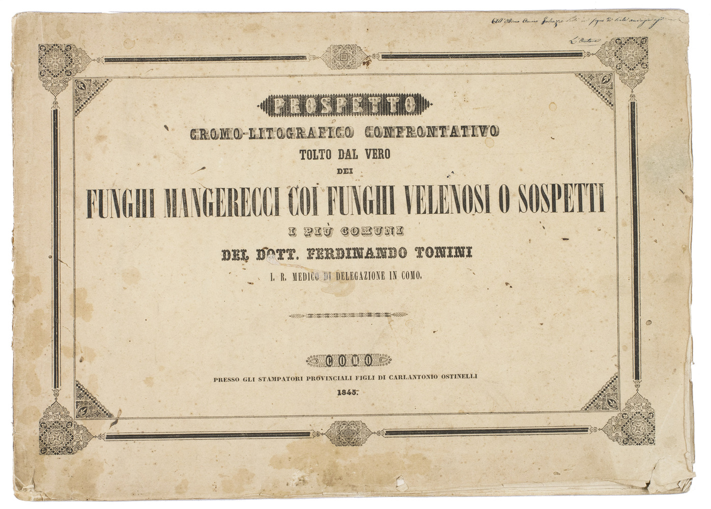 Extremely rare first issue of this Italian publication on edible and poisonous fungi, with hand-coloured lithographed illustrations (not chromolithographs as stated in the title) and the author's hand-written presentation inscription on the wrappers. The title used on the title-page differs slightly from that on the title-wrappers, omitting "cromo-litografíco", and contains a dedication to Don Giacomo Beretta. It was reissued in 1846, with new title-wrappers.