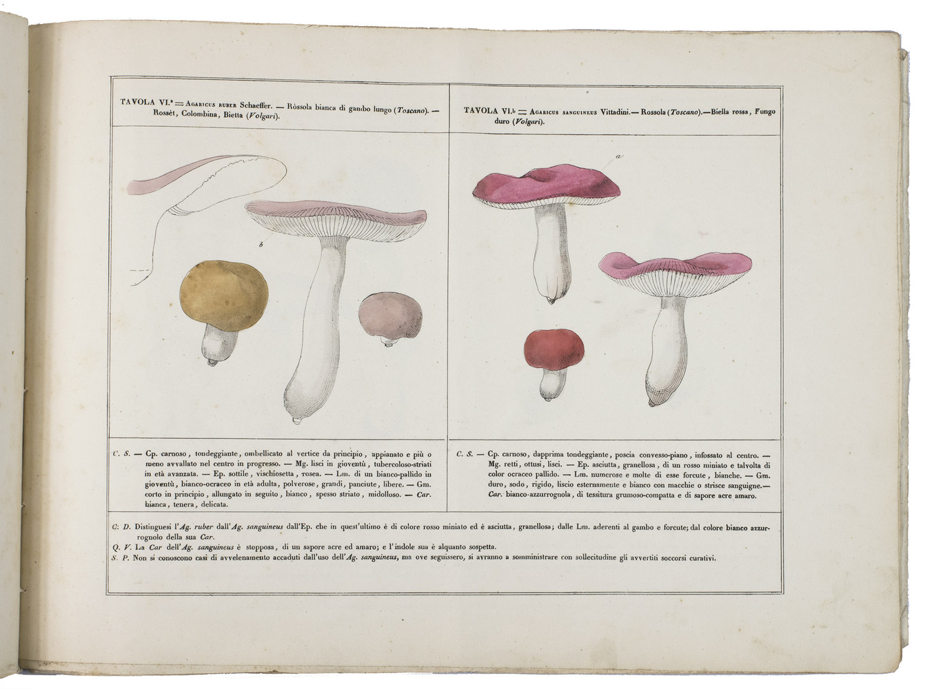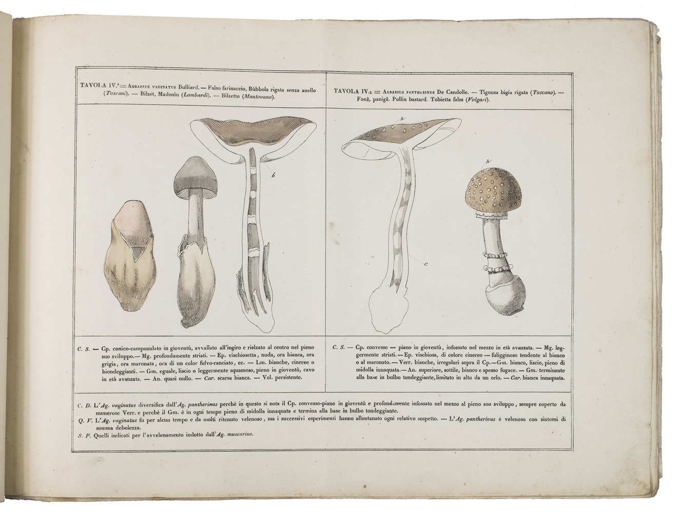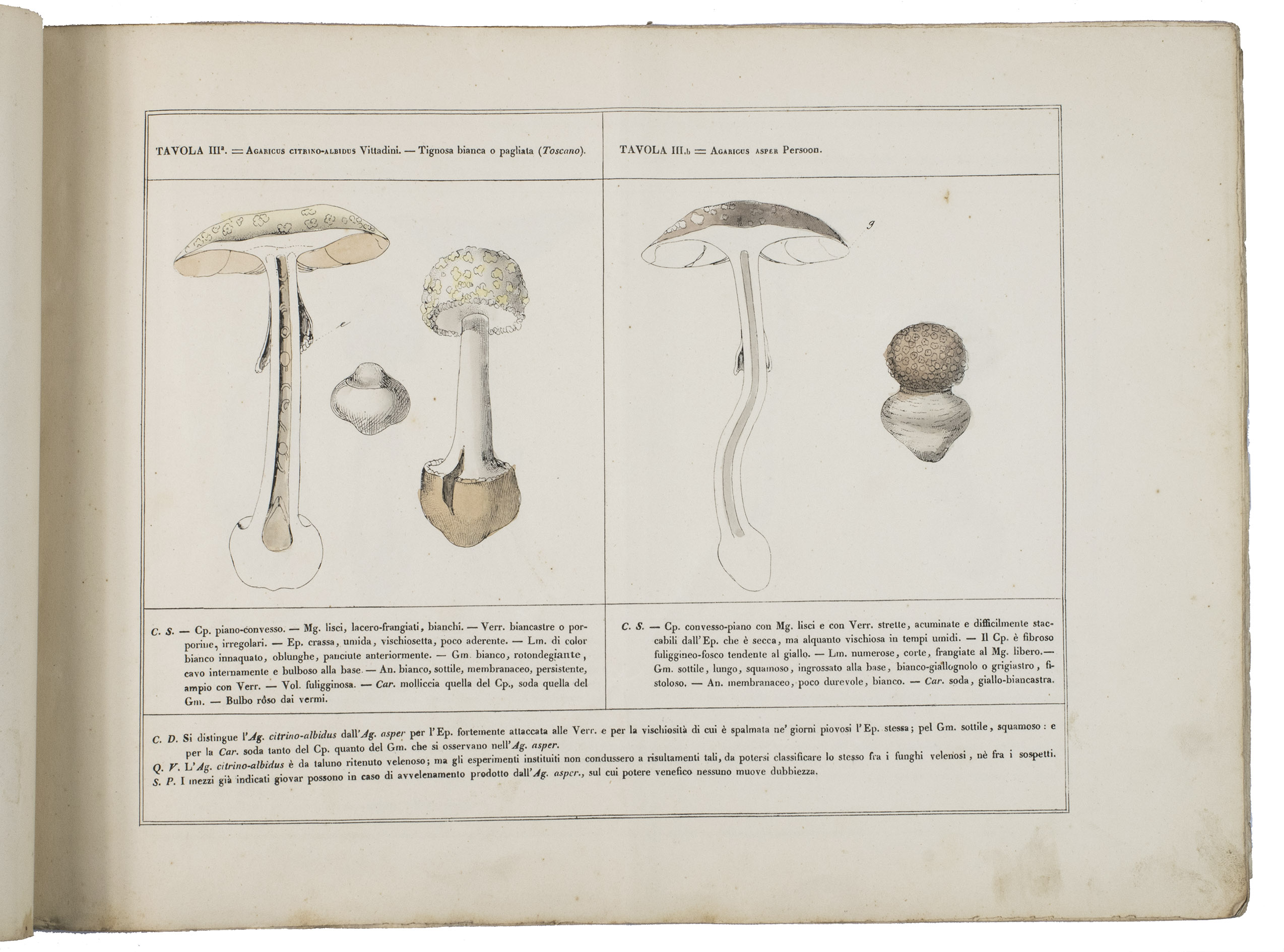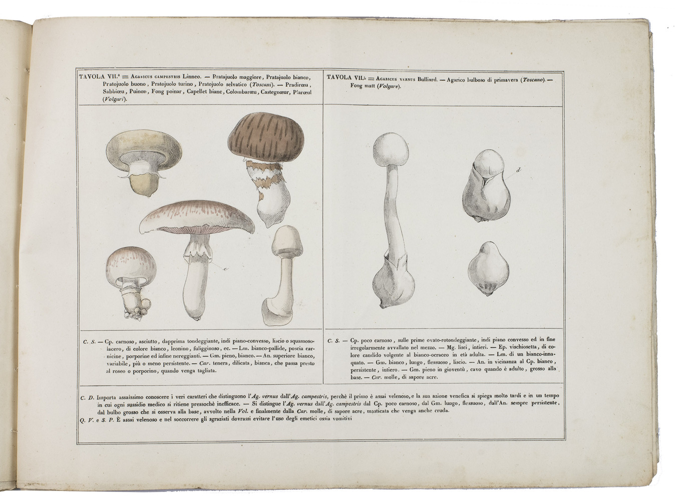 Extremely rare first issue of this Italian publication on edible and poisonous fungi, with hand-coloured lithographed illustrations (not chromolithographs as stated in the title) and the author's hand-written presentation inscription on the wrappers. The title used on the title-page differs slightly from that on the title-wrappers, omitting "cromo-litografíco", and contains a dedication to Don Giacomo Beretta. It was reissued in 1846, with new title-wrappers.