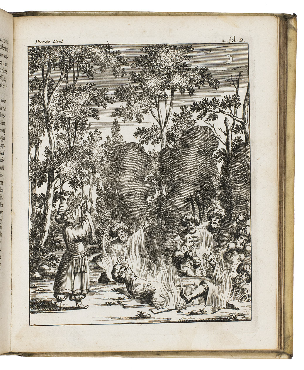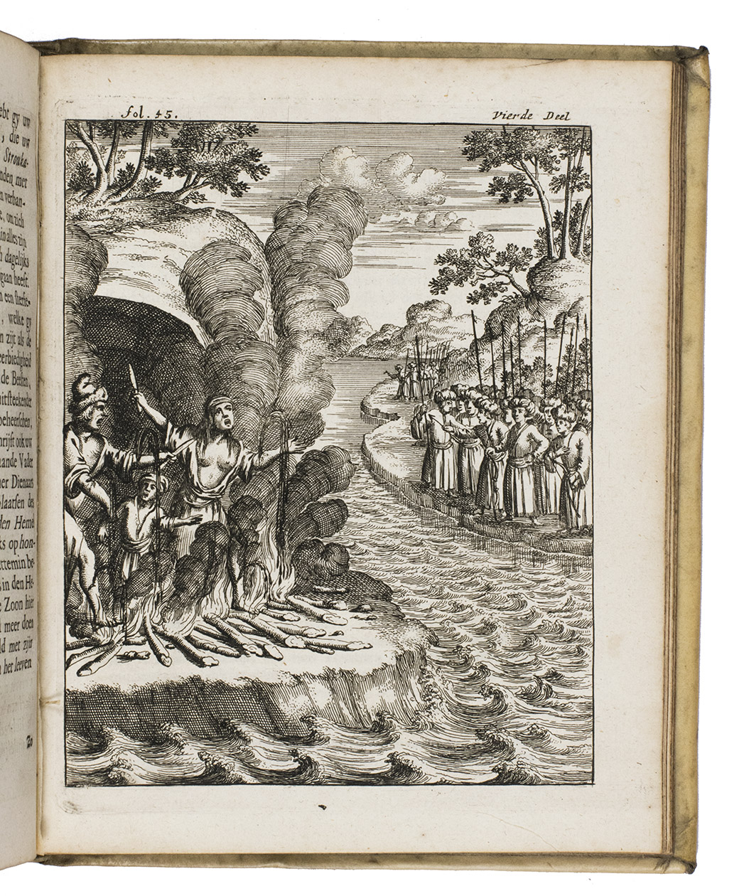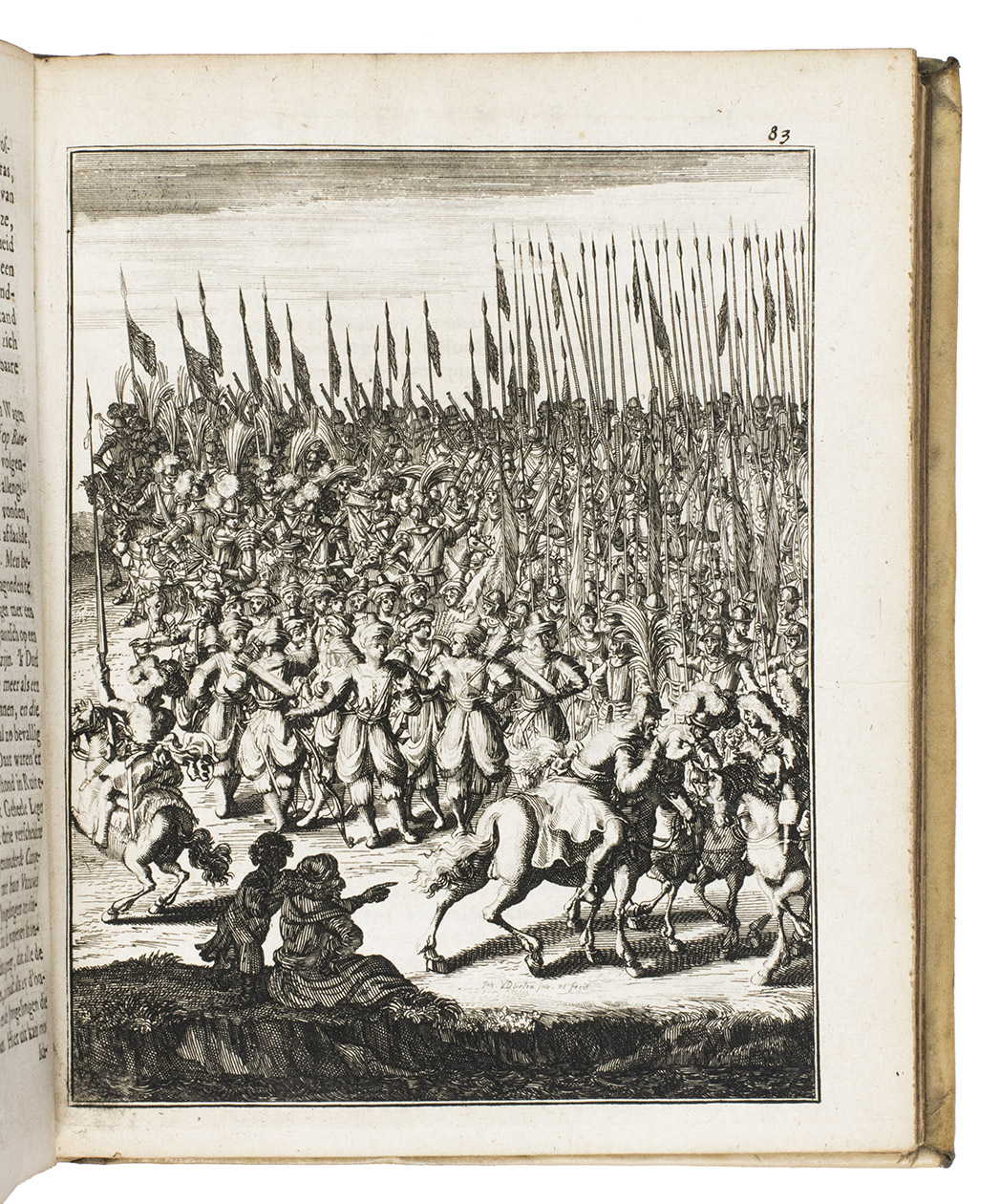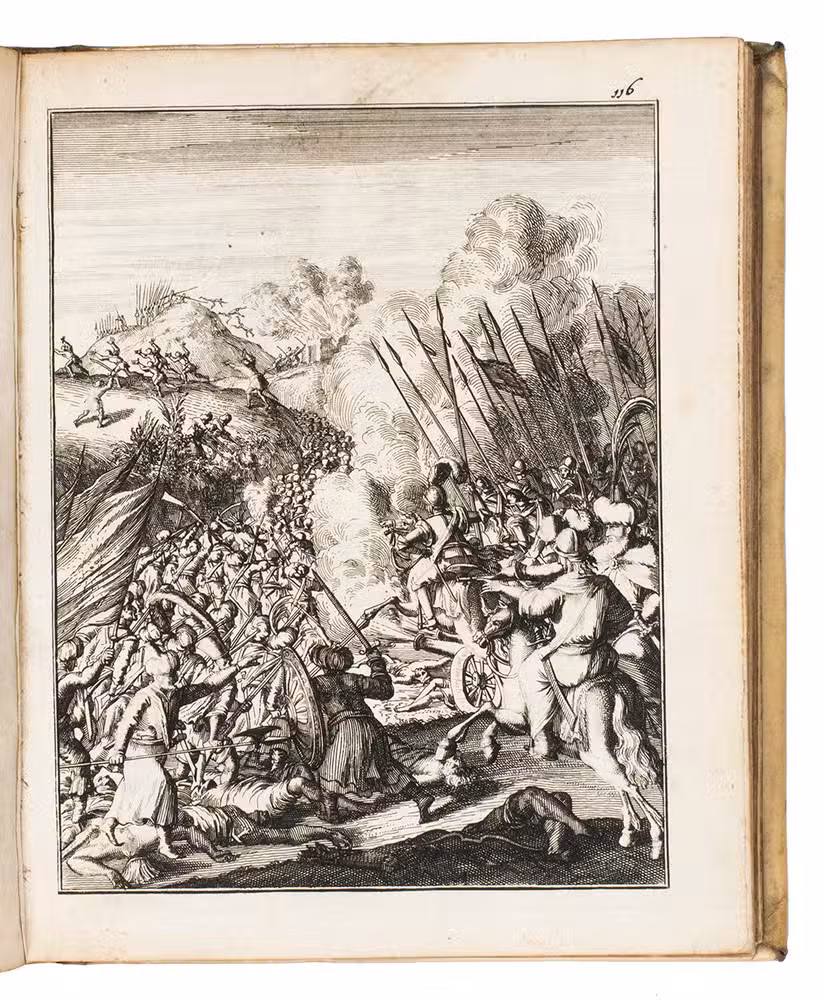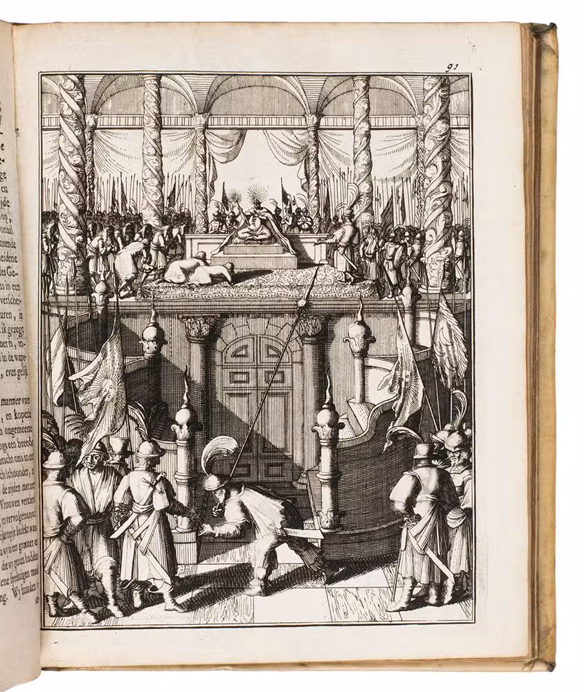 Amsterdam, Timotheus ten Hoorn, 1682. 4 parts in 1 volume. 4to. With an engraved title-page by Jan Luiken (dated 1683), 16 engraved plates (including 4 signed by J. vanden Aveele), some decorated woodcut initials, ornamental woodcut tailpieces and three divisional title-pages for parts 2-4. Contemporary vellum. [1], [1 blank], [1], [1 blank], [12], 253, [1 blank]; 96 pp.