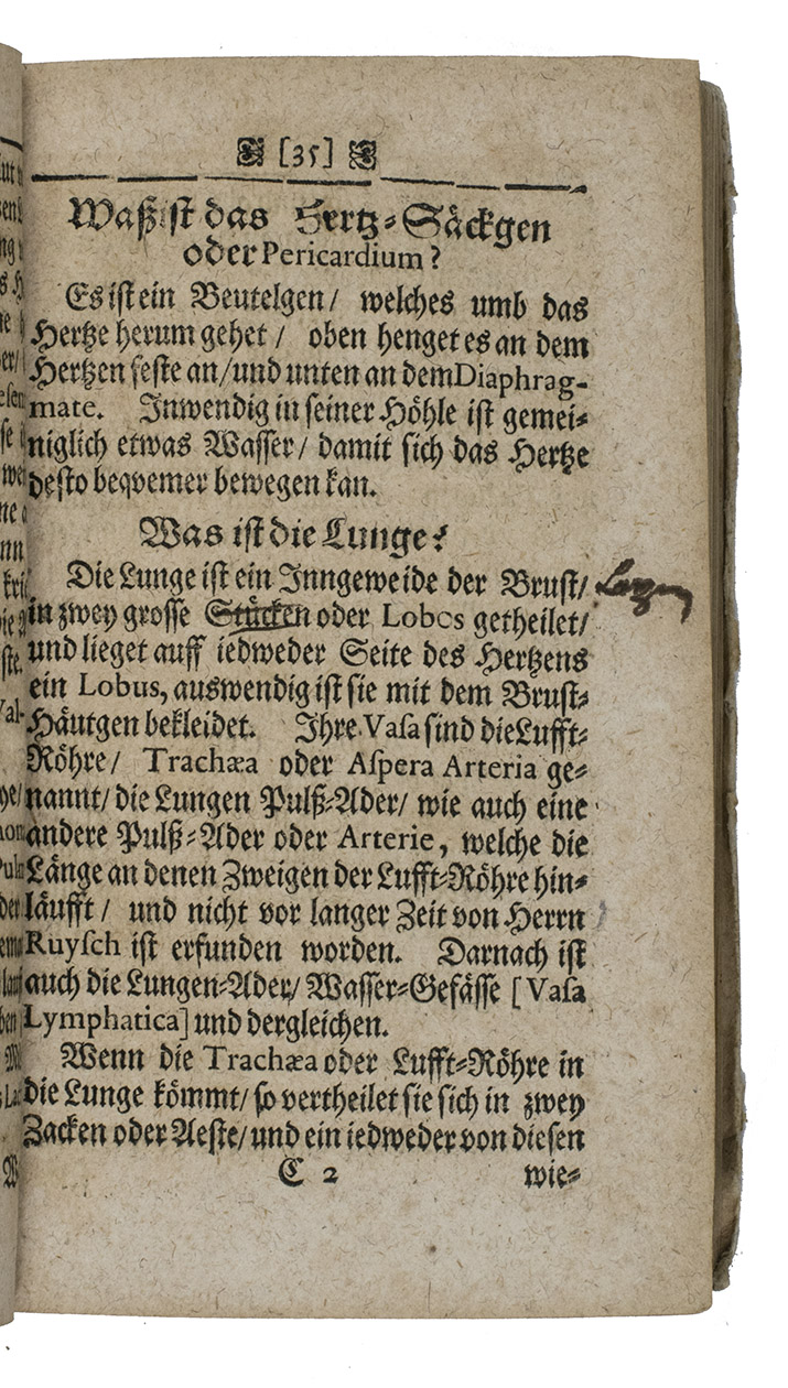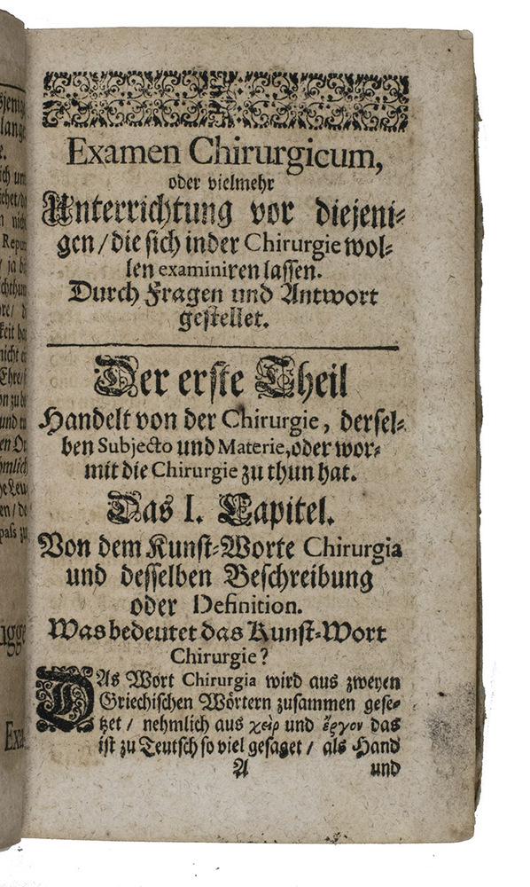First edition in German of a surgical work by the Dutch surgeon Johannes Verbrugge (ca. 1633-1681). The work covers surgical procedures both on land and at sea, starting with the more basic information: where to find specific organs and what surgical tools are available. It also deals with more practical matters: how to fix things like broken ribs or a broken nose, and how to cure specific diseases. The text was used by the VOC and the WIC on their voyages, and includes diseases that could be found on "foreign coasts", like Greenland and New Guinea. The original Dutch edition, entitled Examen van land- en zeechirurgie..., was first printed at Amsterdam in 1674, and was reprinted many times during the following era. The Dresden based physician Martin Schurig (1656-1733) translated it into German.