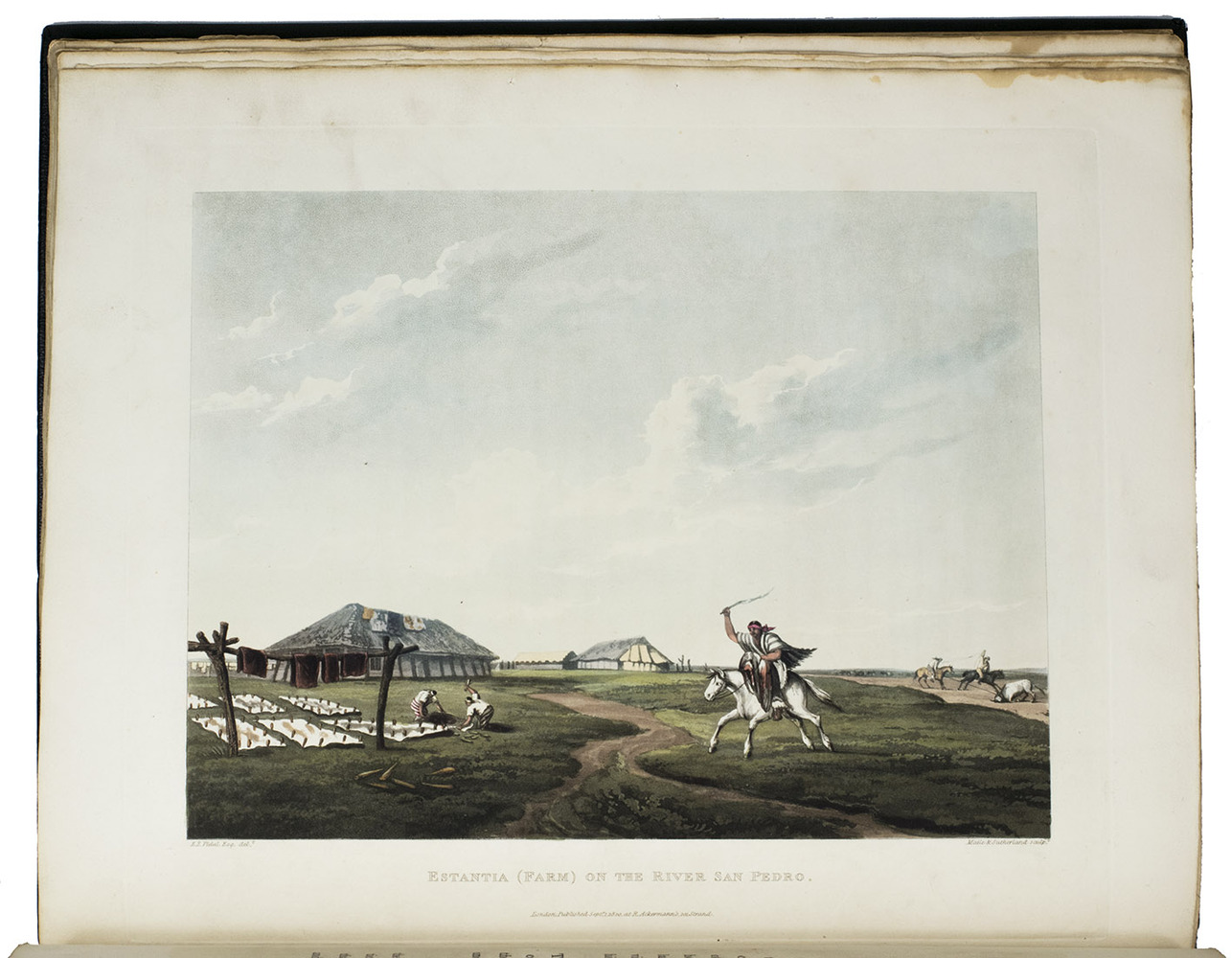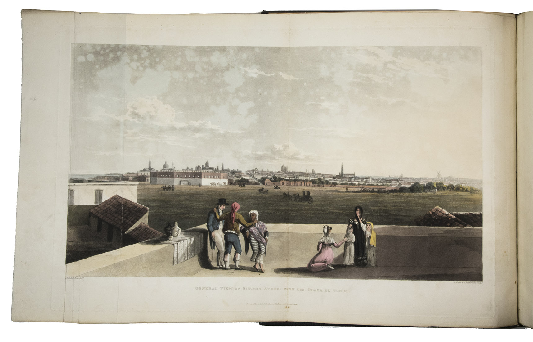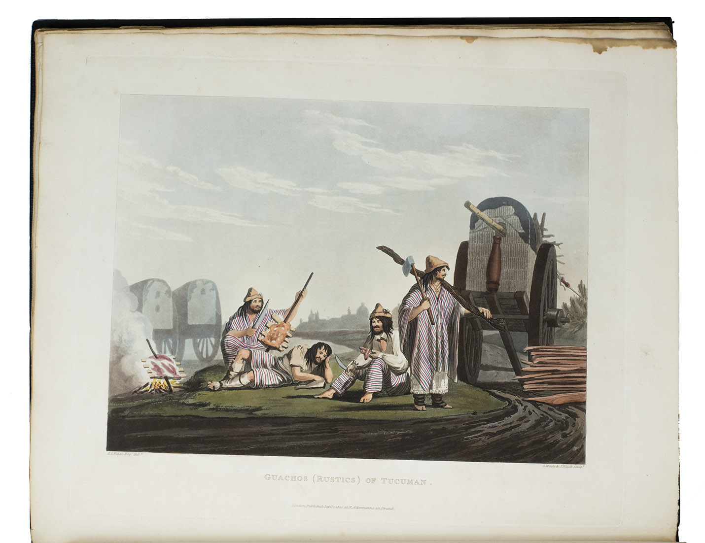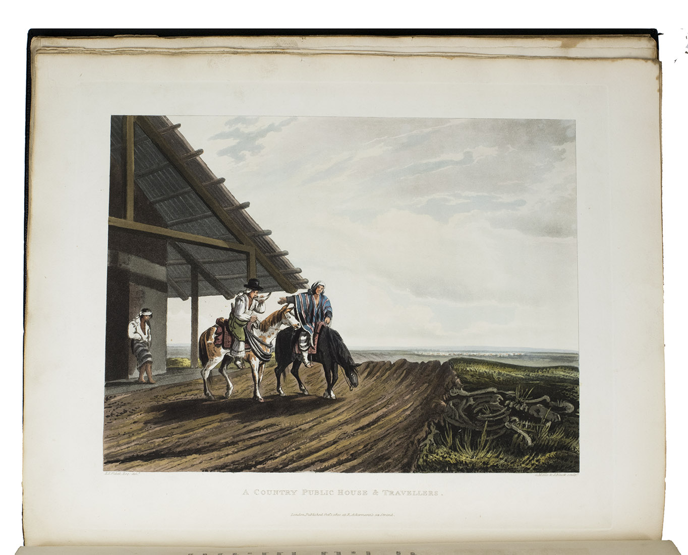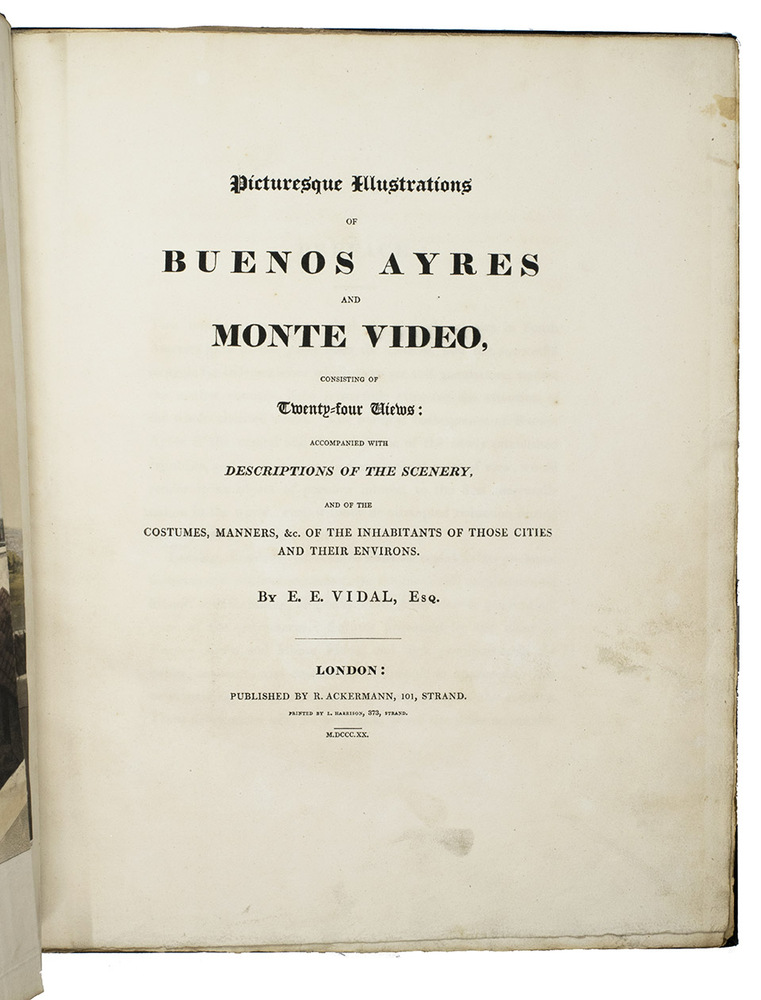 First printing of beautiful hand-coloured aquatint views of Argentina, all conceived and drawn from life by Emeric Essex Vidal in the years 1816 to 1818, accompanied by descriptions of the scenery, costumes and habits of the peoples and regions depicted. The plates were executed by various engravers between May and October 1820 and first issued in 6 monthly parts. 750 copies, including the present, were issued in Elephant 4to format. There was also an issue in Atlas folio and apparently a reprint in large and small 4to, still dated 1820, not normally distinguished in the literature from the present first printing (Palau and Sabin describe the work as a folio, but the Elephant 4to is often described as a folio). Tooley notes "the importance of its subject" and describes this publication as "the only notable colour plate book in English dealing with the Argentine".