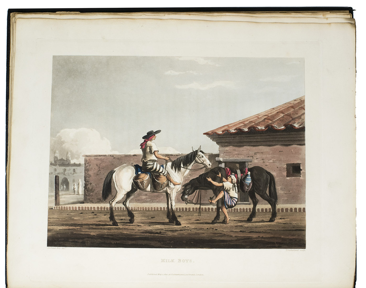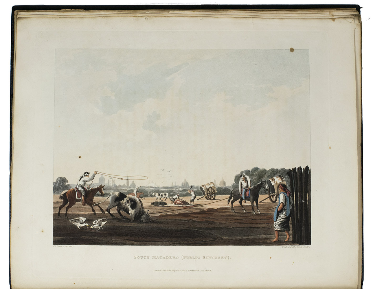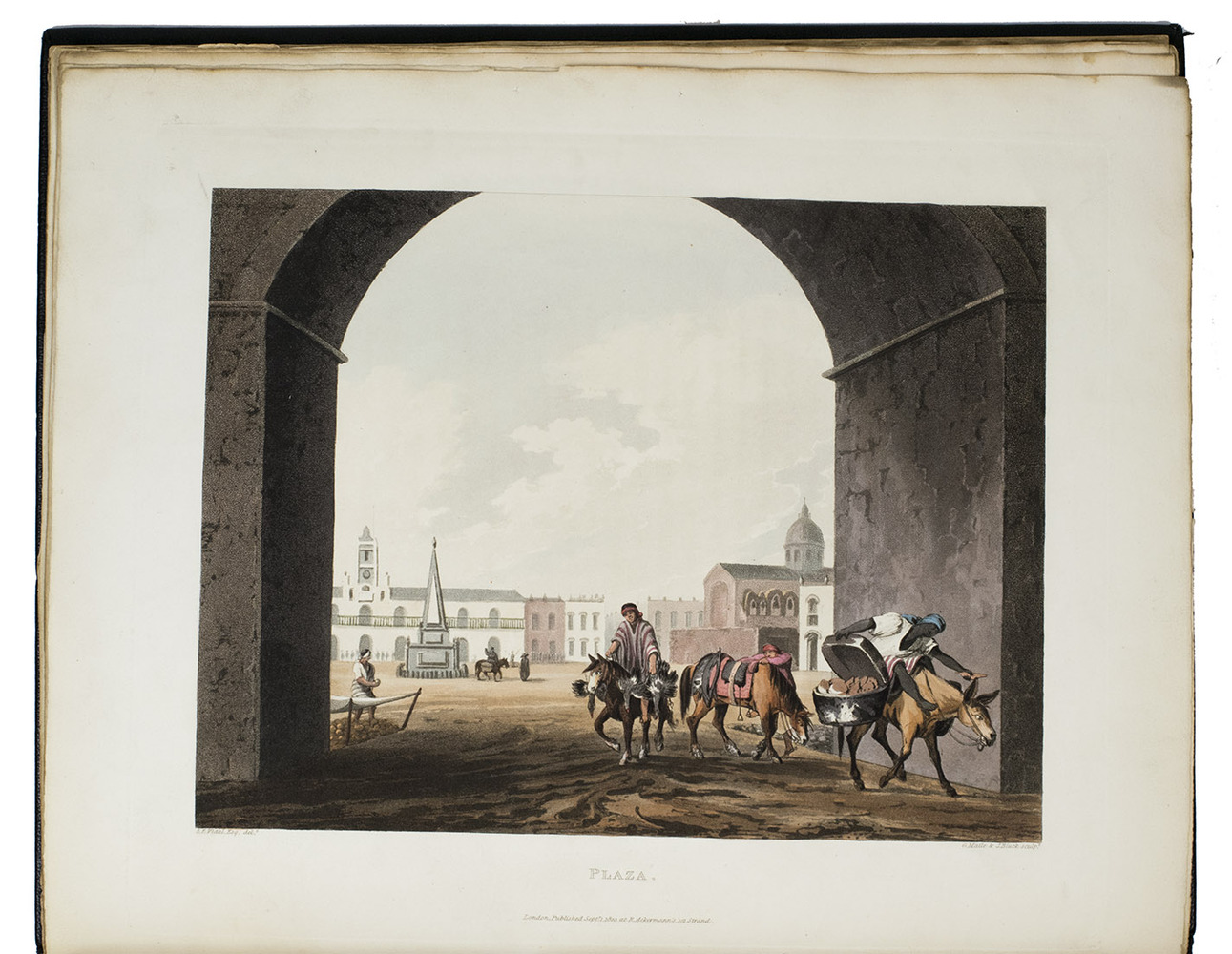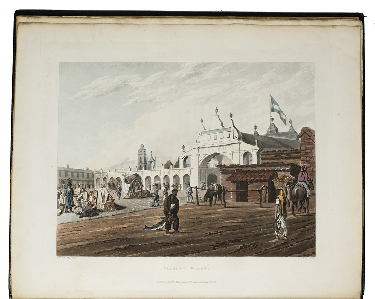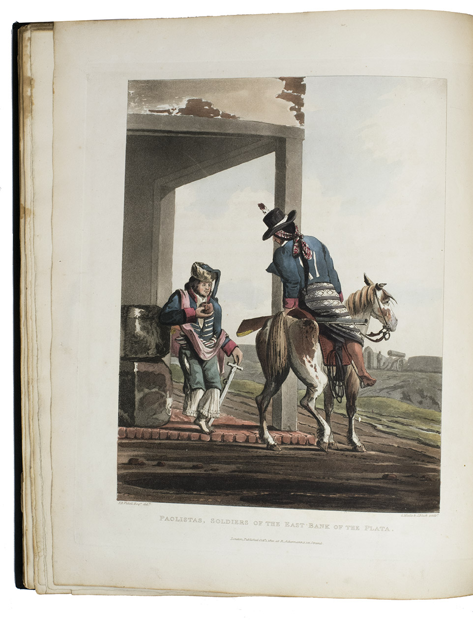 First printing of beautiful hand-coloured aquatint views of Argentina, all conceived and drawn from life by Emeric Essex Vidal in the years 1816 to 1818, accompanied by descriptions of the scenery, costumes and habits of the peoples and regions depicted. The plates were executed by various engravers between May and October 1820 and first issued in 6 monthly parts. 750 copies, including the present, were issued in Elephant 4to format. There was also an issue in Atlas folio and apparently a reprint in large and small 4to, still dated 1820, not normally distinguished in the literature from the present first printing (Palau and Sabin describe the work as a folio, but the Elephant 4to is often described as a folio). Tooley notes "the importance of its subject" and describes this publication as "the only notable colour plate book in English dealing with the Argentine".