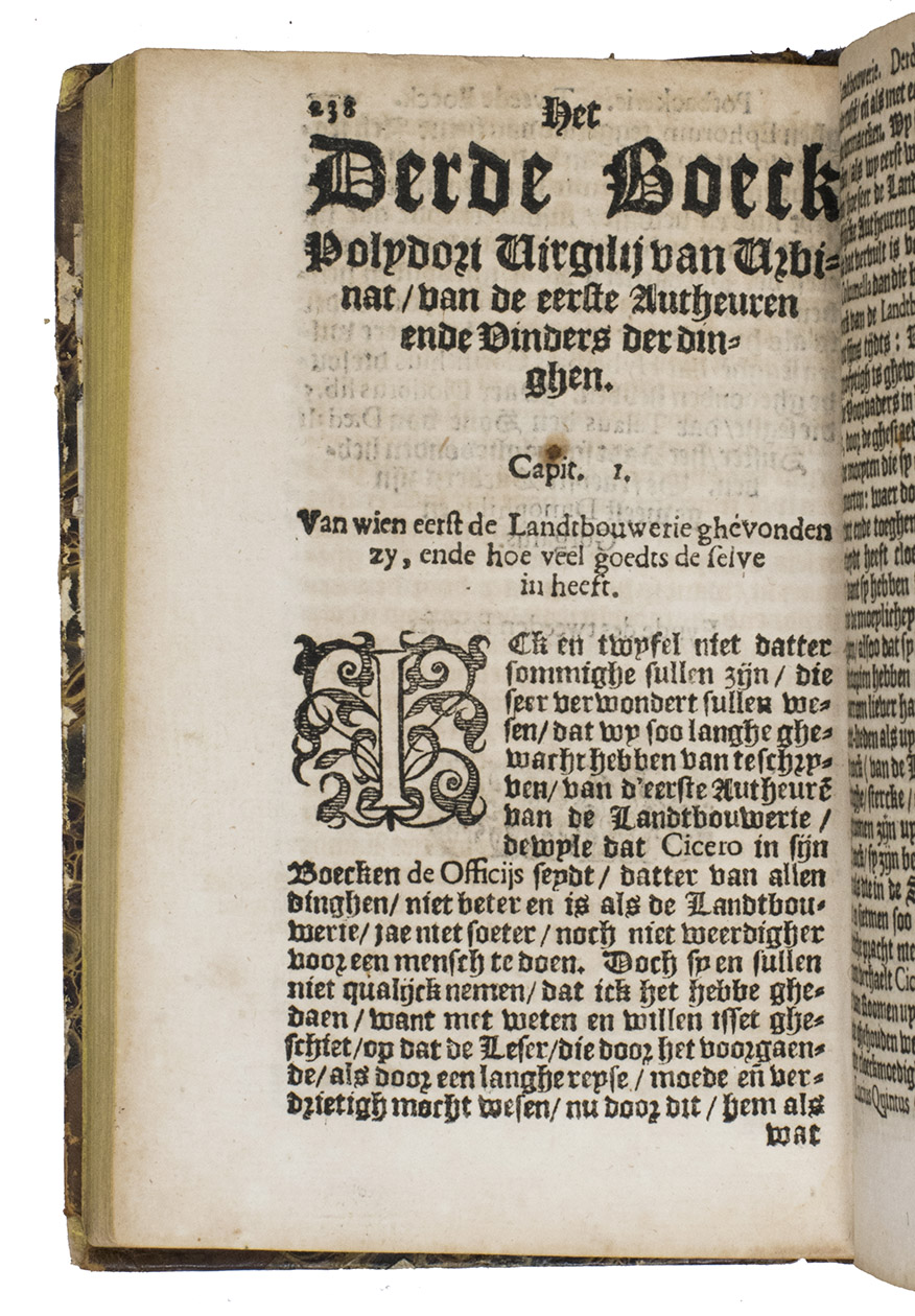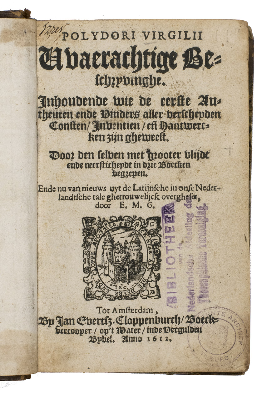 Rare first edition of the translation of the famous work by Italian humanist Polydore Virgil (ca.1470-1555, commonly Latinized as Polydorus Vergilius). He was born in Urbino but spent most of his life in early Tudor England. His most popular work, De inventoribus rerum (The invention of things; 1499), here in its original translation into Dutch, was the first comprehensive account of discoveries and inventions written since antiquity. A re-print appeared in 1663 (Amsterdam, Baltus de Wild for Arent van den Heuvel, 1663. 12mo). Thirty Latin editions of this work were published in Polydore's lifetime, and by the eighteenth century more than a hundred editions had appeared in eight languages.