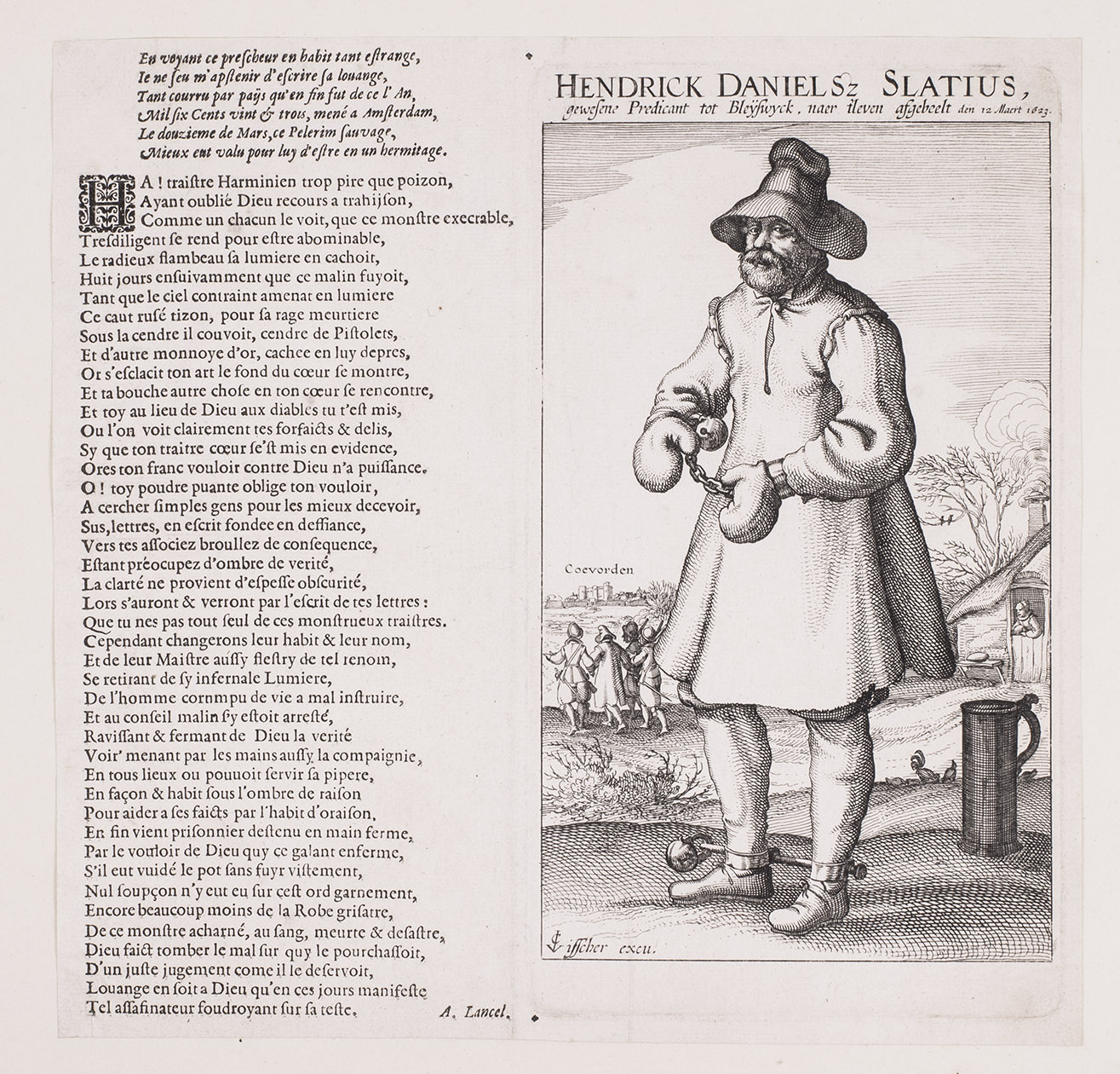 Engraved portrait of the Arminian preacher Hendrick Danielsz. Slatius (1585-1623), wearing handcuffs and the clothes of a farmer. Slatius was arrested (and later executed) as one of the conspirators in the failed attempt to assassinate Maurits of Nassau, Prince of Orange, in 1623. The print was issued with either Dutch or French poems at the left.