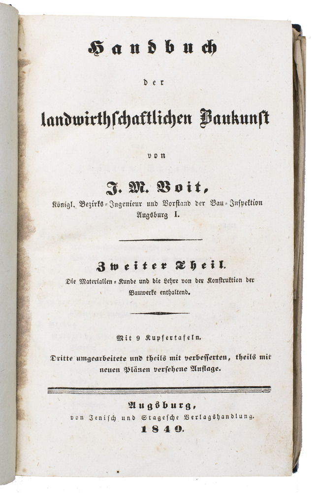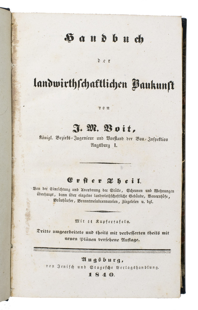 Third and best edition of an extensive manual on agricultural architecture, with additions in both the text and the plates. The work was written by Johann Michael Voit (1771-1846), royal engineer and building-inspector in Augsburg. The first volume concerns the architecture and furnishing of farms, stables, farm-outhouses etc, as well as the architecture of agricultural industrial buildings like breweries, distilleries, tile-works, brick-yards, etc. The second volume is entirely devoted to building materials and the practical construction of the buildings.
