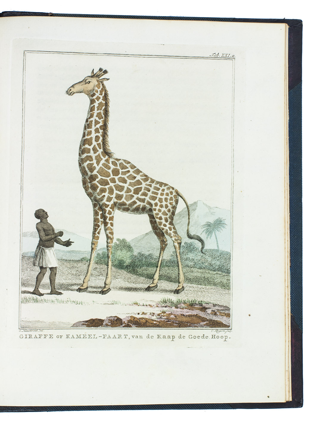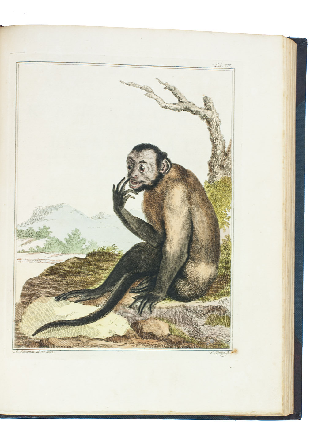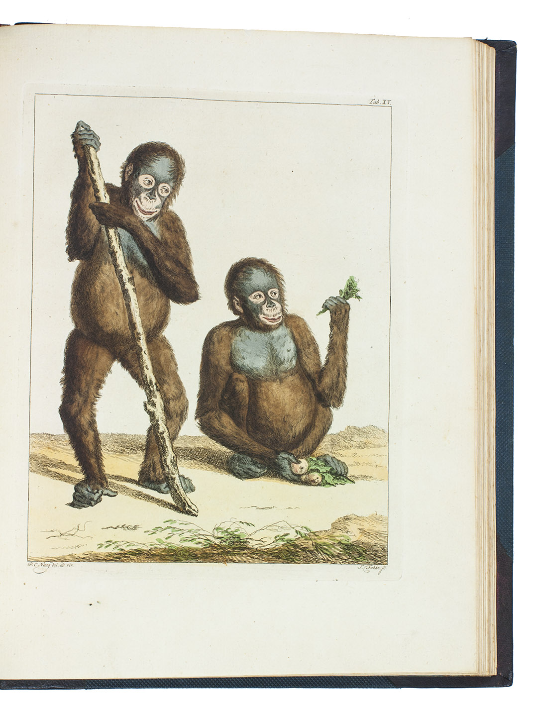 A collection of 31 separately published descriptions of exotic animals kept in the menagerie of prince William V. The animals were imported form the East and West Indies, North America, and Africa, and Vosmaer, director of the menagerie, describes some of them here for the first time. The collection consists of 20 papers on mammals, 8 on birds and 3 on reptiles. It "contains many type illustrations" and includes "a noteworthy description of the Orang-outang from Borneo, with two plates" (Wood). Most of the illustrations were engraved by Simon Fokke after designs by Aert Schouman.