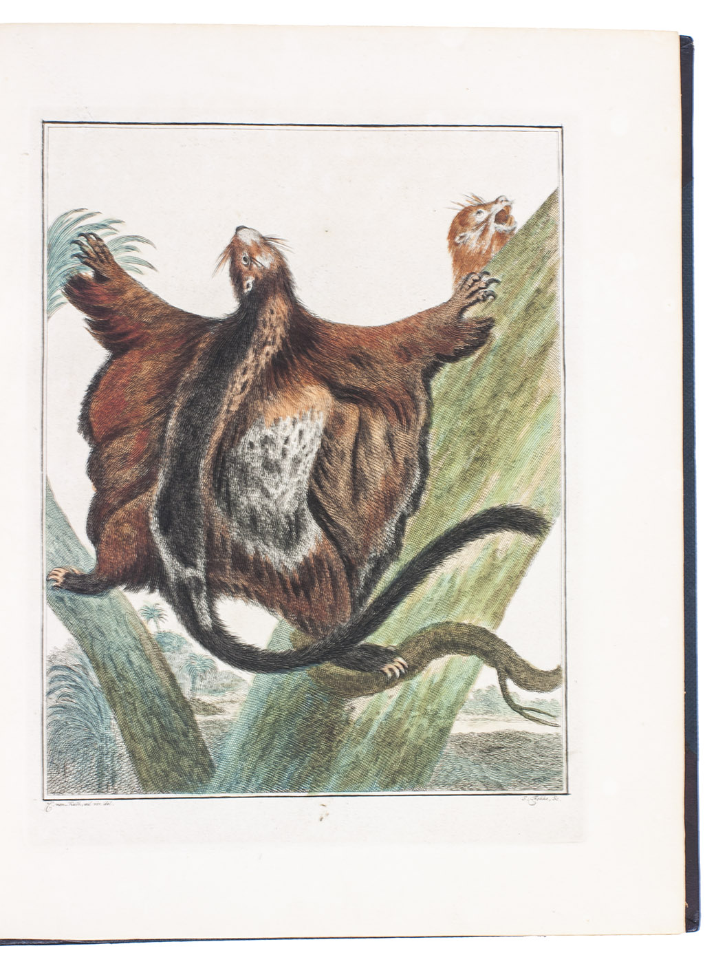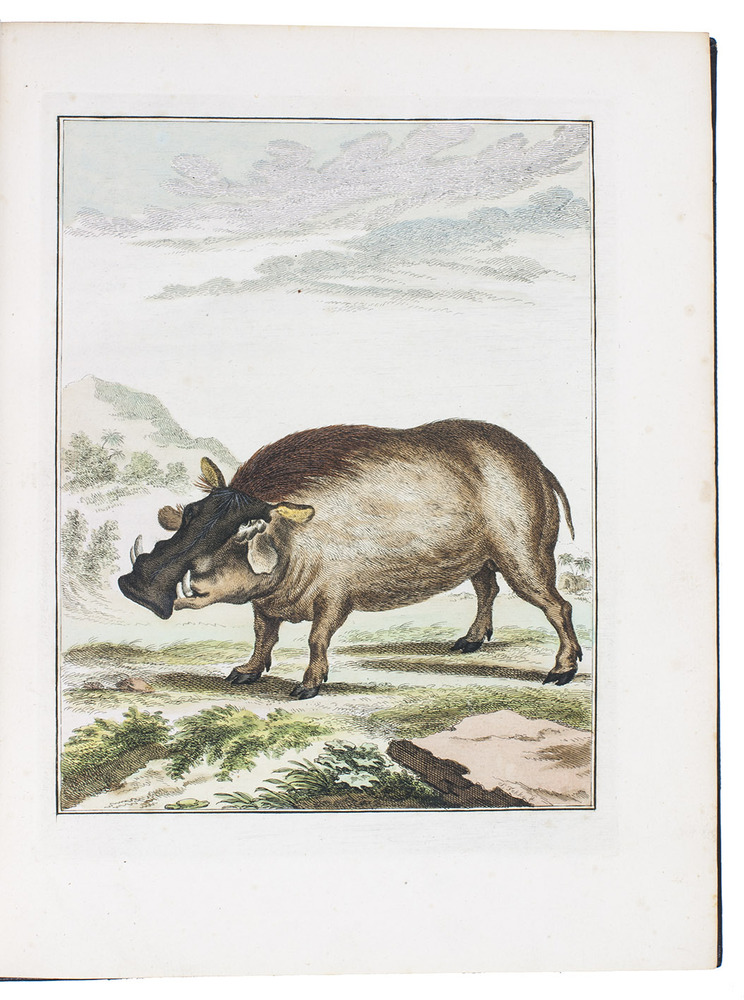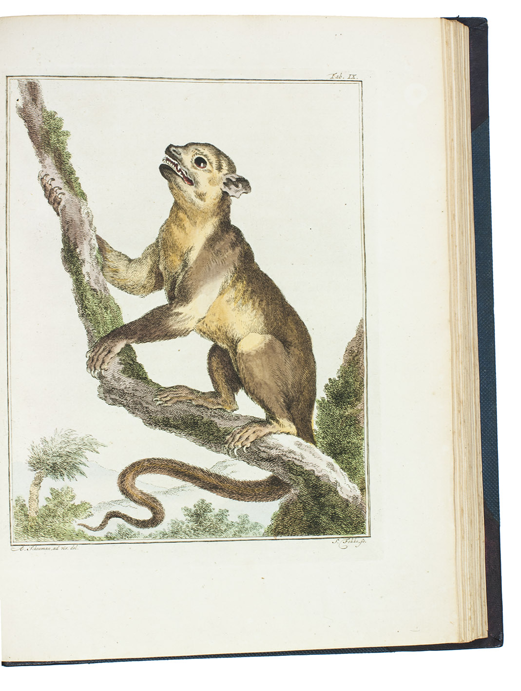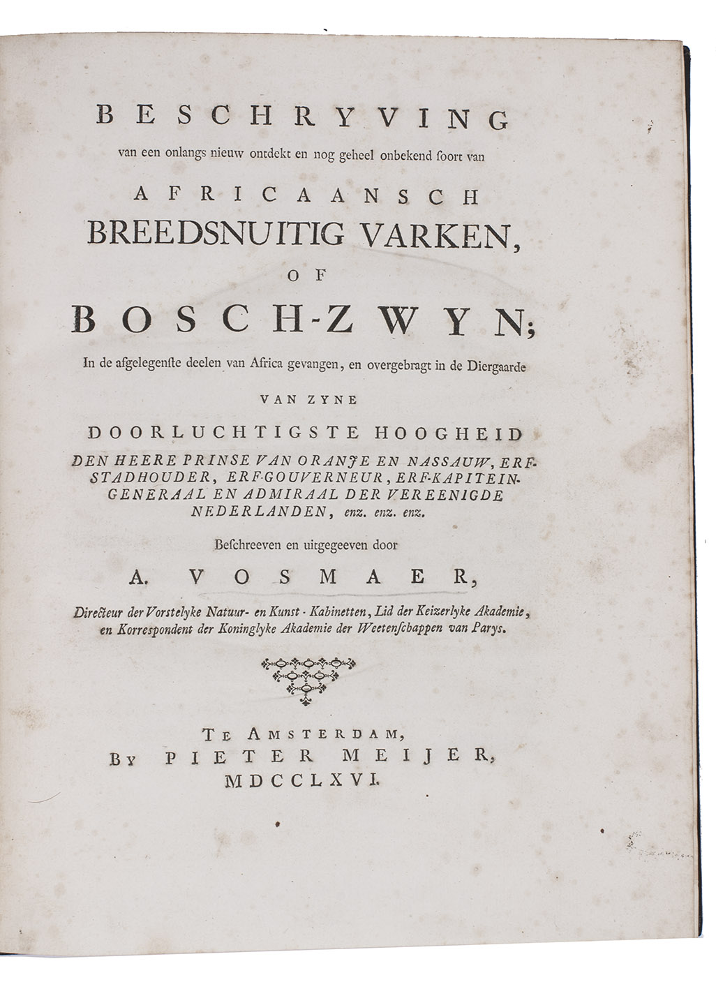A collection of 31 separately published descriptions of exotic animals kept in the menagerie of prince William V. The animals were imported form the East and West Indies, North America, and Africa, and Vosmaer, director of the menagerie, describes some of them here for the first time. The collection consists of 20 papers on mammals, 8 on birds and 3 on reptiles. It "contains many type illustrations" and includes "a noteworthy description of the Orang-outang from Borneo, with two plates" (Wood). Most of the illustrations were engraved by Simon Fokke after designs by Aert Schouman.