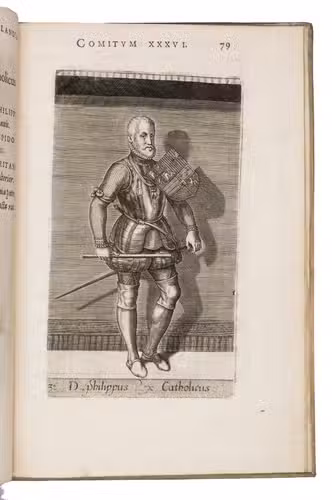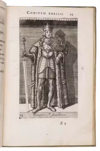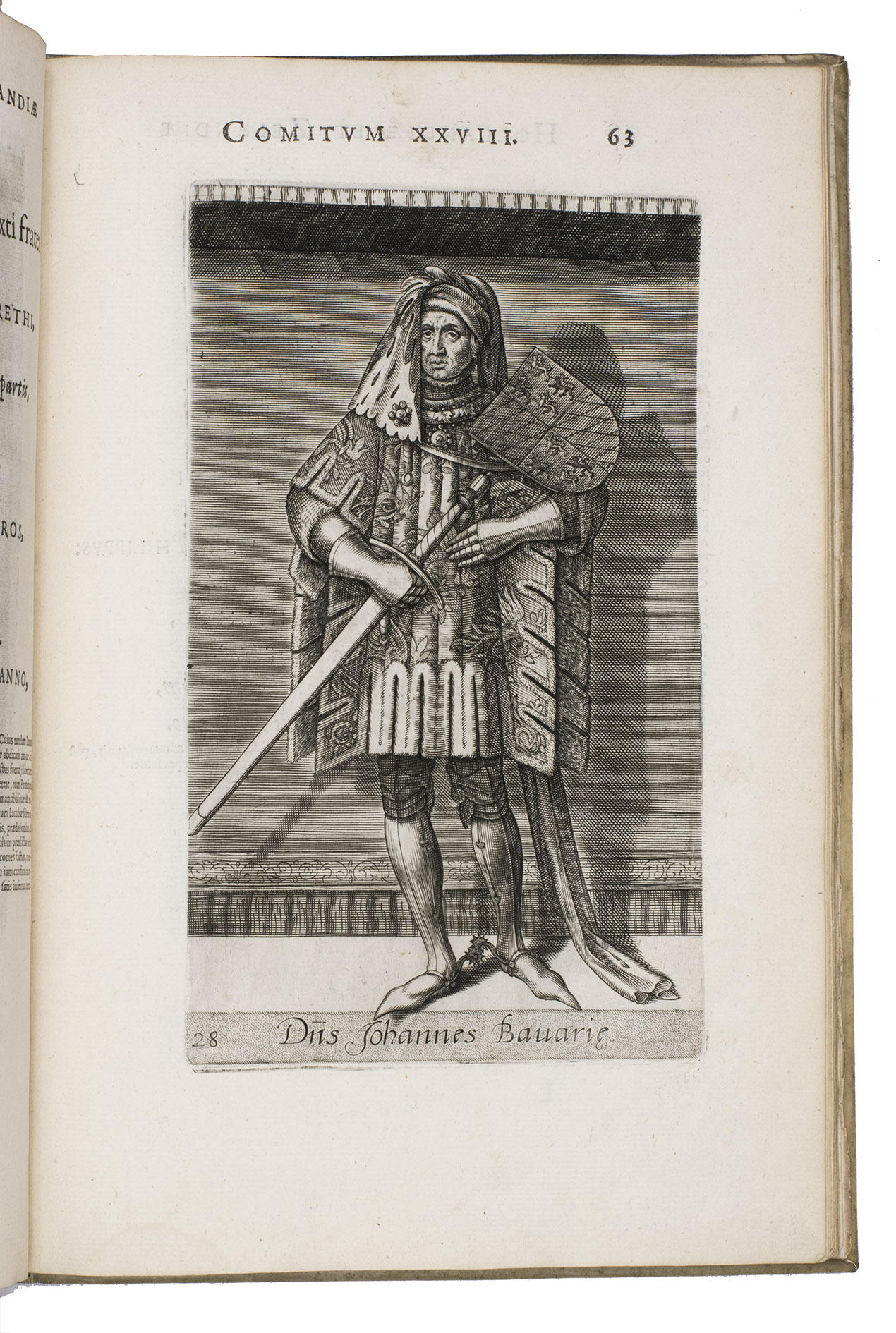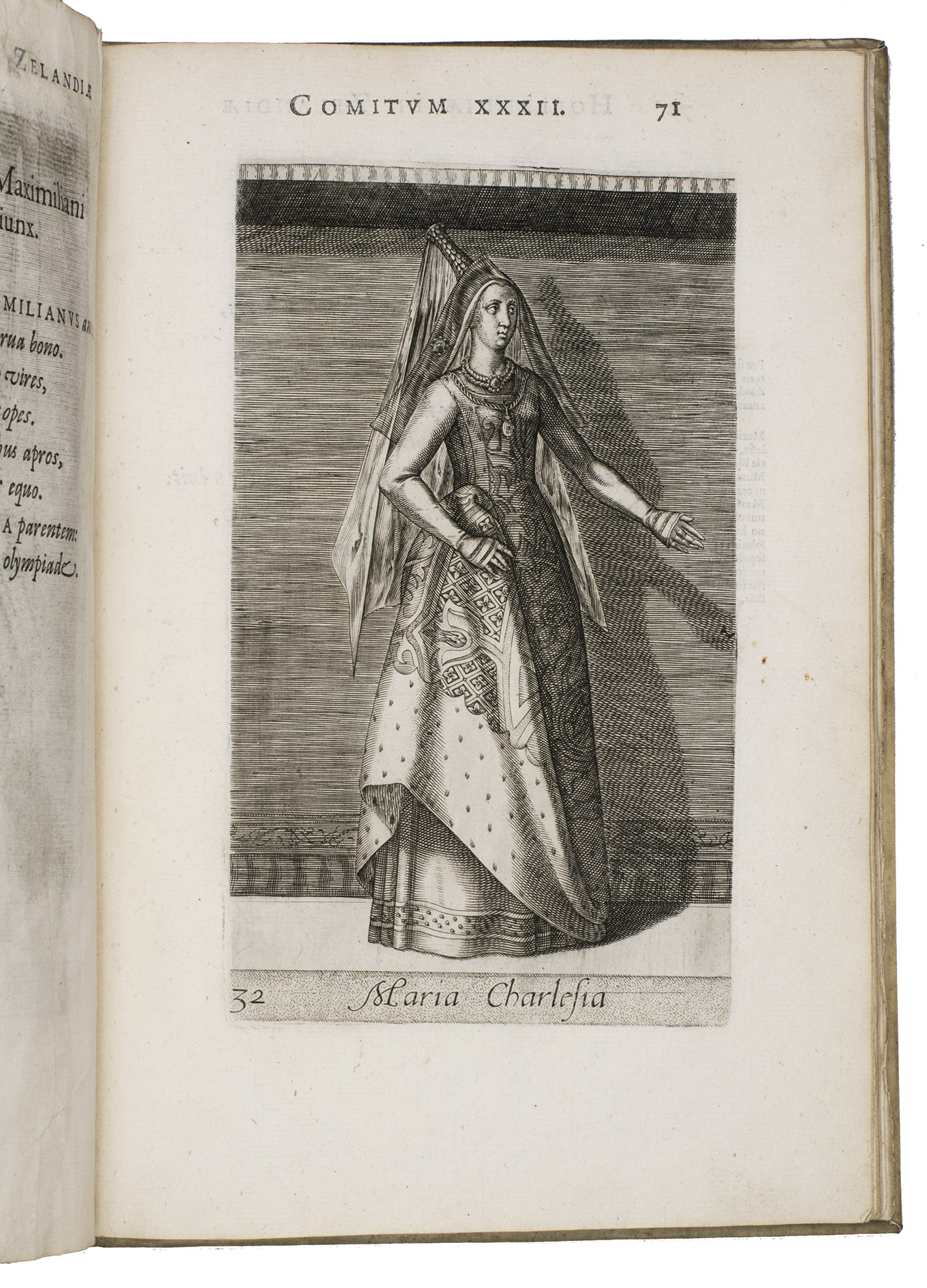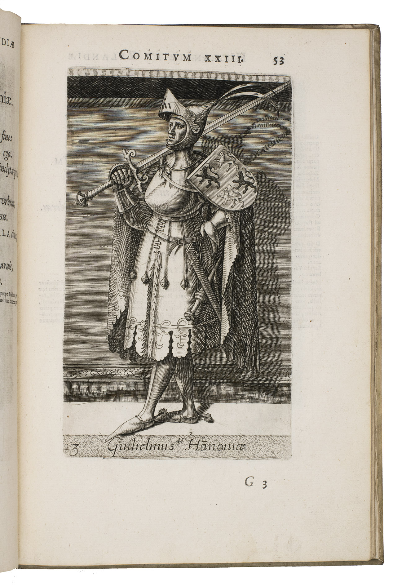 Collection of 36 portraits of counts of Holland, Zeeland, and Friesland, kings and emperors, described in Latin verses by the 16th-century lawyer Michiel Vosmeer. Among the nobles in this work are not only Philip of Burgundy and king Philips II of Spain, but also Jacoba van Beieren, countess of Holland, and Maximilian I, the Holy Roman Emperor. All noble men and women are depicted in an engraving facing the verses by the Dutch publisher and engraver Philipp Galle (1537-1612). Also included is a table with the counts of Holland and Zeeland from 903 to 1549.