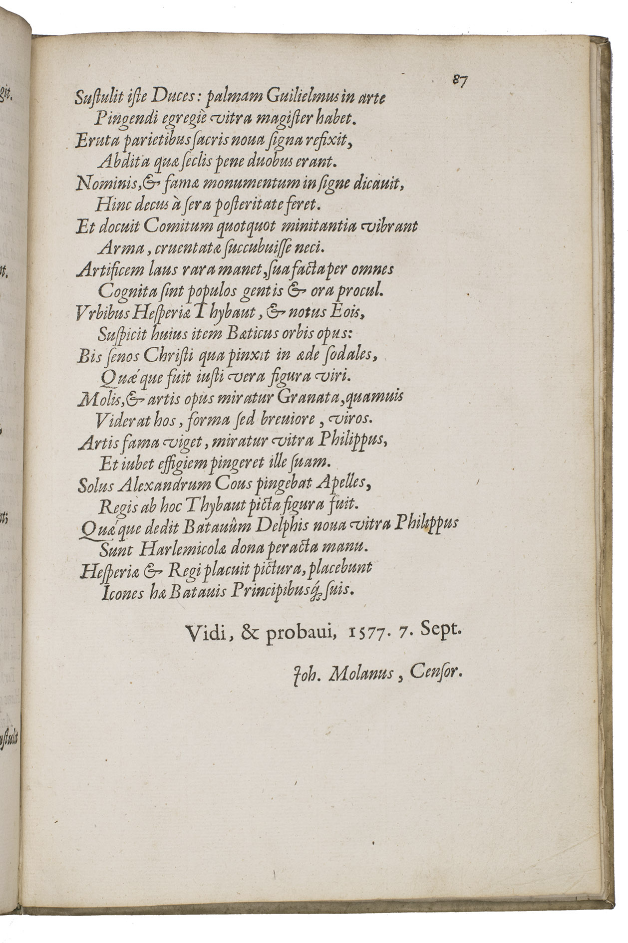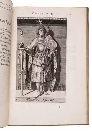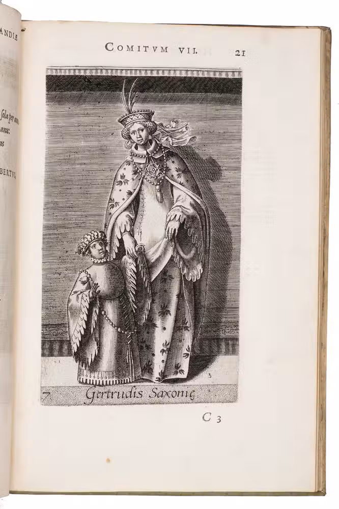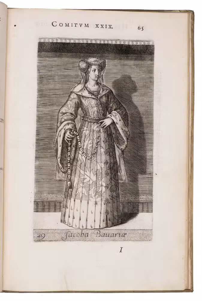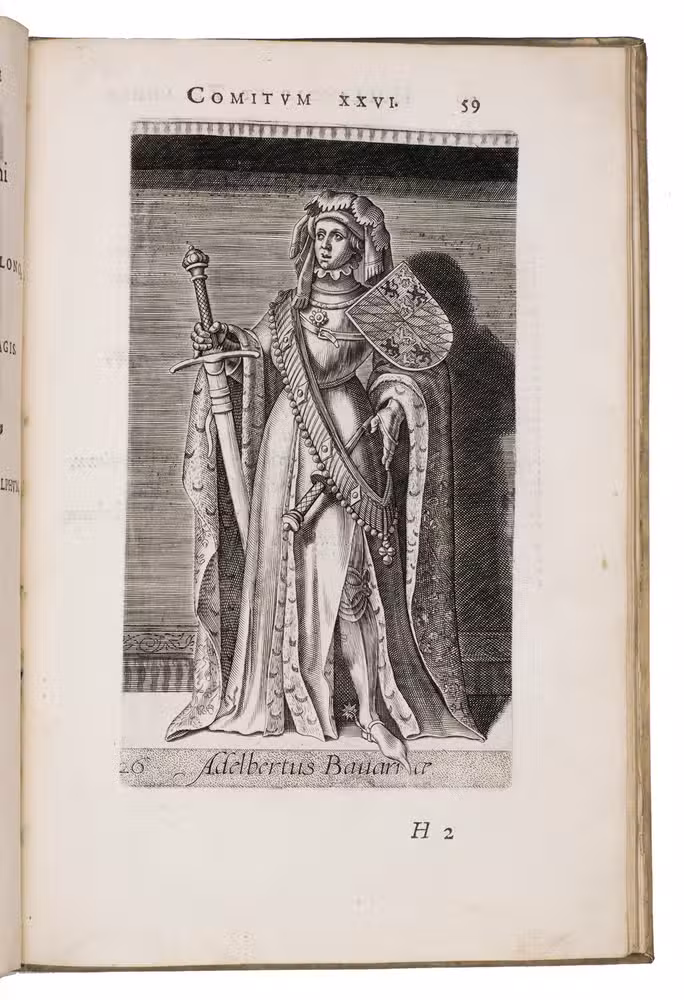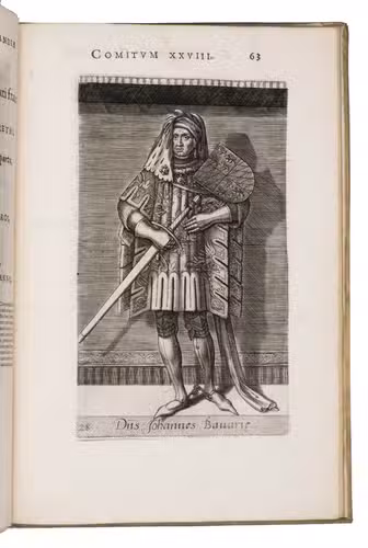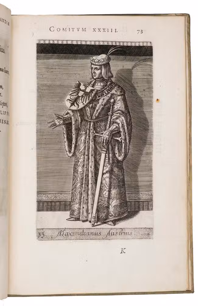 Collection of 36 portraits of counts of Holland, Zeeland, and Friesland, kings and emperors, described in Latin verses by the 16th-century lawyer Michiel Vosmeer. Among the nobles in this work are not only Philip of Burgundy and king Philips II of Spain, but also Jacoba van Beieren, countess of Holland, and Maximilian I, the Holy Roman Emperor. All noble men and women are depicted in an engraving facing the verses by the Dutch publisher and engraver Philipp Galle (1537-1612). Also included is a table with the counts of Holland and Zeeland from 903 to 1549.