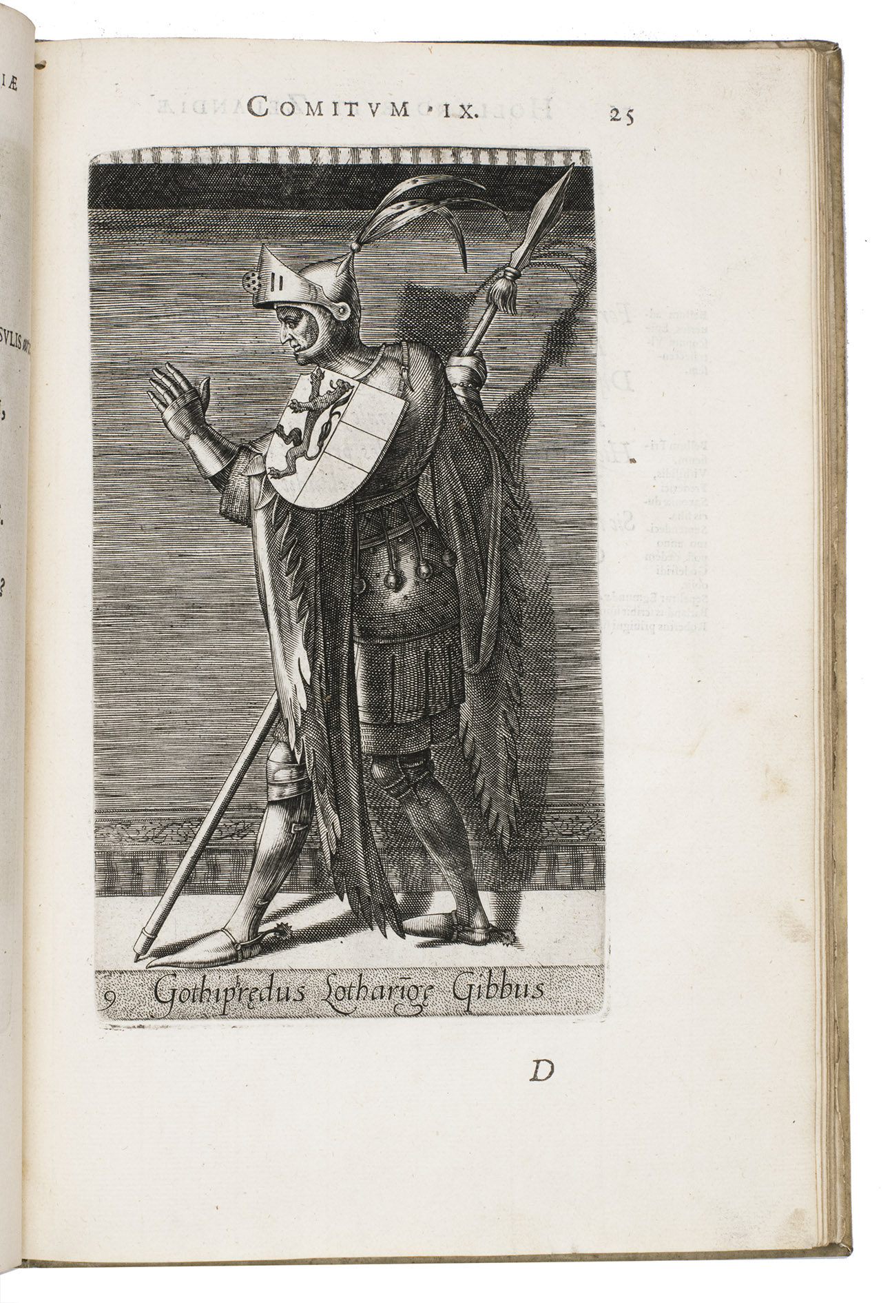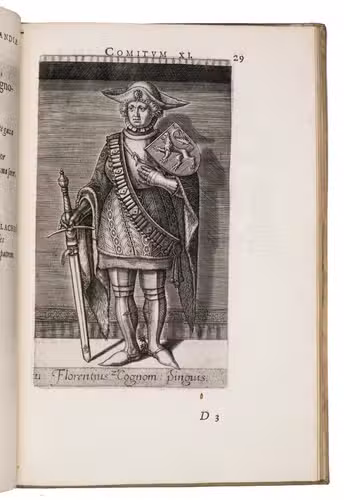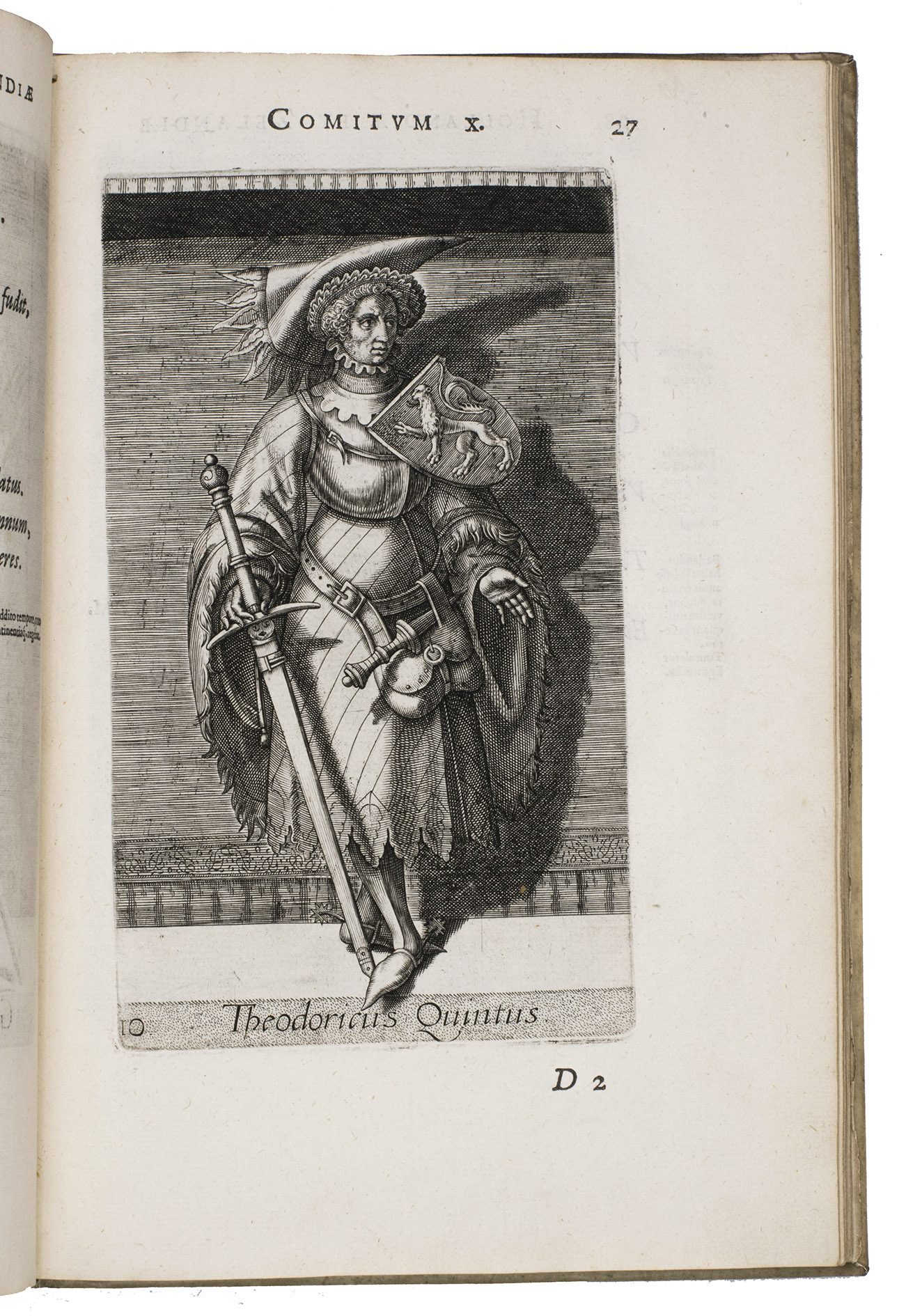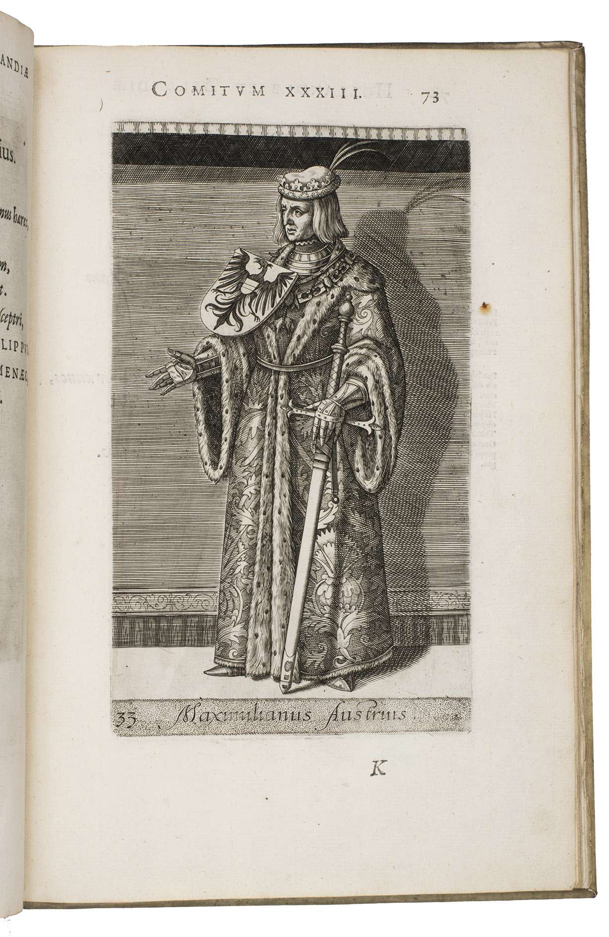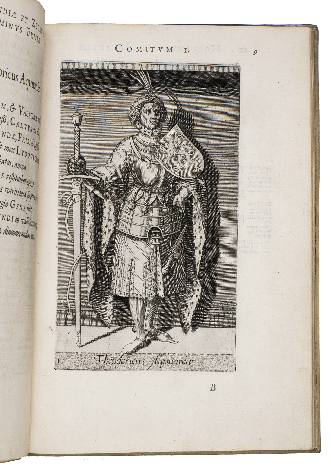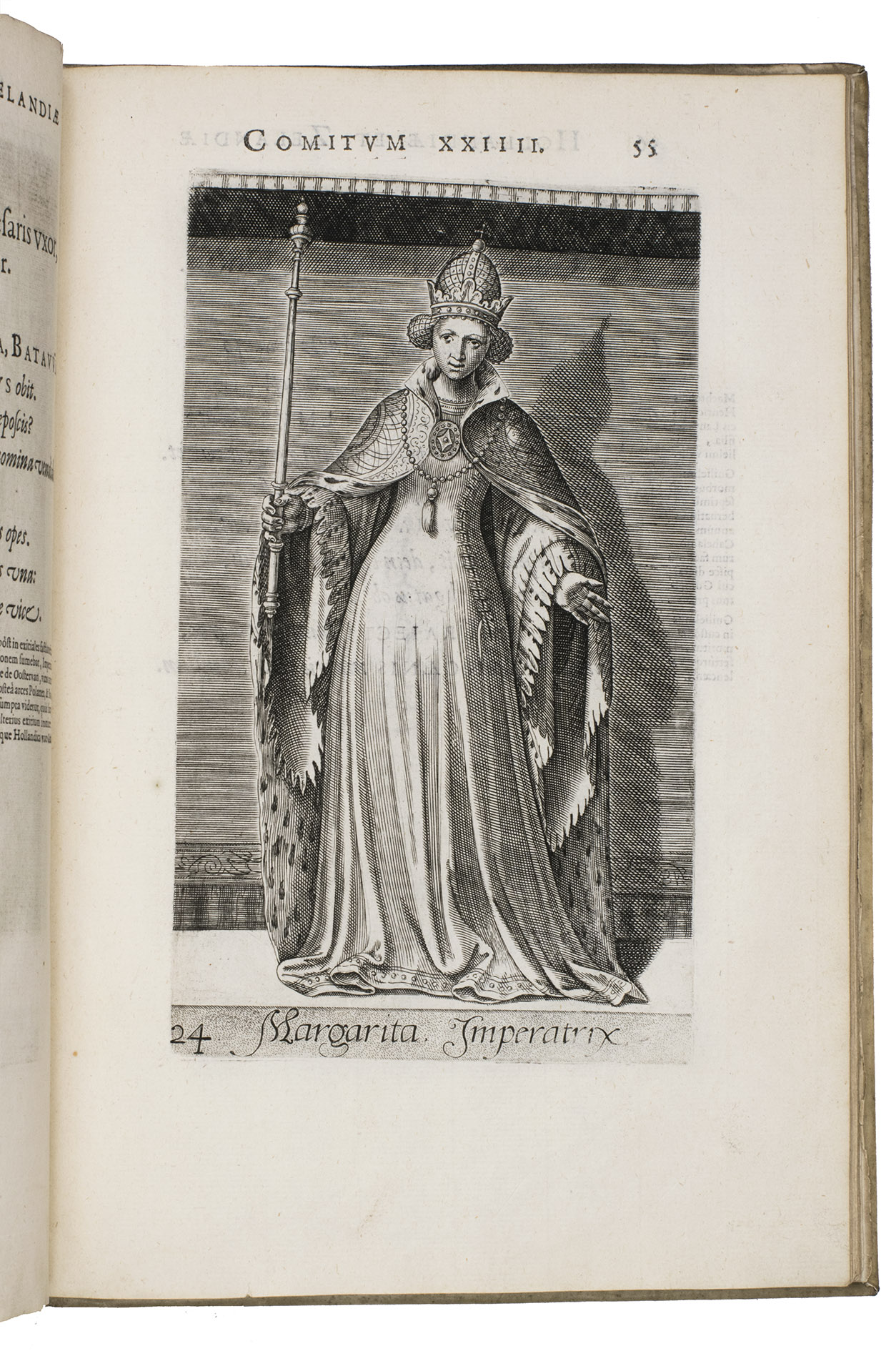 Antwerp, Christophe Plantin, 1578. Small folio. With an engraved title-vignette and 36 full-page engraved portraits of the counts of Holland, Zeeland, and Friesland, and international nobles by Philipp Galle . 17th century vellum, gold-tooled ornaments on the spine. 87, [1 blank] pp.