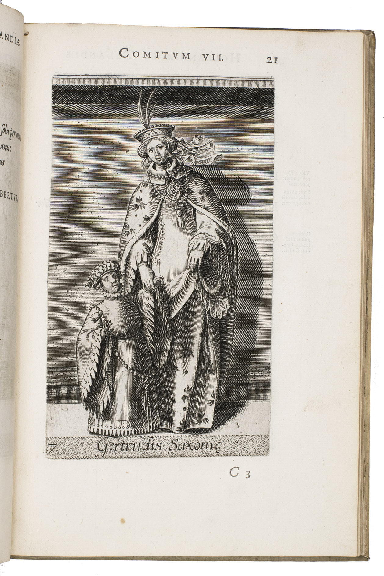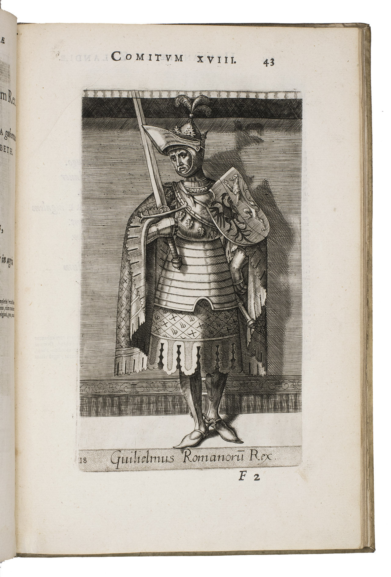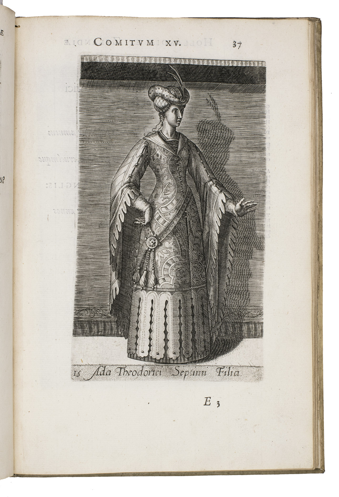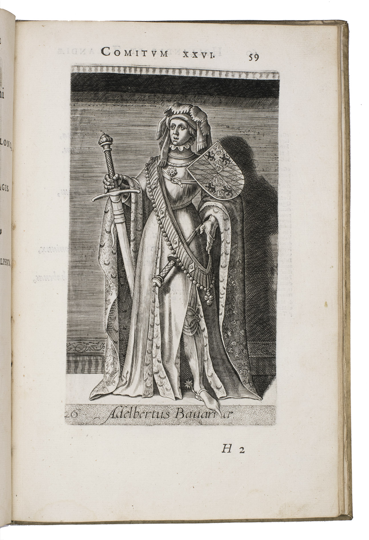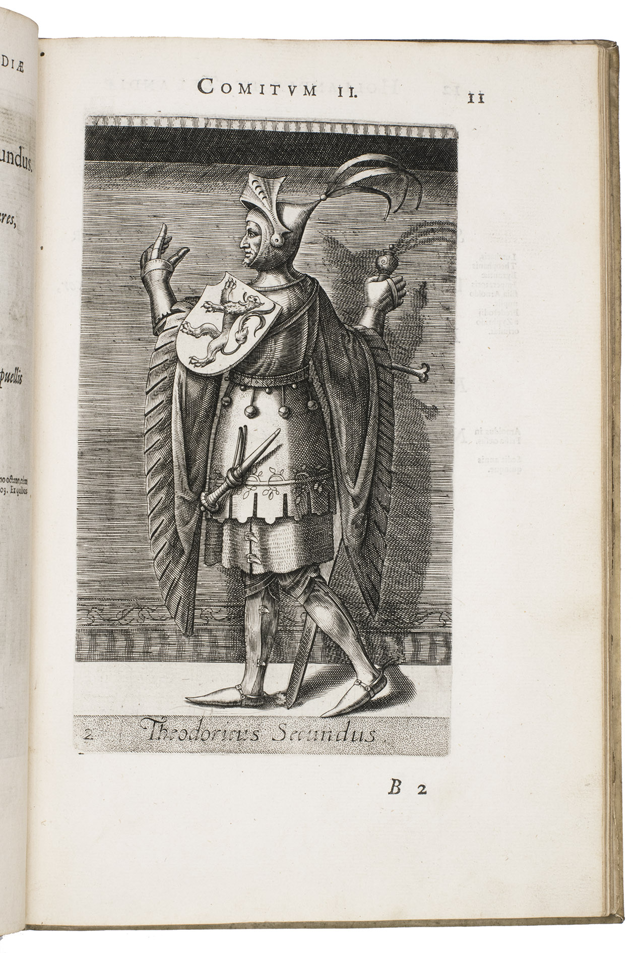 Antwerp, Christophe Plantin, 1578. Small folio. With an engraved title-vignette and 36 full-page engraved portraits of the counts of Holland, Zeeland, and Friesland, and international nobles by Philipp Galle . 17th century vellum, gold-tooled ornaments on the spine. 87, [1 blank] pp.