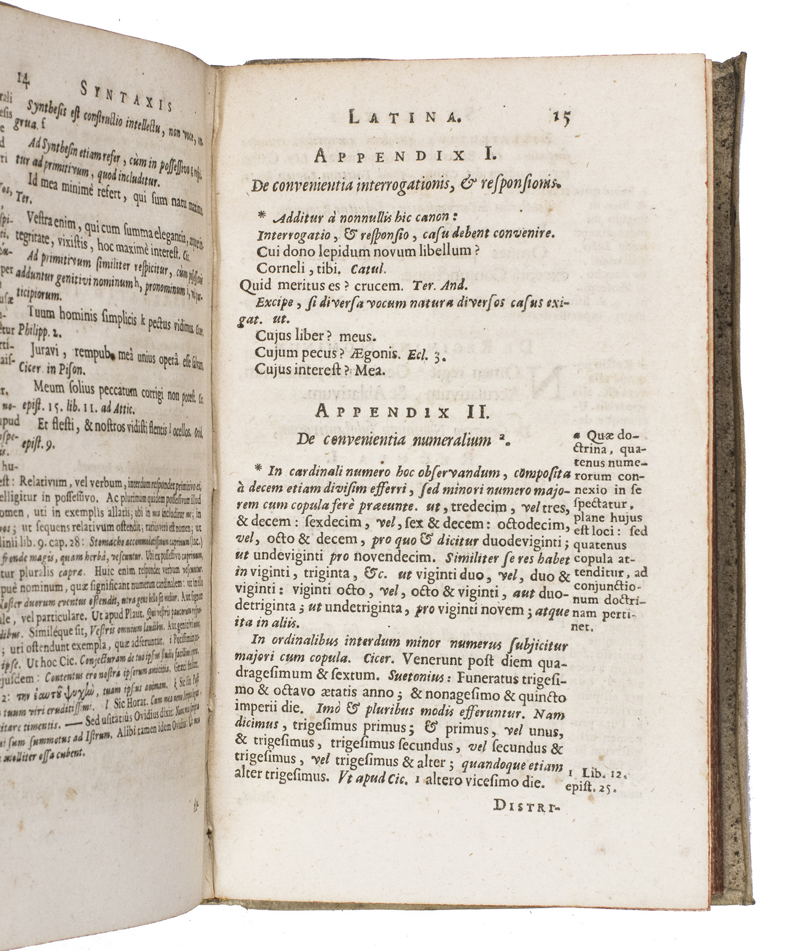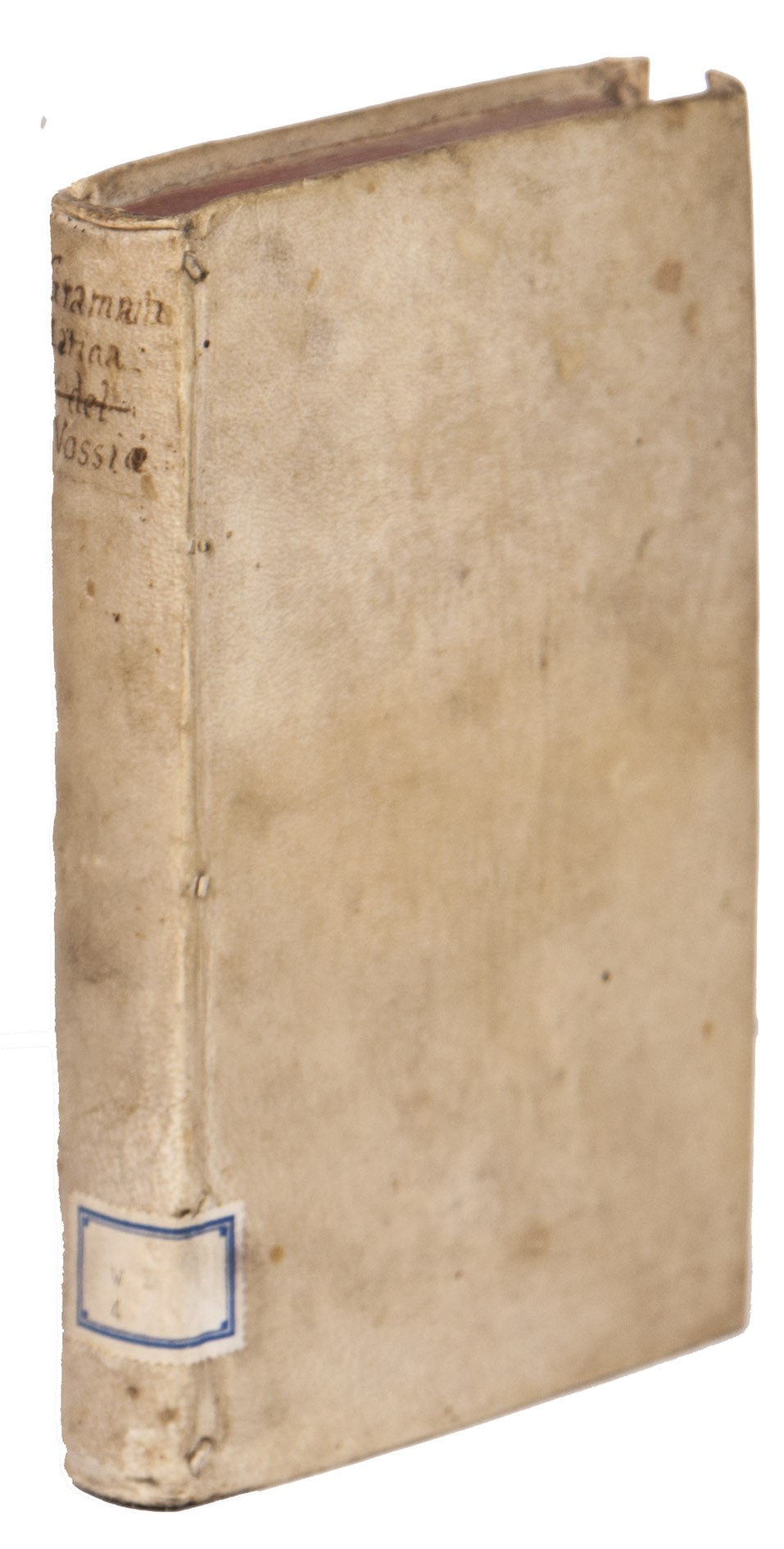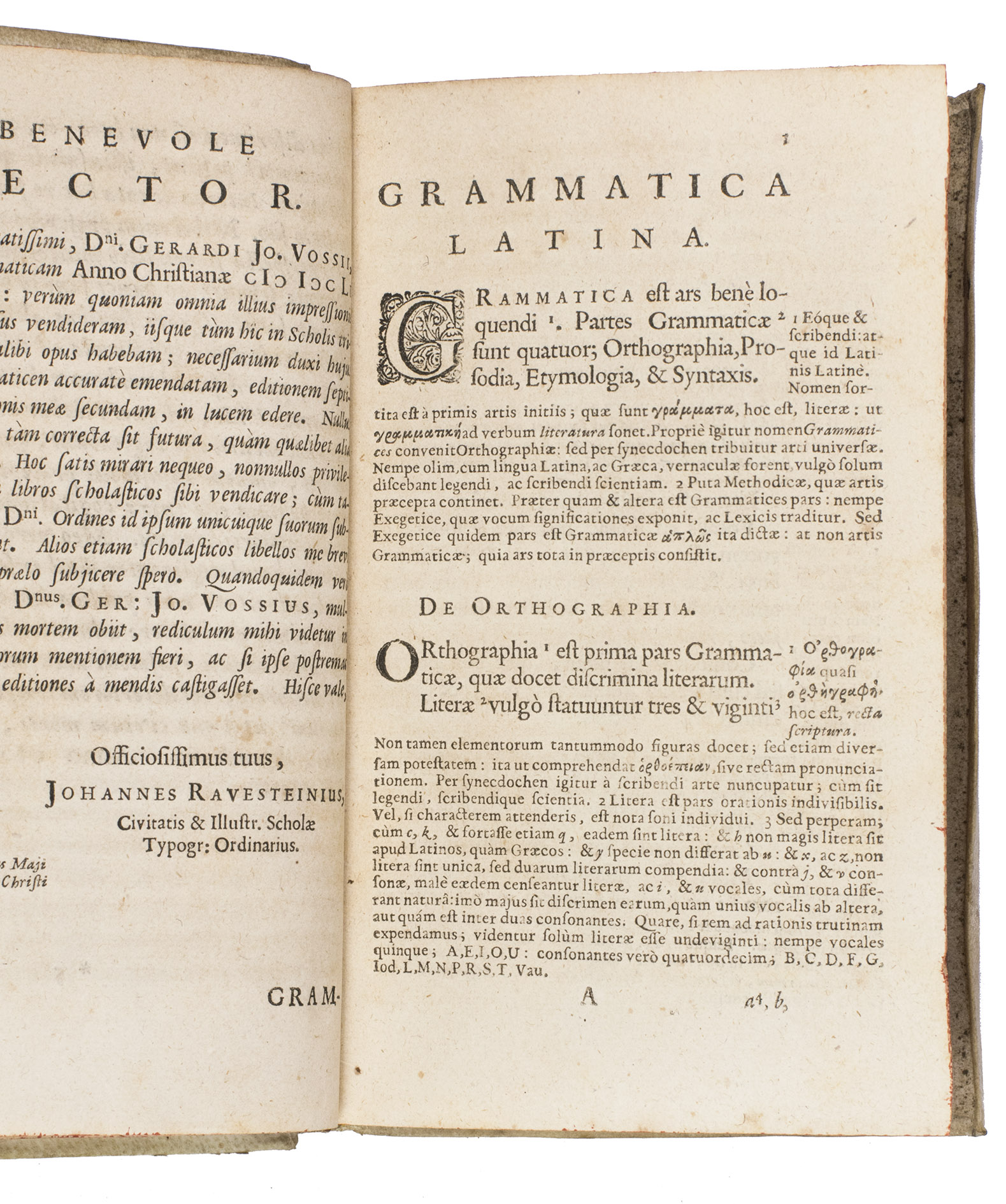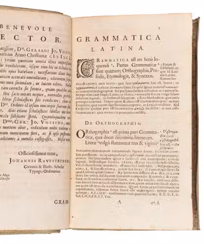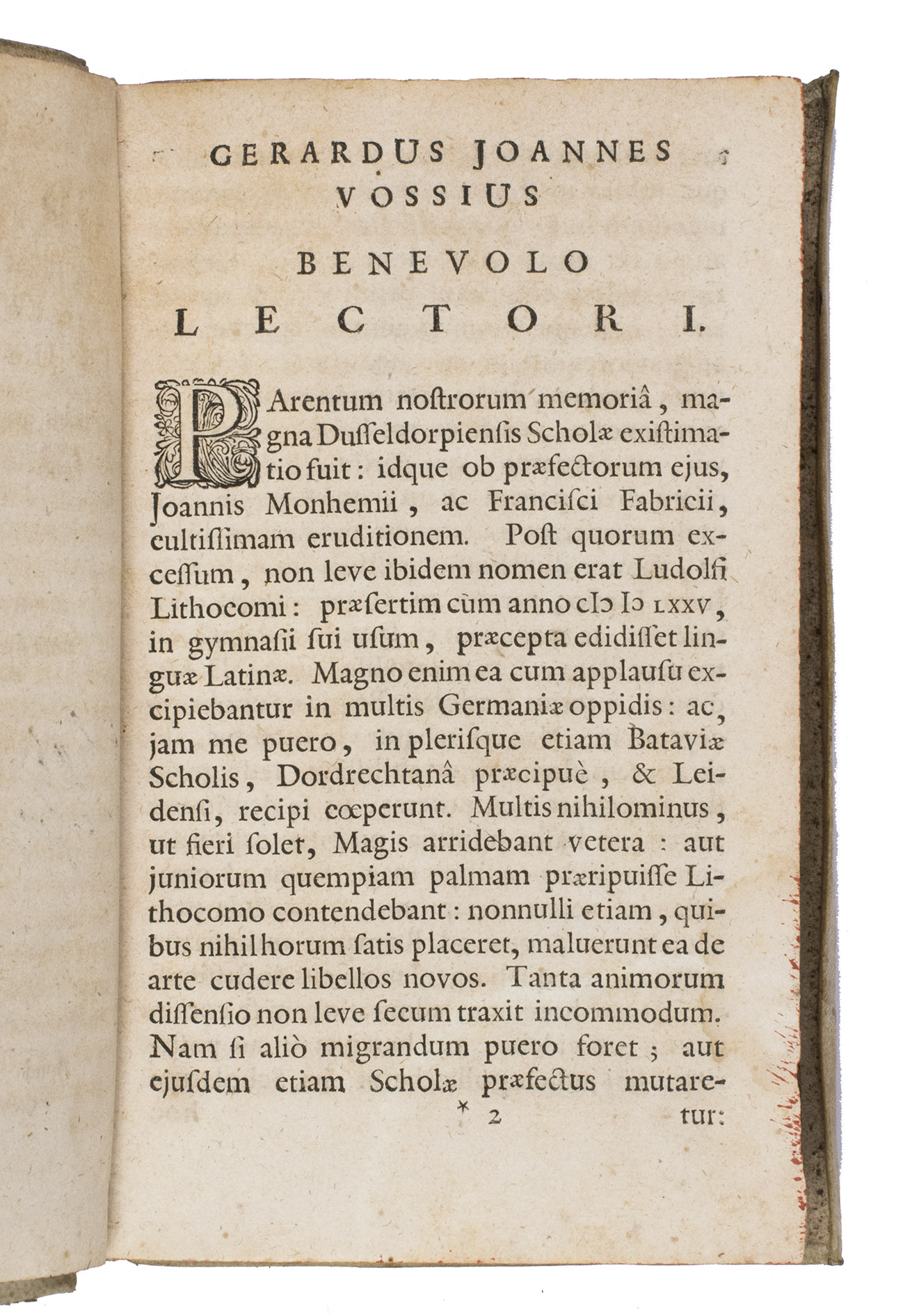Rare edition of the most popular work on Latin (school) grammar and syntax in the Northern Netherlands, first published in 1627, by the famous humanist scholar Gerard Vossius (1577-1649). It was based upon an earlier popular grammar by Lodewijk Dijkgraaf, in Latin Lithocomus, which Vossius himself had used in his schooldays, and still had to use again when teaching at the Latin School at Dordrecht. So he started to purge the worst defeciencies in Dijkgraaf's grammar, and published the first edition in 1626. However, Vossius was not satisfied with this version either, and until the end of his life he continued to rework his grammar. Finally in 1649 he published the fifth edition, which he himself judged now to be perfect, calling it the "editio princeps". With his Latin grammar Vossius made a major contribution to reforming education at the Latin Schools.