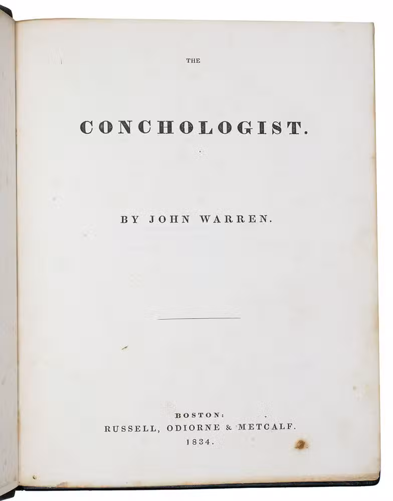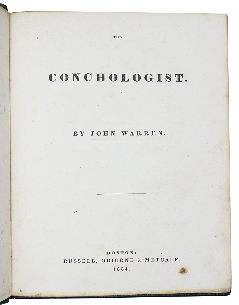 Rare first edition of the first American conchological manual, following the classifications of both Linnaeus and Lamarck. Warren gives an introduction discussing shells and their beauty, the three classes and the several conchological genera in them, including their scientific names. He describes not only the shells, but also where and when one could find them. John Warren was an Englishman who sold shells and other curiosities in Boston and to collectors elsewhere in the United States, supplying them with handsome shells at high prices.