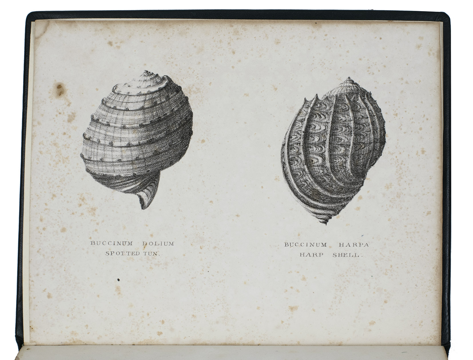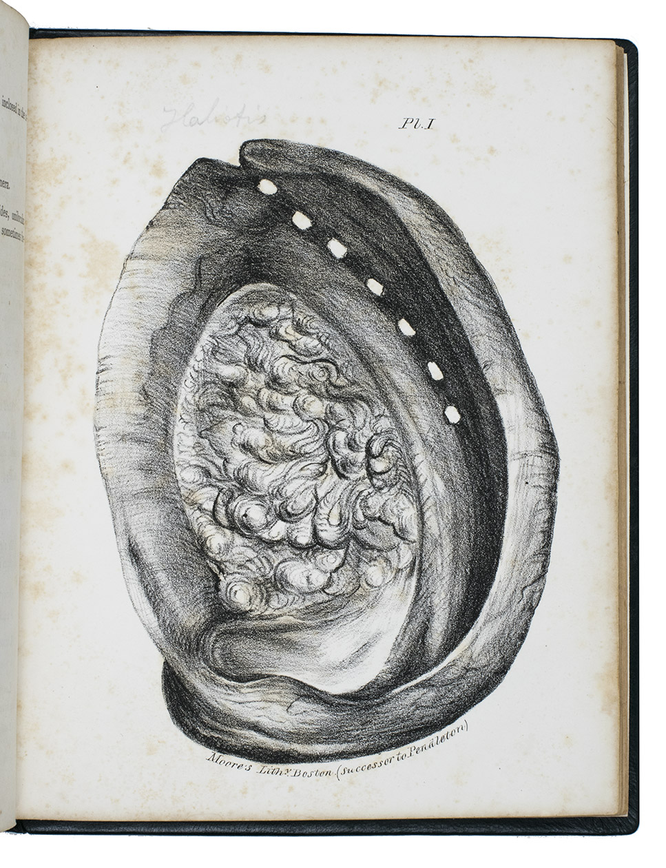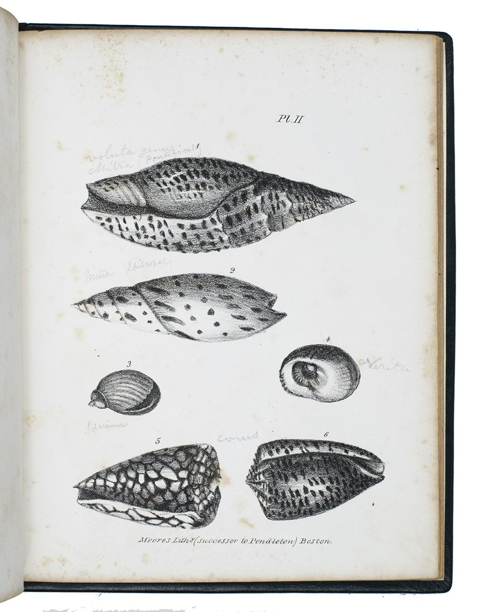 Boston, Russell, Odiorne & Metcalf, 1834. Small 4to. With a lithographed frontispiece showing 2 shells and XVI numbered lithographed plates of shells and related items showing 71 figures. Modern (21st-century?) green calf. [4], 204 pp.