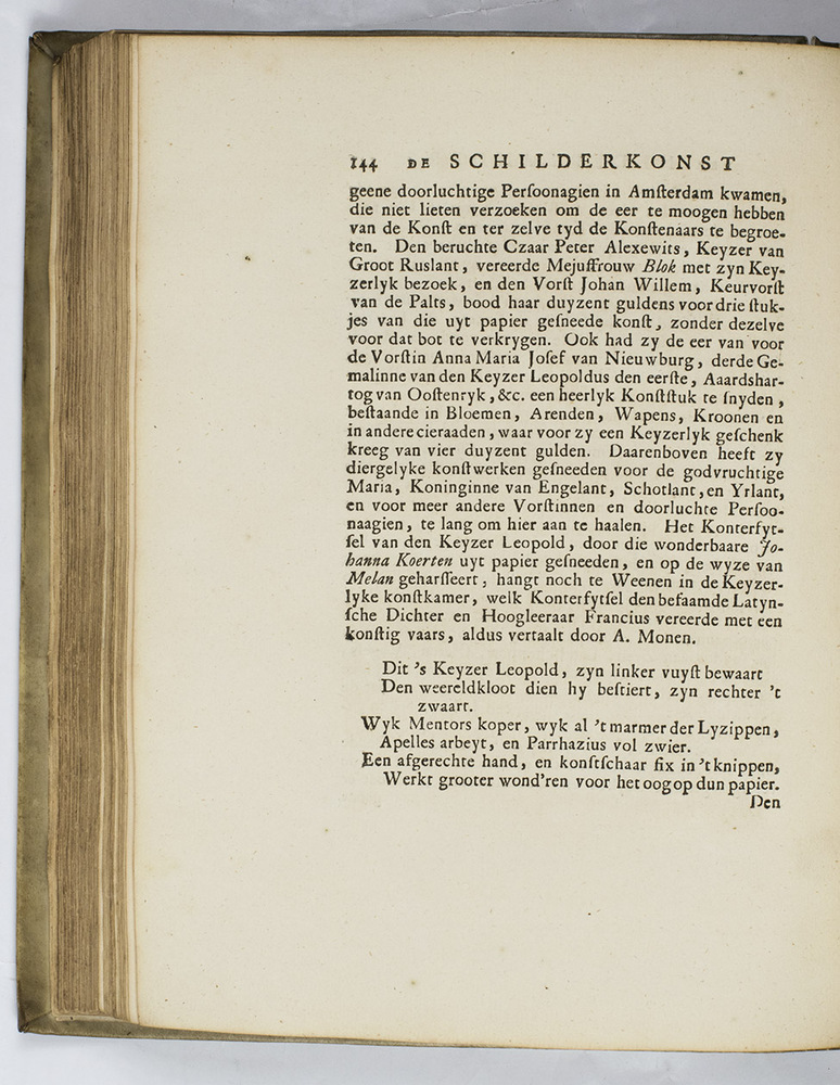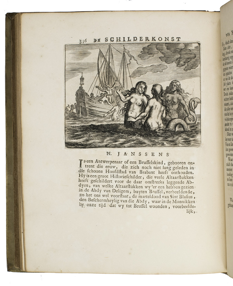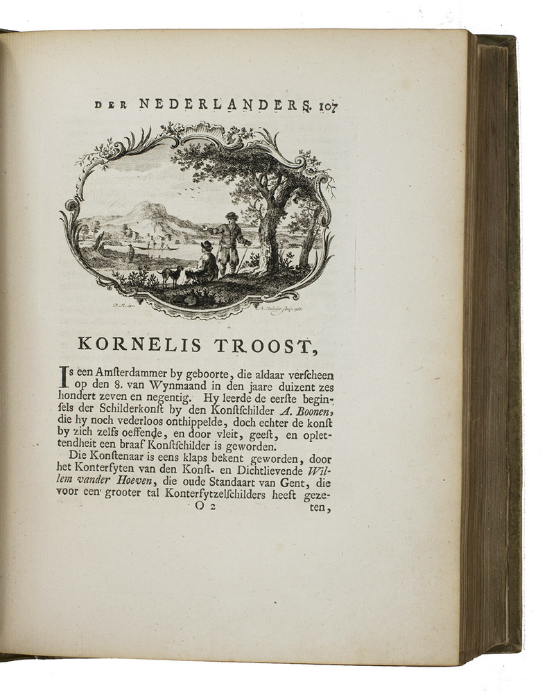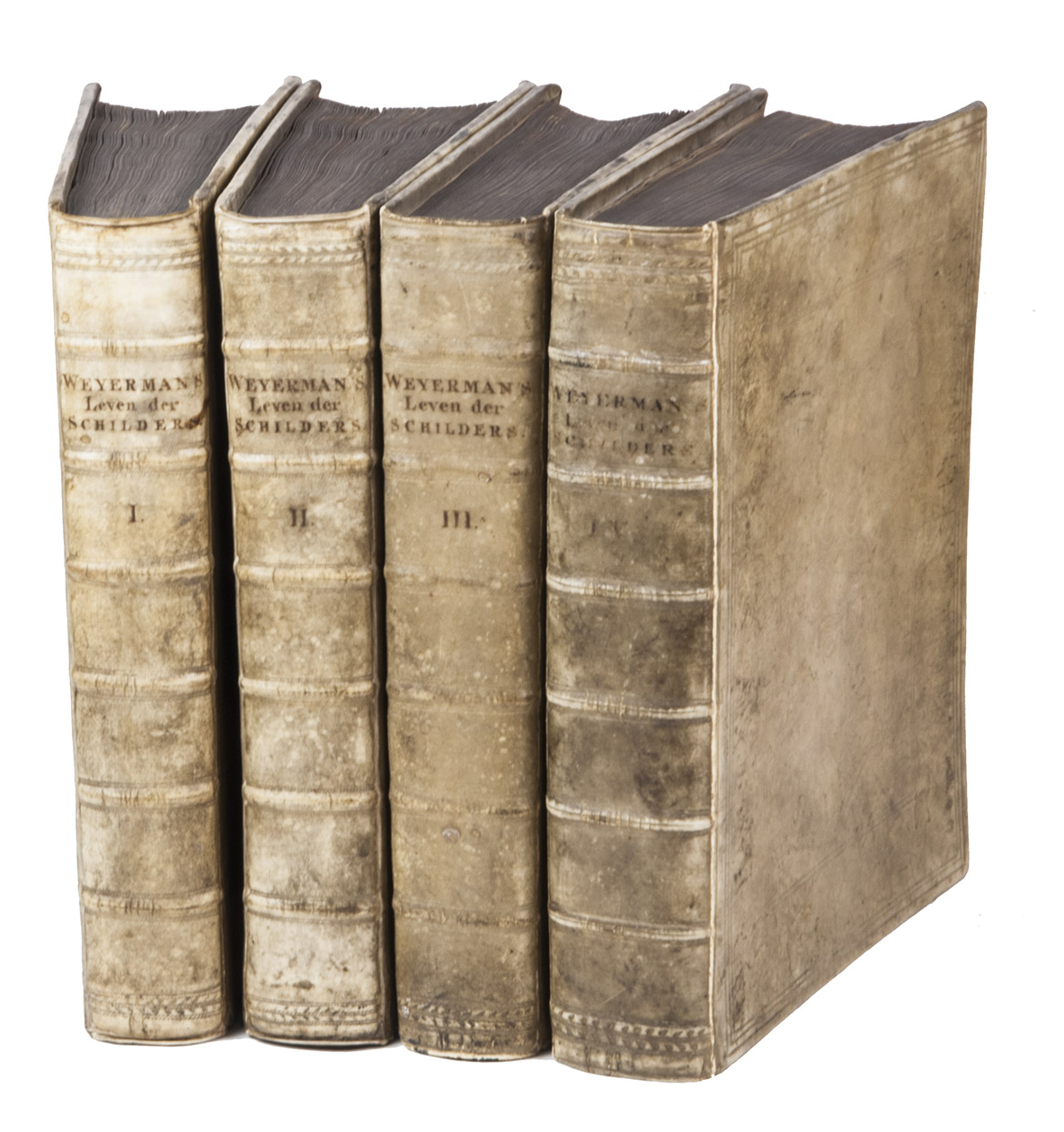 First edition of richly illustrated biographies of more than 100 Dutch painters, male and female, still of interest for the history of Dutch art. The author, Jacob Campo Weyerman (1677-1747), was one of the foremost Dutch authors of the Enlightenment and was known for his merry style. For this history of Dutch art, he leans on Houbraken's De groote schouburgh der Neder-lantsche konstschilders en schilderessen (1718-1721).