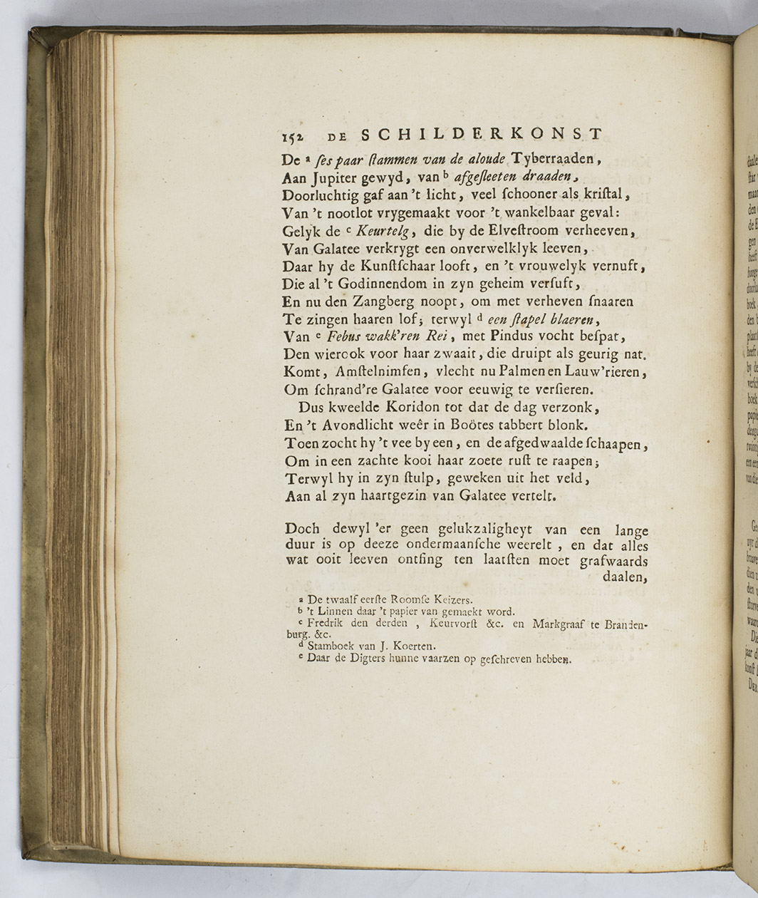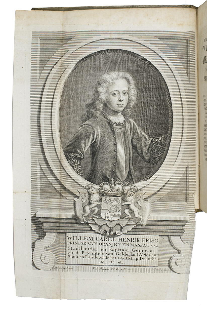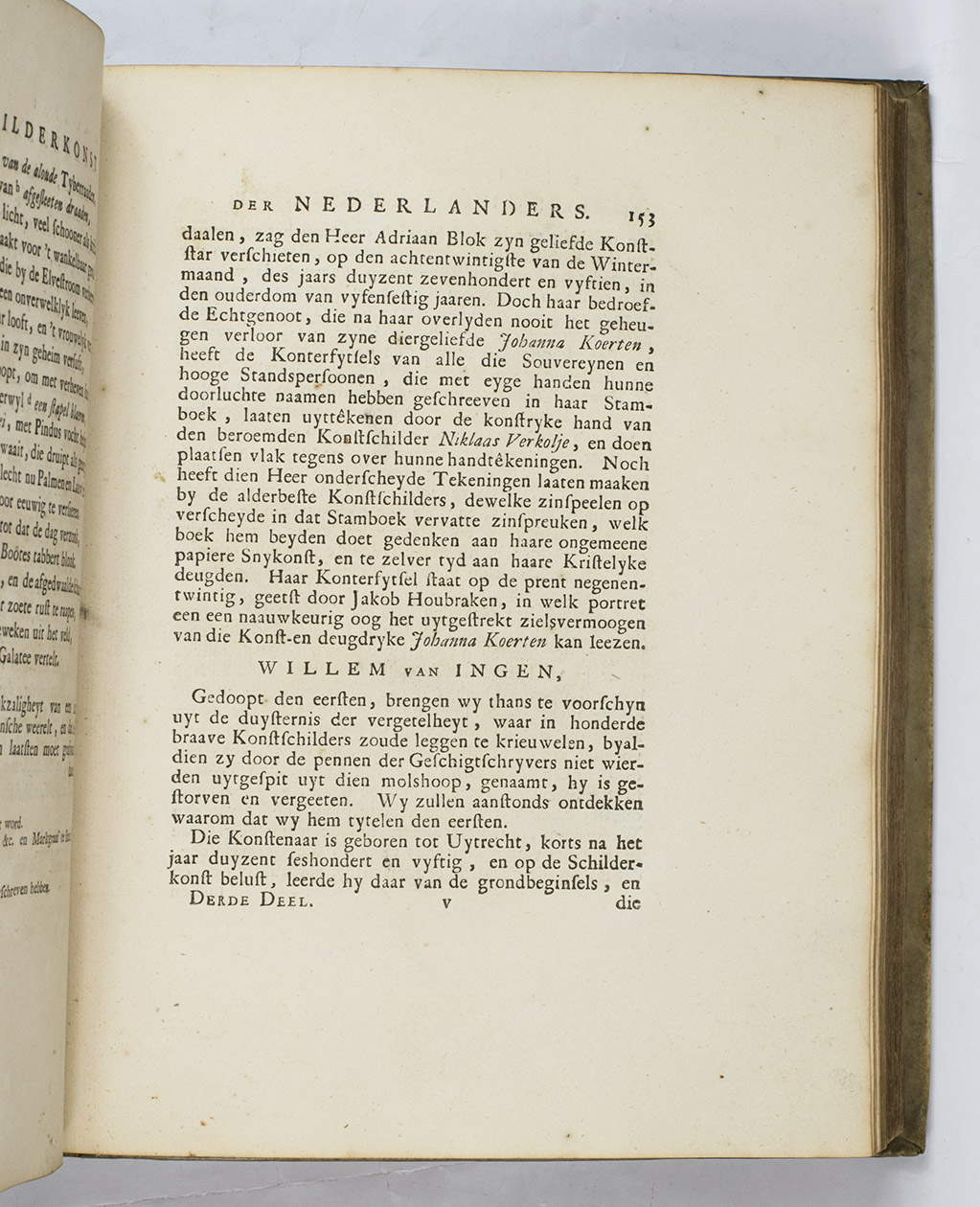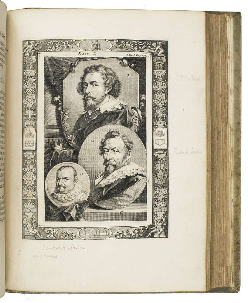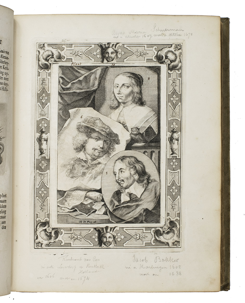 The Hague, widow of E. Boucquet, H. Scheurleer, F. Boucquet, J. de Jongh, 1729 (vols. 1-3); Dordrecht, Ab Blussé & son, 1769 (vol. 4). 4 volumes. 4to. With an engraved frontispiece, title-pages in red and black and with engraved vignettes, a folding portrait of Willem Karel Hendrik Friso (1711-1751), Prince of Orange and from 1747 hereditary Stadtholder Willem IV, a portrait of the author, 40 engraved plates by Houbraken with multiple portraits of artists on each plate, 1 plate with a night scene, 1 mezzotint and 118 engraved vignettes. Contemporary blind-tooled vellum with manuscript titles on spines. Sprinkled edges. [16], 412, [6]; [4], 412, [6], [4], 446, [4].